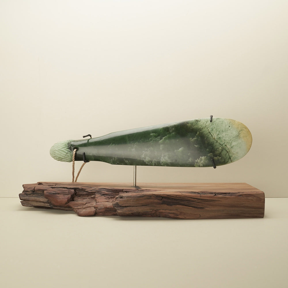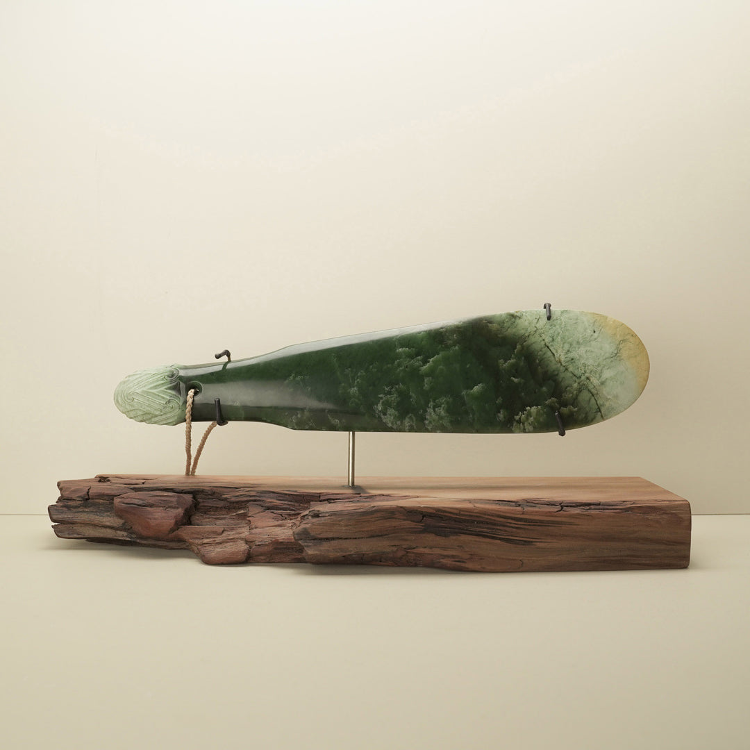 Carving a mere has always required patience, strength, and respect. Traditional Māori carvers often worked from river-worn boulders, stone already smoothed by the elements. From there, the blade was slowly ground and polished, revealing a deep green lustre that spoke of mana and prestige.