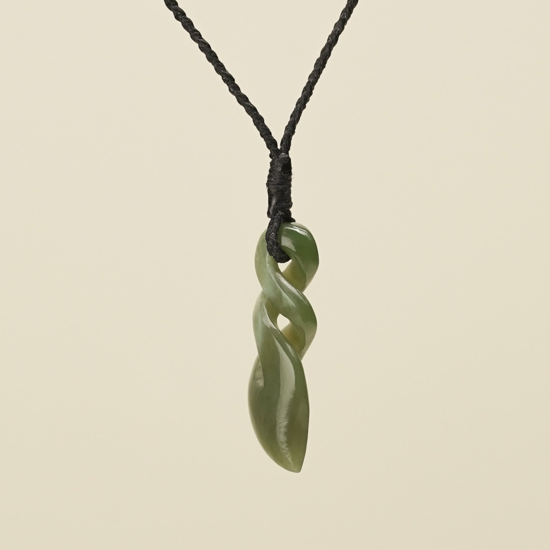 Symbolising intertwined lives, this small double twist pendant is carved from New Zealand Kahurangi greenstone with a unique stylised point. It represents enduring connections between whānau, groups, or multiple individuals, reflecting lasting bonds of friendship, love, and shared experiences. The pendant includes an adjustable black handwoven cord and is presented in an eco-friendly box with cards detailing its meaning and care.