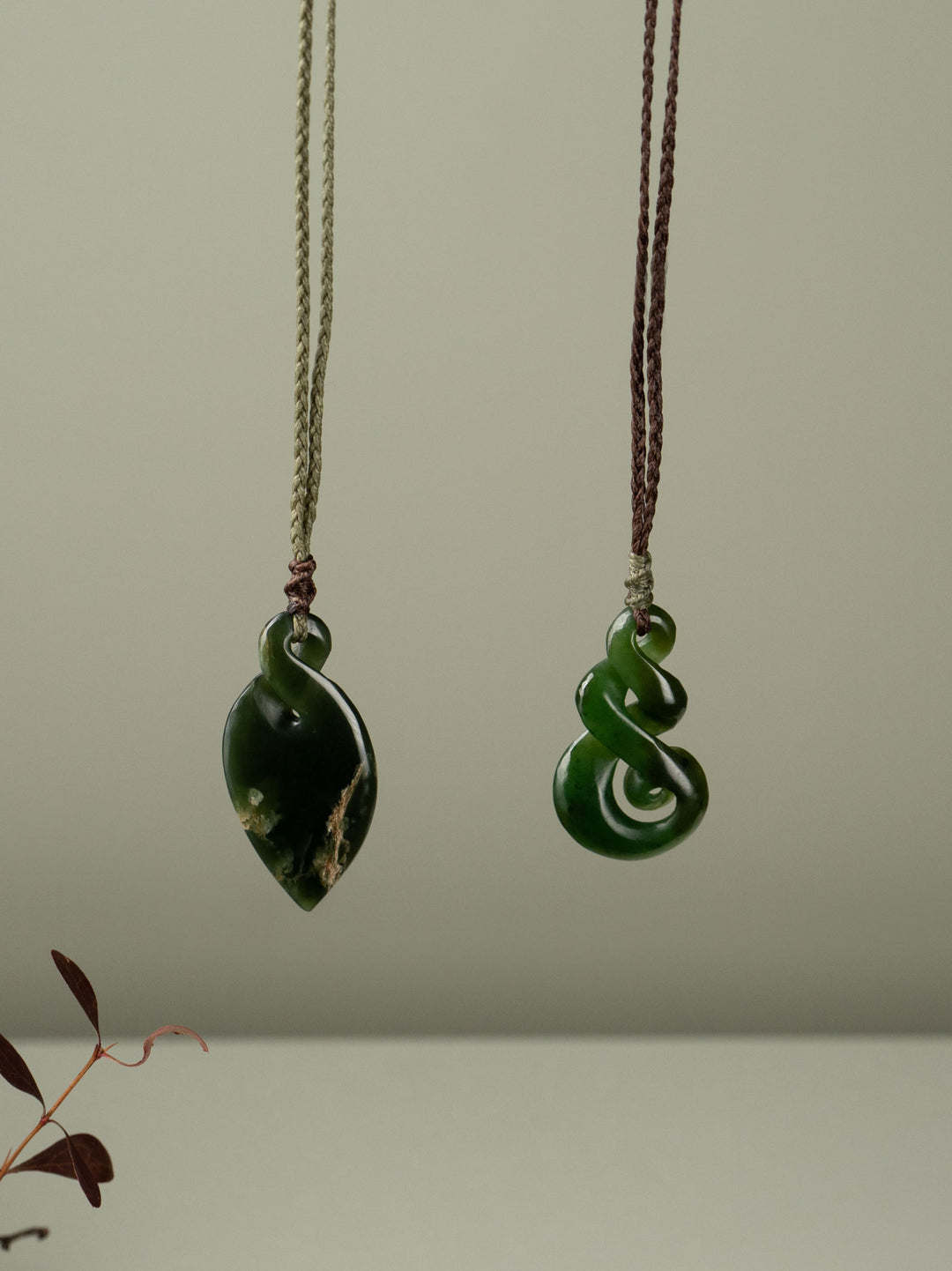 Symbolising intertwined lives, this large double twist pendant is carved from dark-toned New Zealand kawakawa greenstone with a unique stylised point. It represents enduring connections between whānau, groups, or multiple individuals, reflecting lasting bonds of friendship, love, and shared experiences. The pendant includes an adjustable black handwoven cord and is presented in an eco-friendly box with cards detailing its meaning and care.