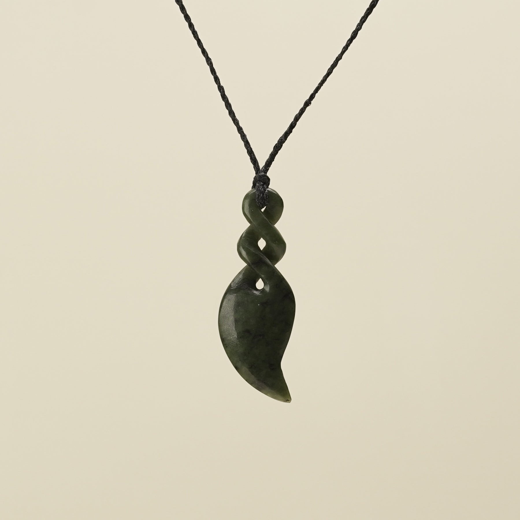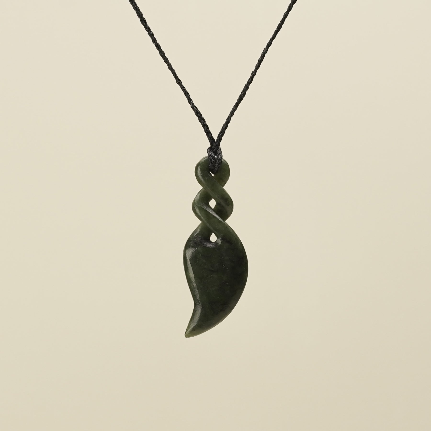 Symbolising intertwined lives, this large double twist pendant is carved from New Zealand Hapopo greenstone with a unique stylised point. It represents enduring connections between whānau, groups, or multiple individuals, reflecting lasting bonds of friendship, love, and shared experiences. The pendant includes an adjustable black handwoven cord and is presented in an eco-friendly box with cards detailing its meaning and care.