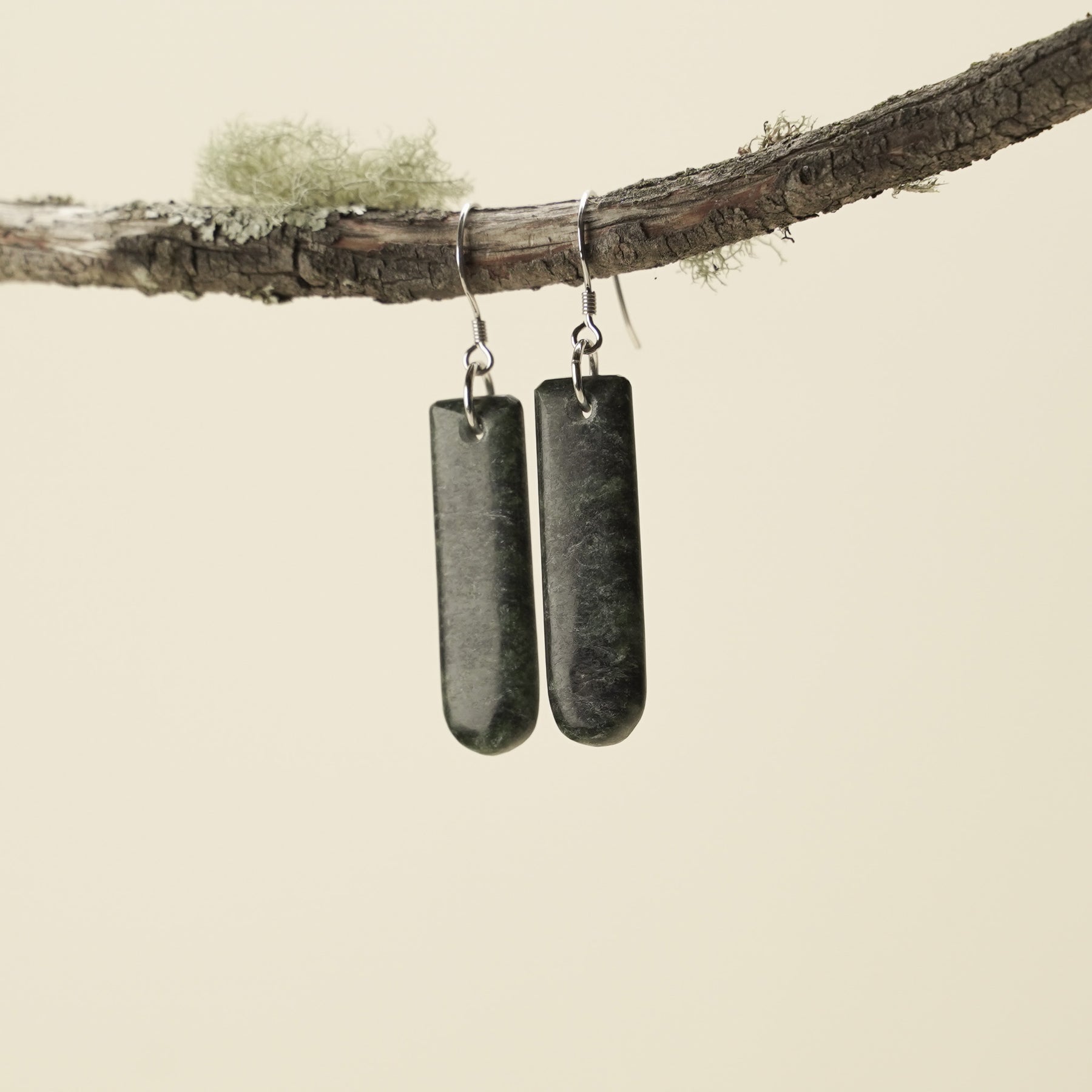 Handcrafted by Alex Sands Carving Studio, these natural drop earrings are carved from Hapopo pounamu. They showcase beautiful dark green tones & mossy streaks, adding unique character to each piece. These earrings have been finished in a matte polish to highlight their raw beauty. Set in 925 sterling silver and elegantly presented in an eco-friendly box, the perfect for celebrating connection, heritage, and inner strength.