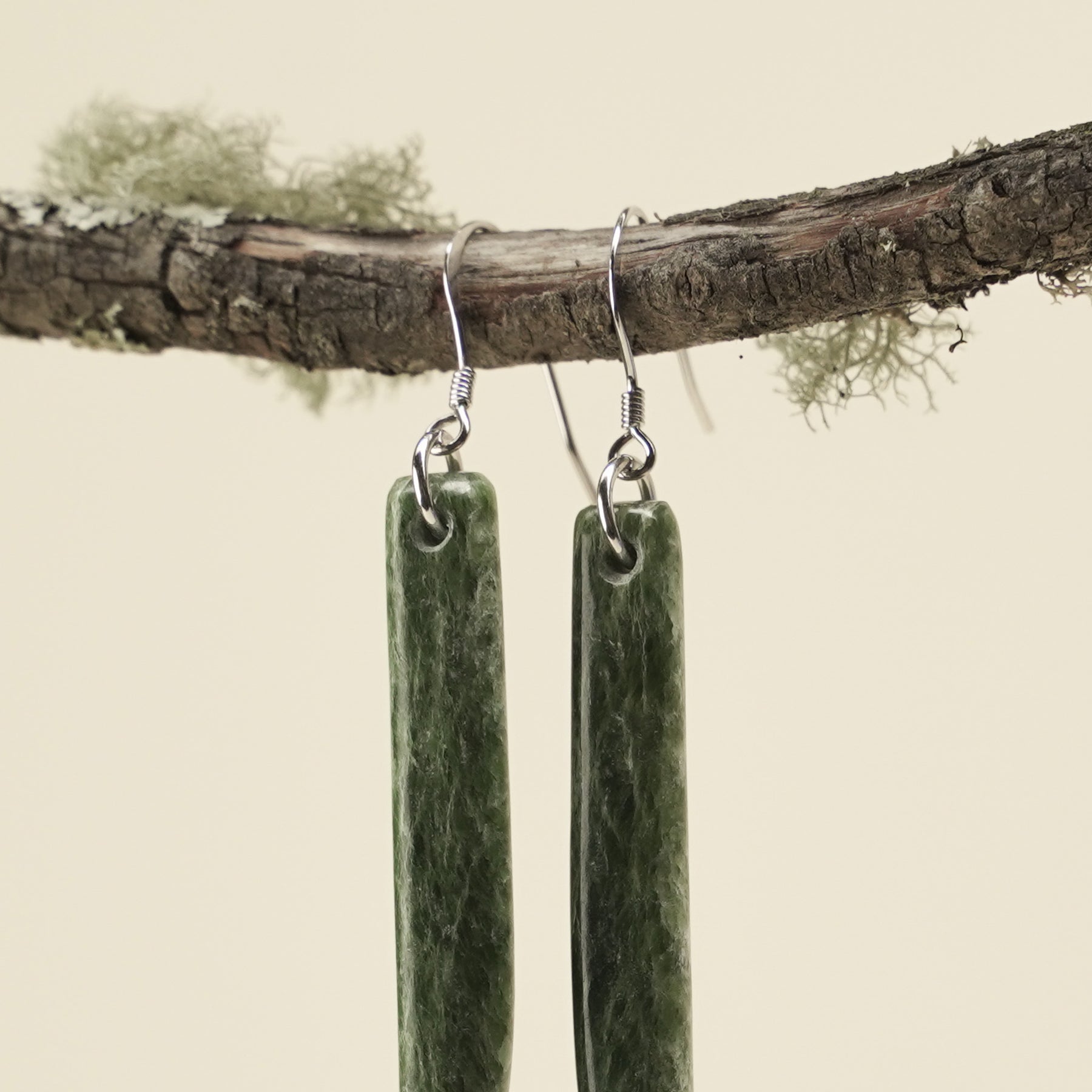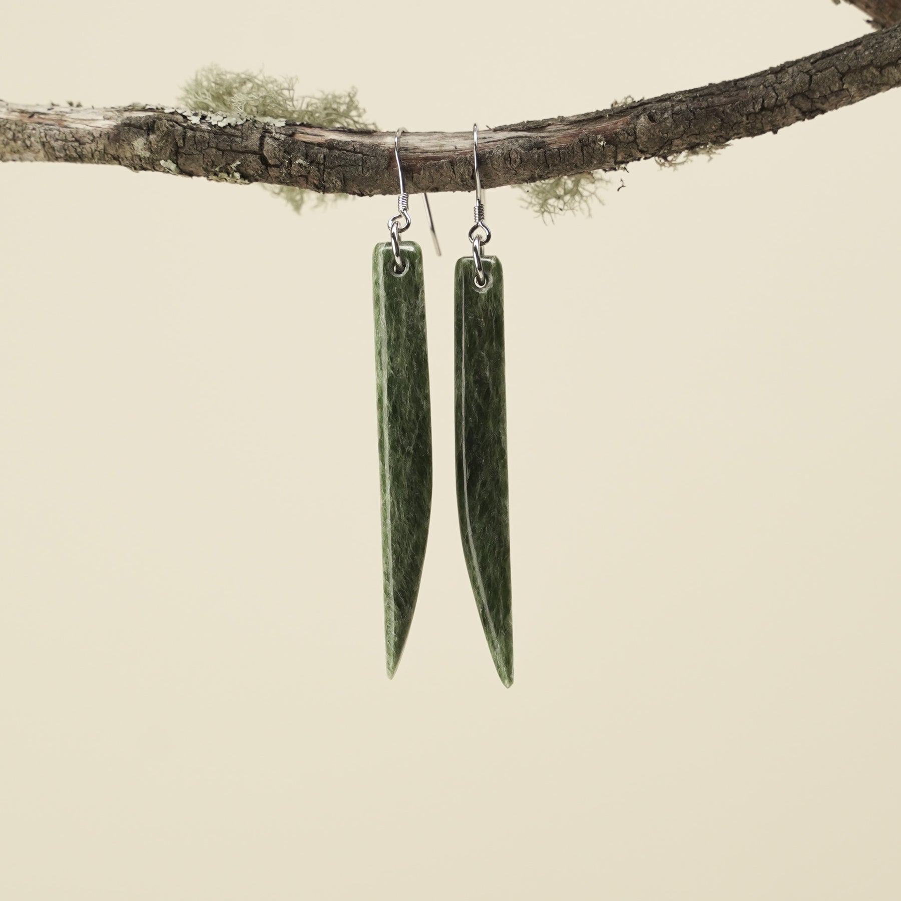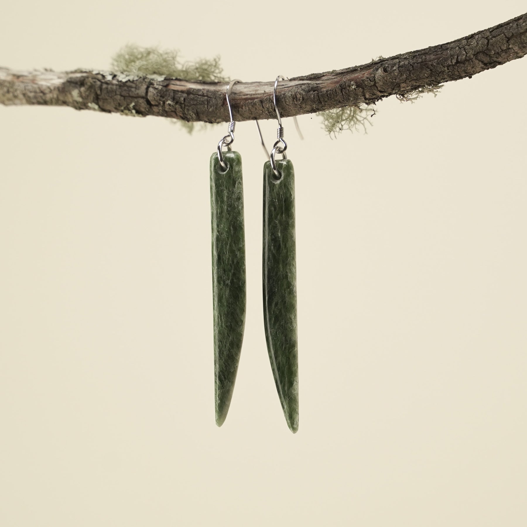 Handcrafted by Alex Sands Carving Studio, these natural drop earrings are carved from Hapopo pounamu. They showcase beautiful dark green tones & mossy streaks, adding unique character to each piece. These earrings have been finished in a matte polish to highlight their raw beauty. Set in 925 sterling silver and elegantly presented in an eco-friendly box, the perfect for celebrating connection, heritage, and inner strength.