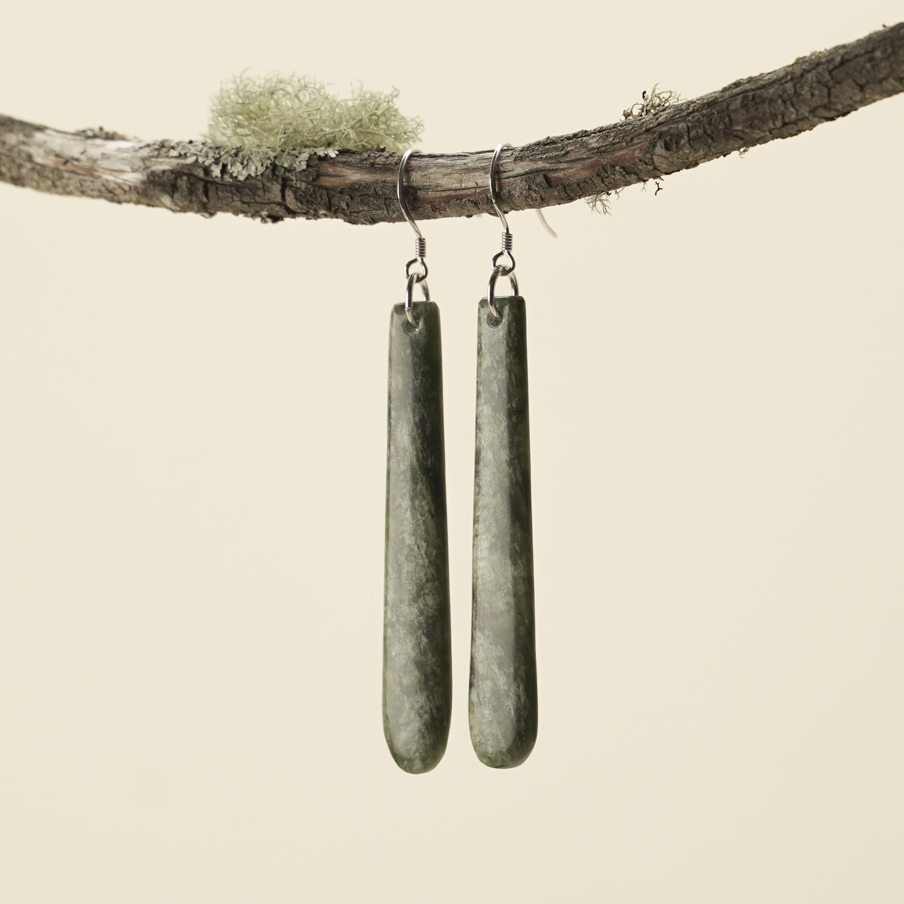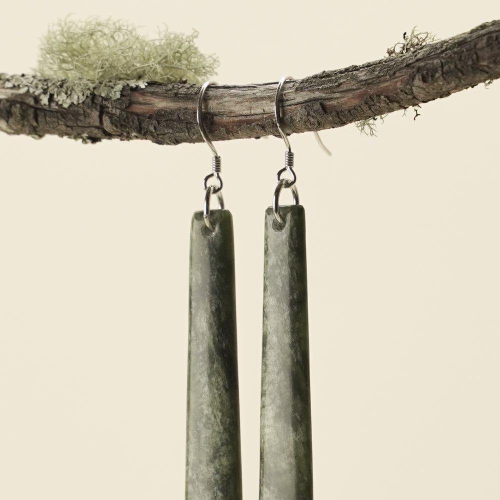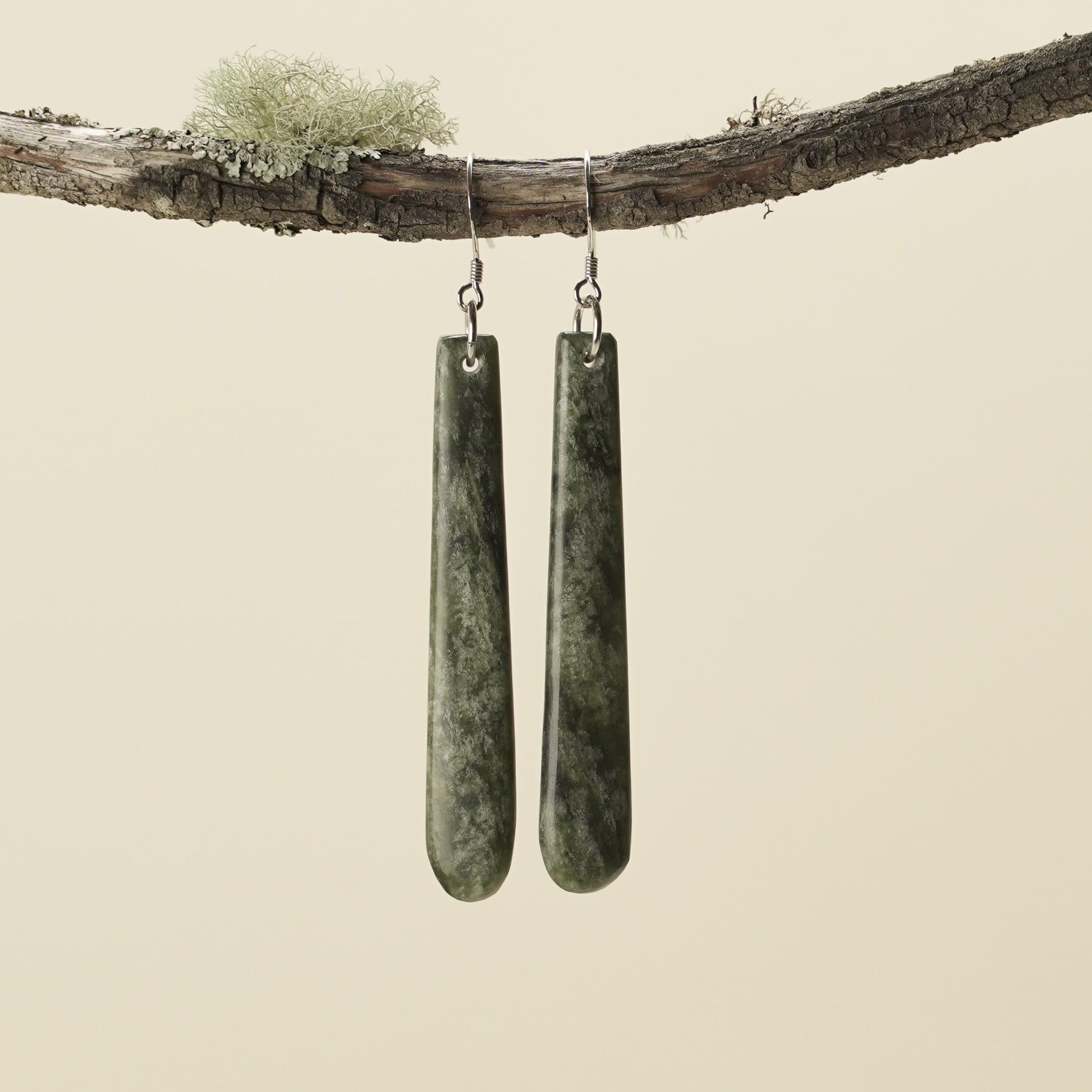 Handcrafted by Alex Sands Carving Studio, these natural drop earrings are carved from Hapopo pounamu. They showcase beautiful dark green tones & mossy streaks, adding unique character to each piece. These earrings have been finished in a matte polish to highlight their raw beauty. Set in 925 sterling silver and elegantly presented in an eco-friendly box, the perfect for celebrating connection, heritage, and inner strength.