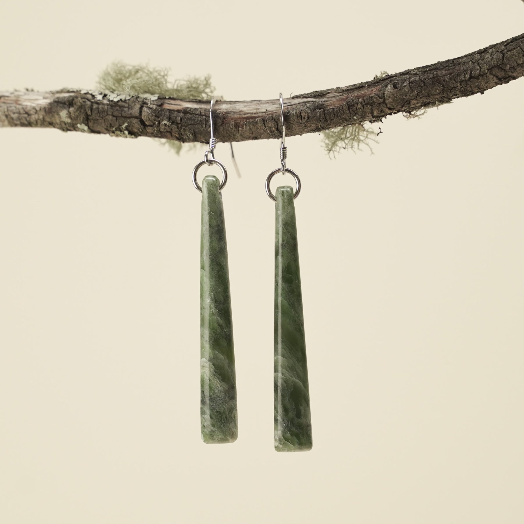 Handcrafted by Alex Sands Carving Studio, these natural drop earrings are carved from Hapopo pounamu. They showcase beautiful dark green tones & mossy streaks, adding unique character to each piece. These earrings have been finished in a matte polish to highlight their raw beauty. Set in 925 sterling silver and elegantly presented in an eco-friendly box, the perfect for celebrating connection, heritage, and inner strength.