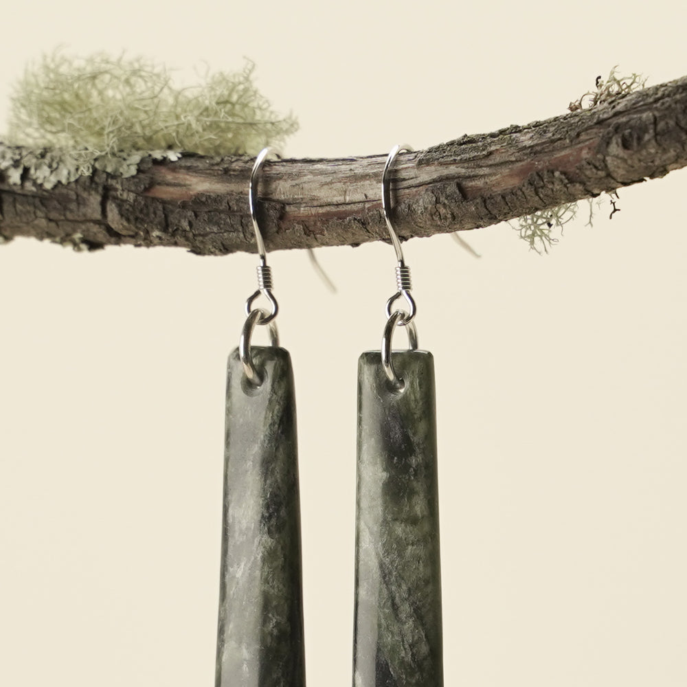 Handcrafted by Alex Sands Carving Studio, these natural drop earrings are carved from Hapopo pounamu. They showcase beautiful dark green tones & mossy streaks, adding unique character to each piece. These earrings have been finished in a matte polish to highlight their raw beauty. Set in 925 sterling silver and elegantly presented in an eco-friendly box, the perfect for celebrating connection, heritage, and inner strength.