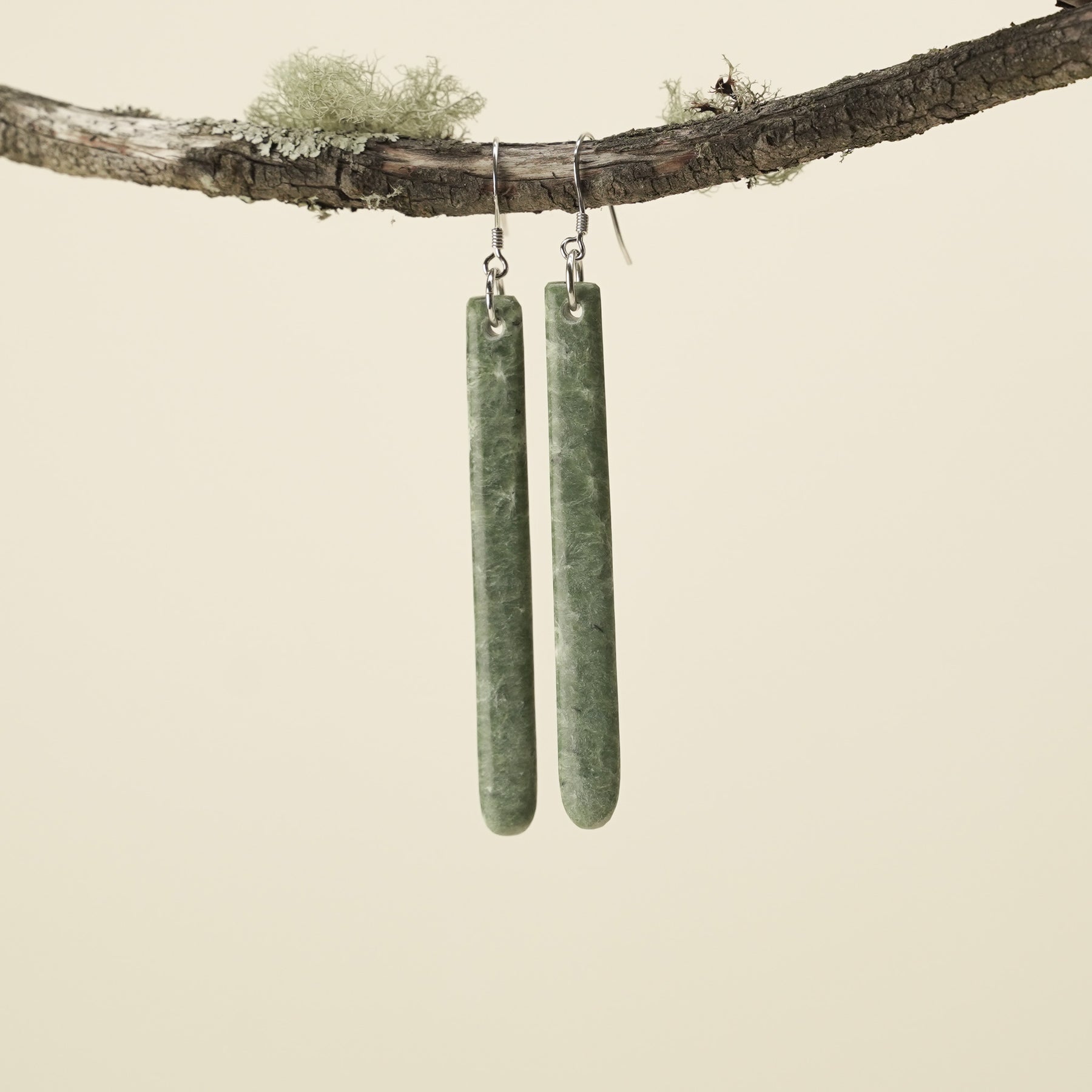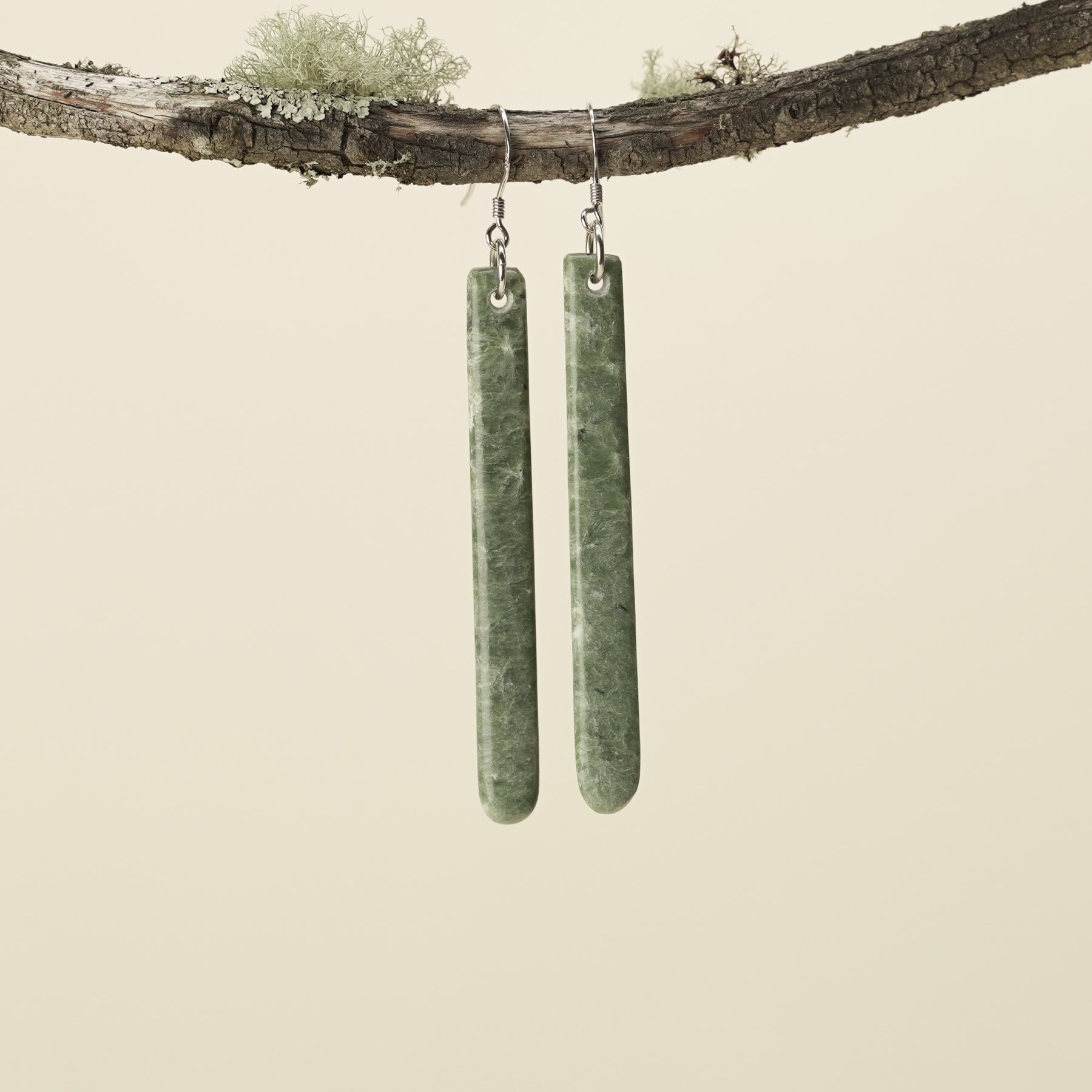 Handcrafted by Alex Sands Carving Studio, these natural drop earrings are carved from Inanga pounamu, which is a highly prized variety of greenstone, showcasing its soft greyish green hue with white marbling. These earrings have been finished in a matte polish to highly their raw beauty. Set in 925 sterling silver and elegantly presented in an eco-friendly box, the perfect for celebrating connection, heritage, and inner strength.