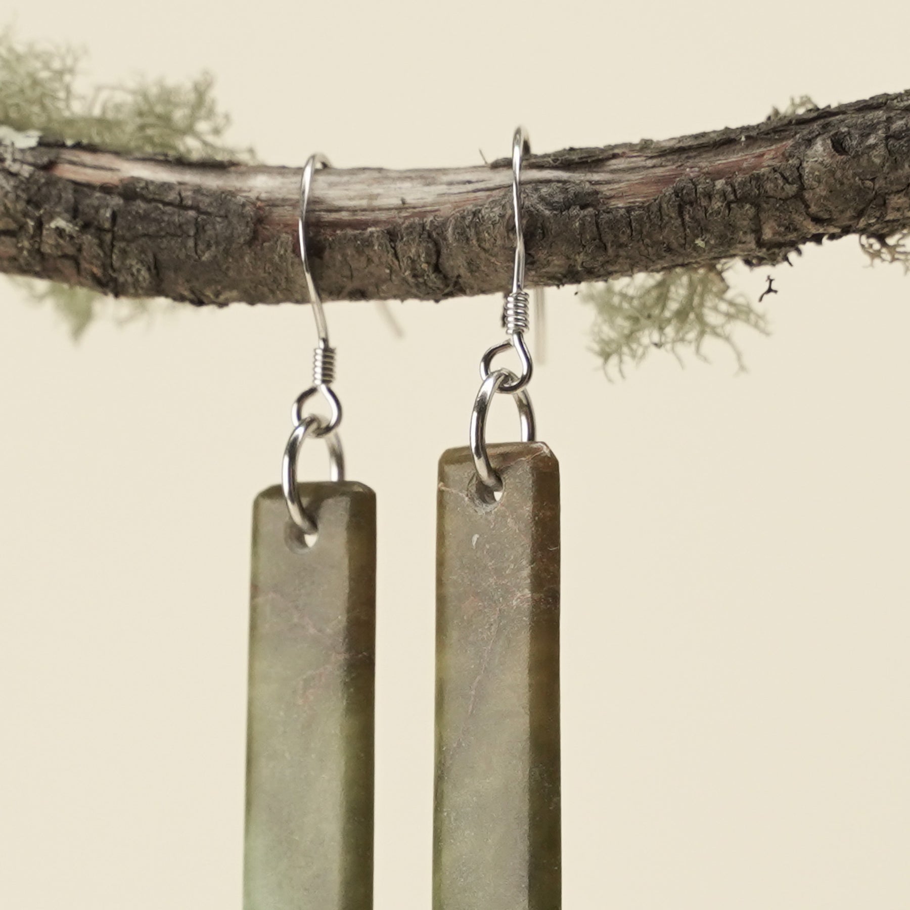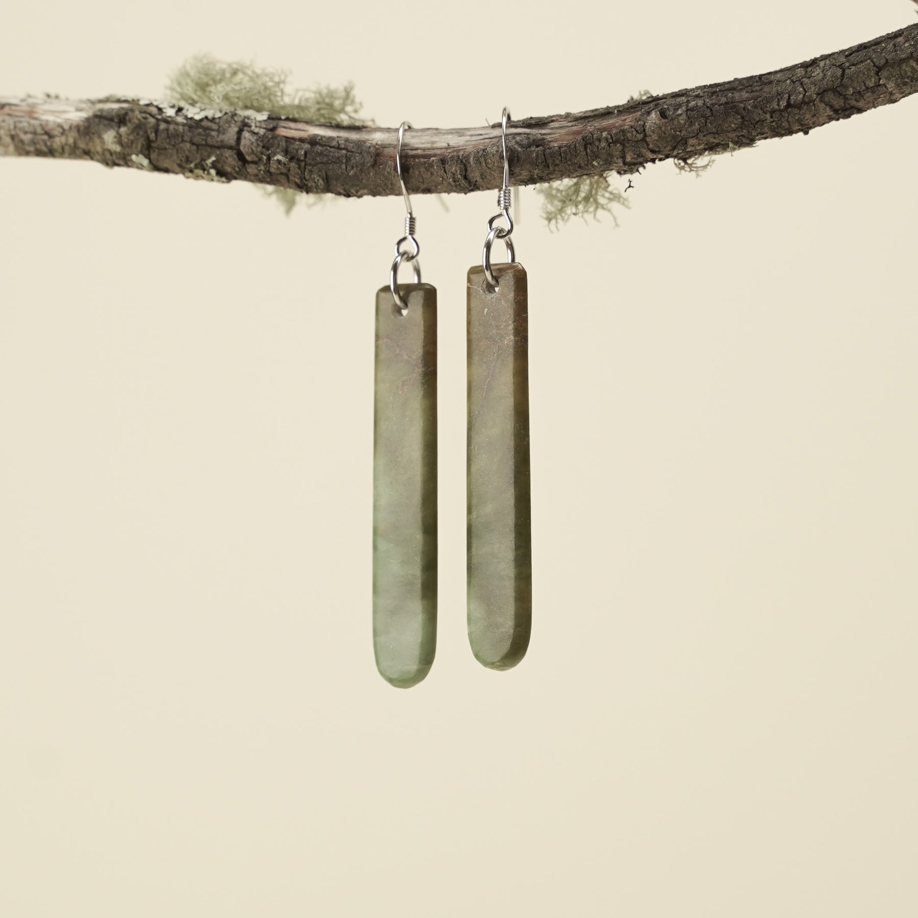 Handcrafted by Alex Sands Carving Studio, these natural drop earrings are carved from Inanga pounamu, which is a highly prized variety of greenstone, showcasing its soft greyish green hue with subtle darker inclusions. These earrings have been finished in a matte polish to highlight their raw beauty. Set in 925 sterling silver and elegantly presented in an eco-friendly box, the perfect for celebrating connection, heritage, and inner strength.