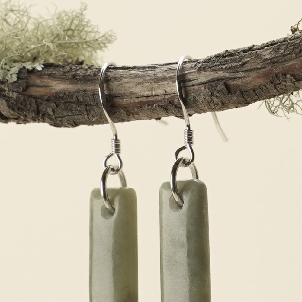Handcrafted by Alex Sands Carving Studio, these one-off natural drop earrings are carved from Inanga pounamu, which is a highly prized variety of greenstone, showcasing its soft greyish green hue with subtle darker speckles. These earrings have been finished in a matte polish to highly their raw beauty. Set in 925 sterling silver and elegantly presented in an eco-friendly box with a card explaining the stone’s meaning and care, they are a meaningful and timeless gift, the perfect for celebrating connection, heritage, and inner strength.