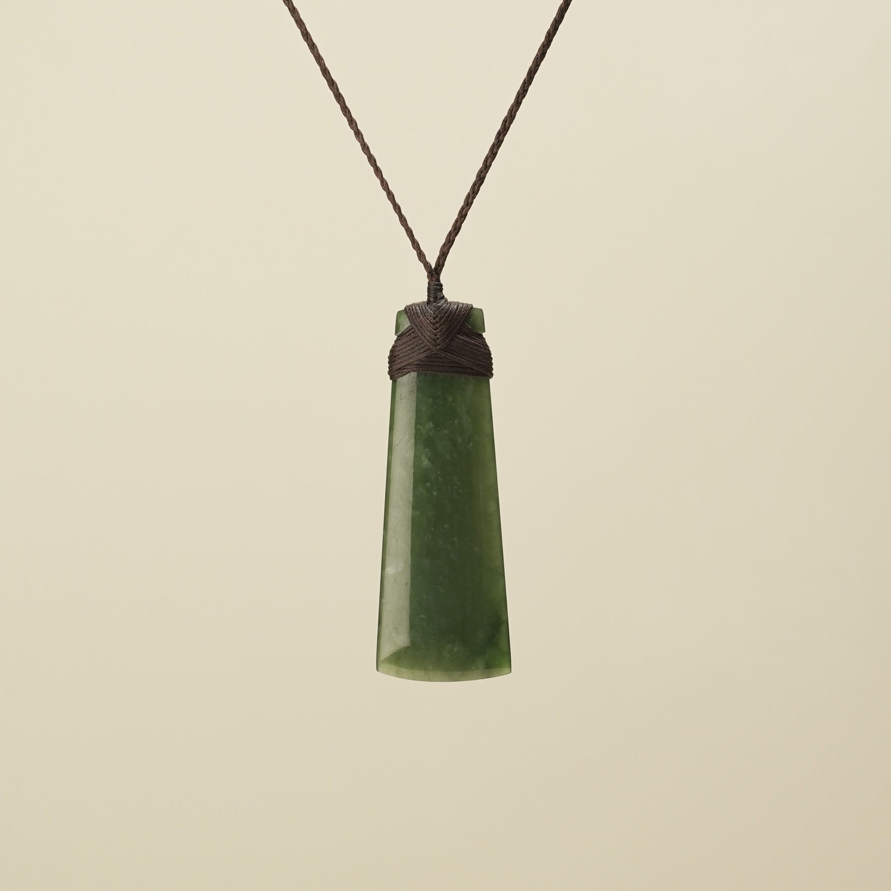 Carved in our Arrowtown workshop from rich Kahurangi pounamu, this one-off XL Toki pendant symbolises strength and leadership. Its vibrant green tones, enhanced by its polished finish, beautifully highlight the natural beauty of Aotearoa’s pounamu. Paired with an adjustable handwoven brown cord for a personalised fit, this remarkable Toki is elegantly presented in an eco-friendly box, accompanied by cards detailing its meaning and care—a truly cherished taonga.