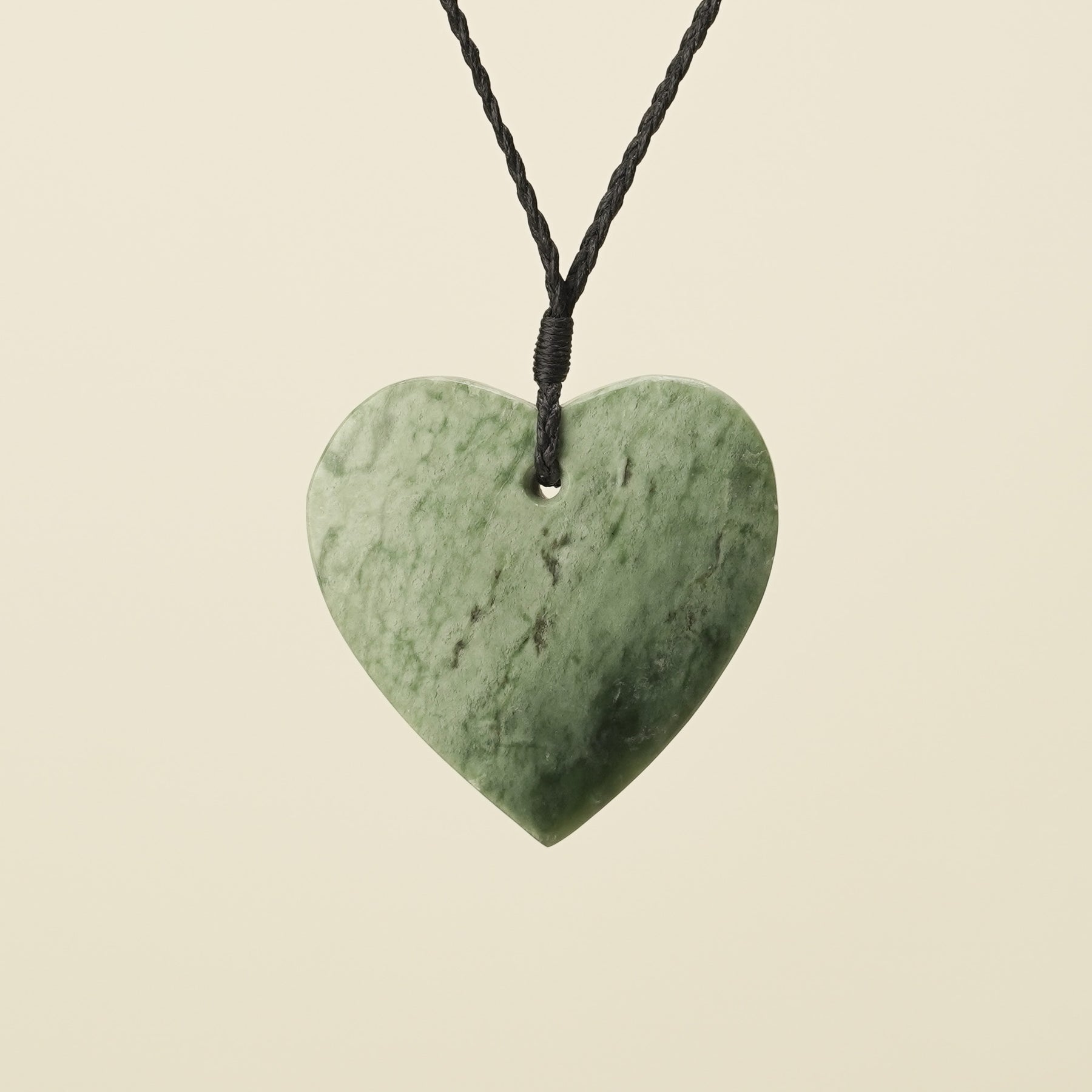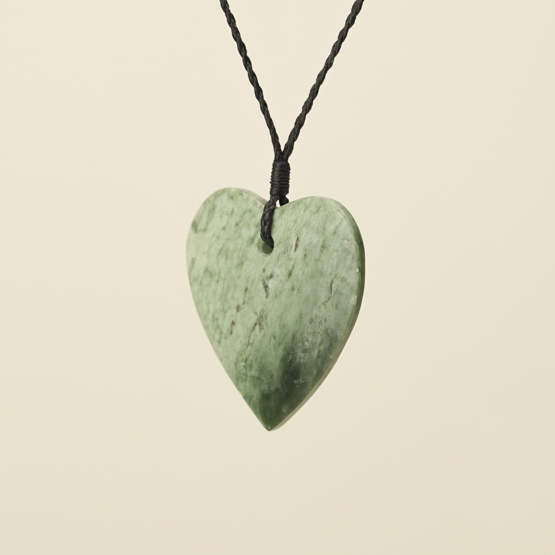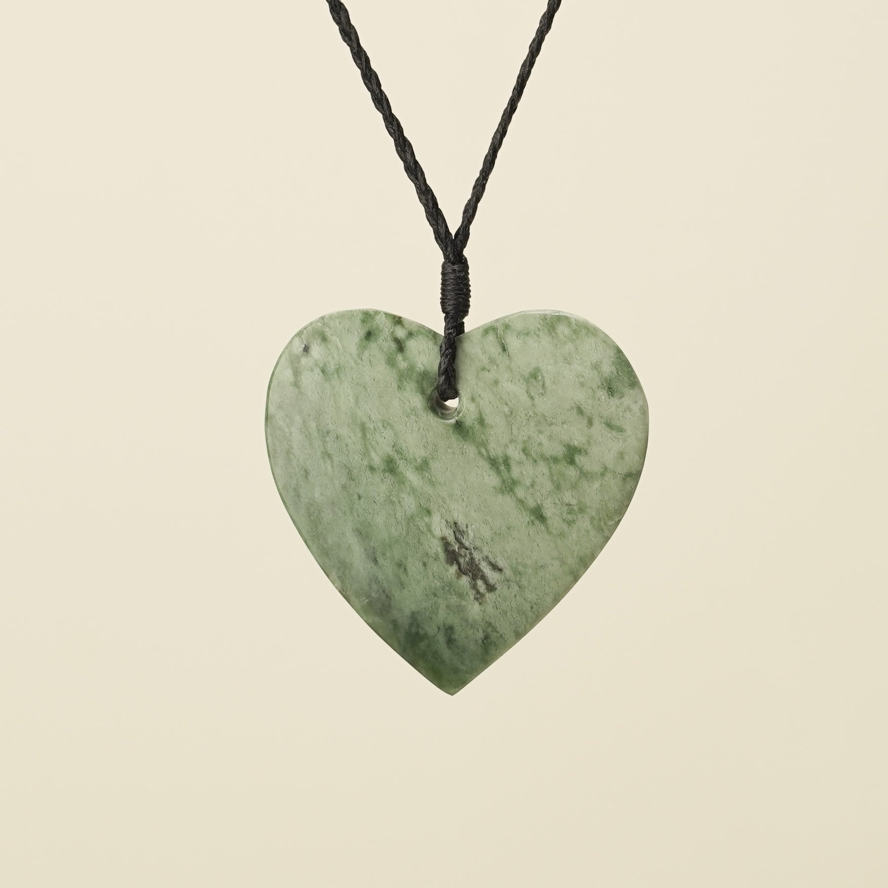 This large Matte Pounamu Manawa (Heart) pendant, carved from Inanga Pounamu, showcases a unique blend of deep green and soft white hues with a natural marbled texture. It features handwoven adjustable black cord. Symbolising aroha (love) and cherished connections, this pendant is thoughtfully presented in an eco-friendly box with a meaning and care card.
