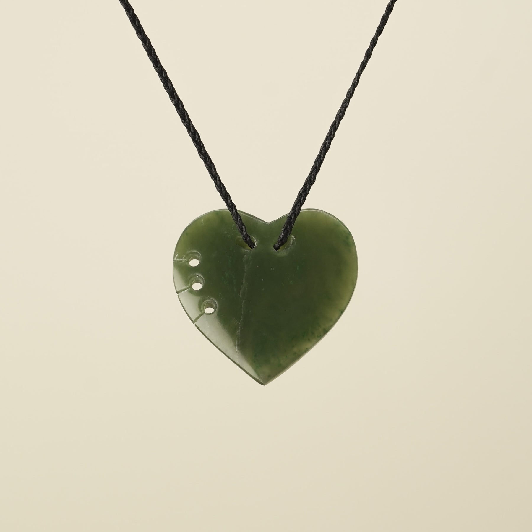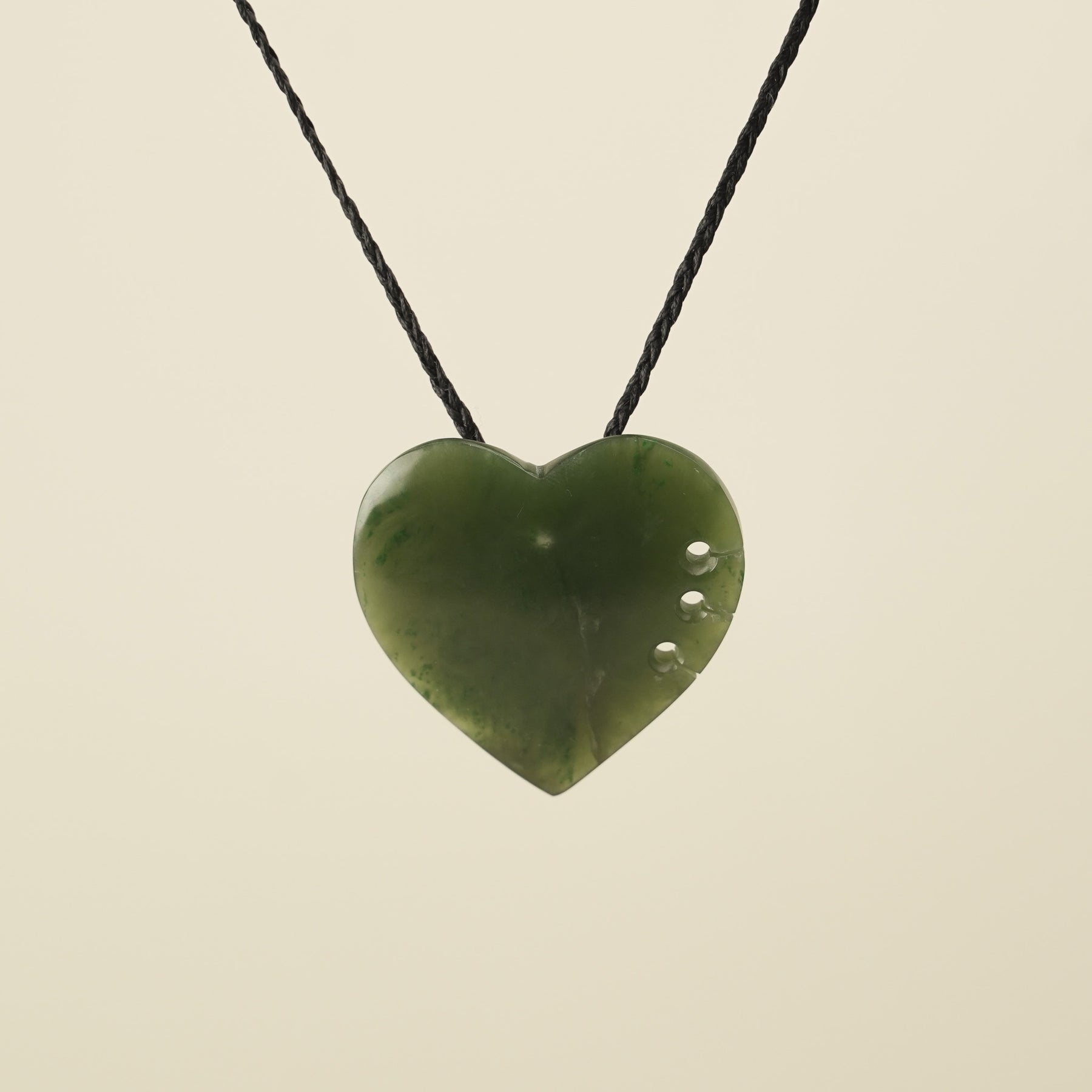 This large polished Pounamu Manawa (Heart) pendant, carved from Kawakawa Pounamu, showcases a unique blend of deep green and soft white hues with a natural marbled texture.