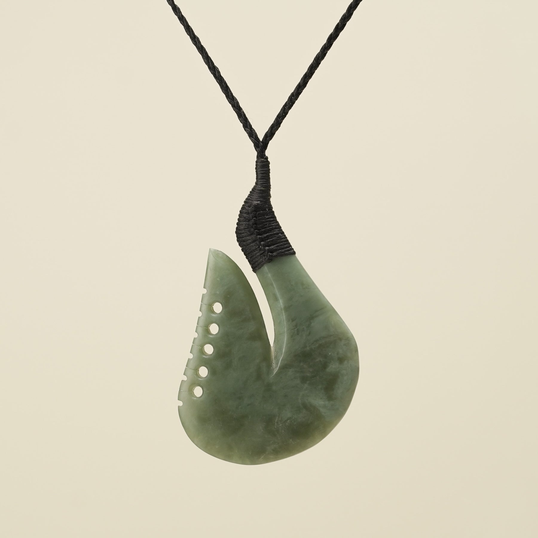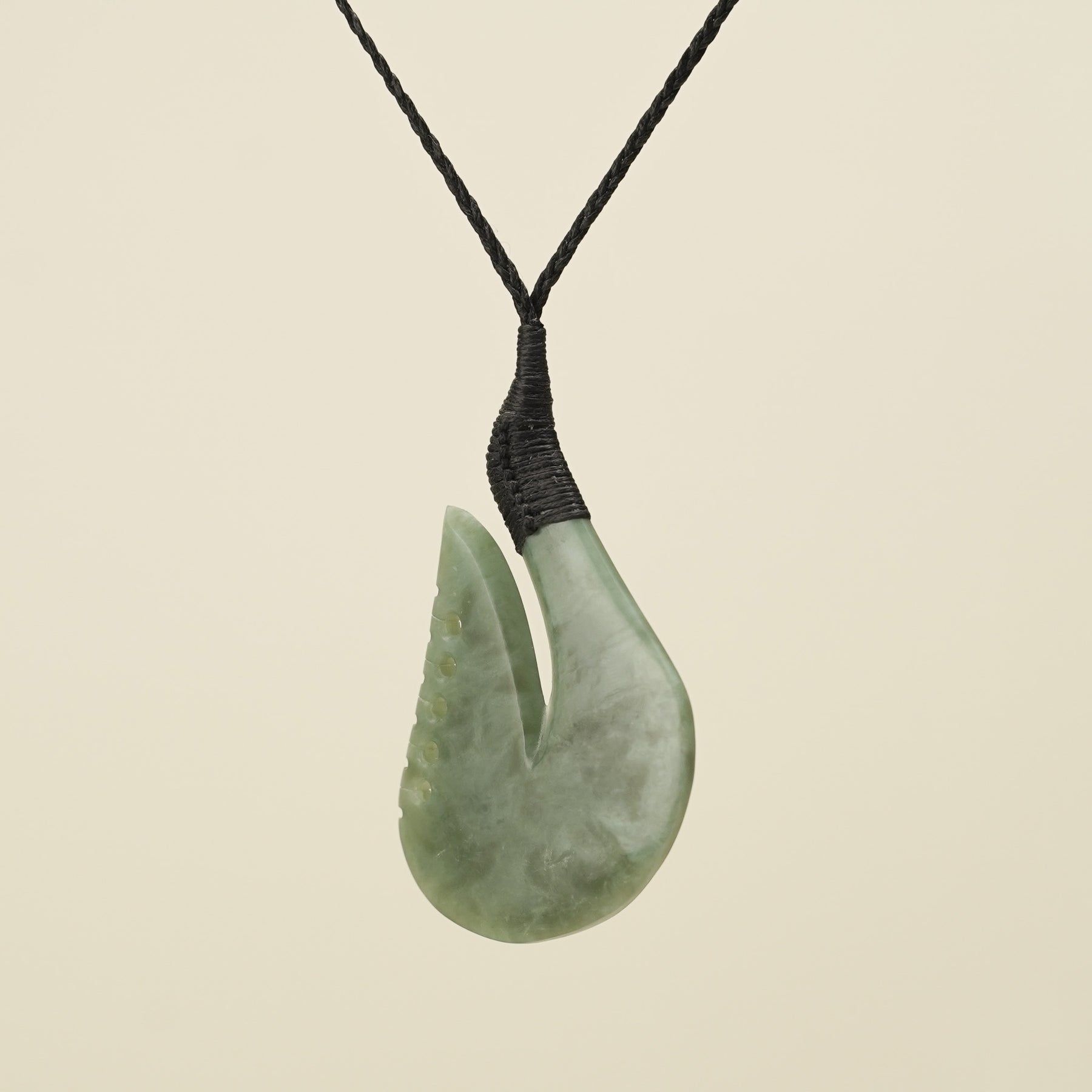 Carved from New Zealand Inanga (pounamu), this large Hei Matau pendant is a treasured piece of traditional craftsmanship. Inanga is a highly prized variety of greenstone, showcasing its soft greyish green hue with subtle darker speckles. Symbolising a deep connection to the sea, the Hei Matau is worn for protection and good fortune, offering strength and safe passage. Its wearer is seen as a provider and protector, embodying the determination that leads to success in life.