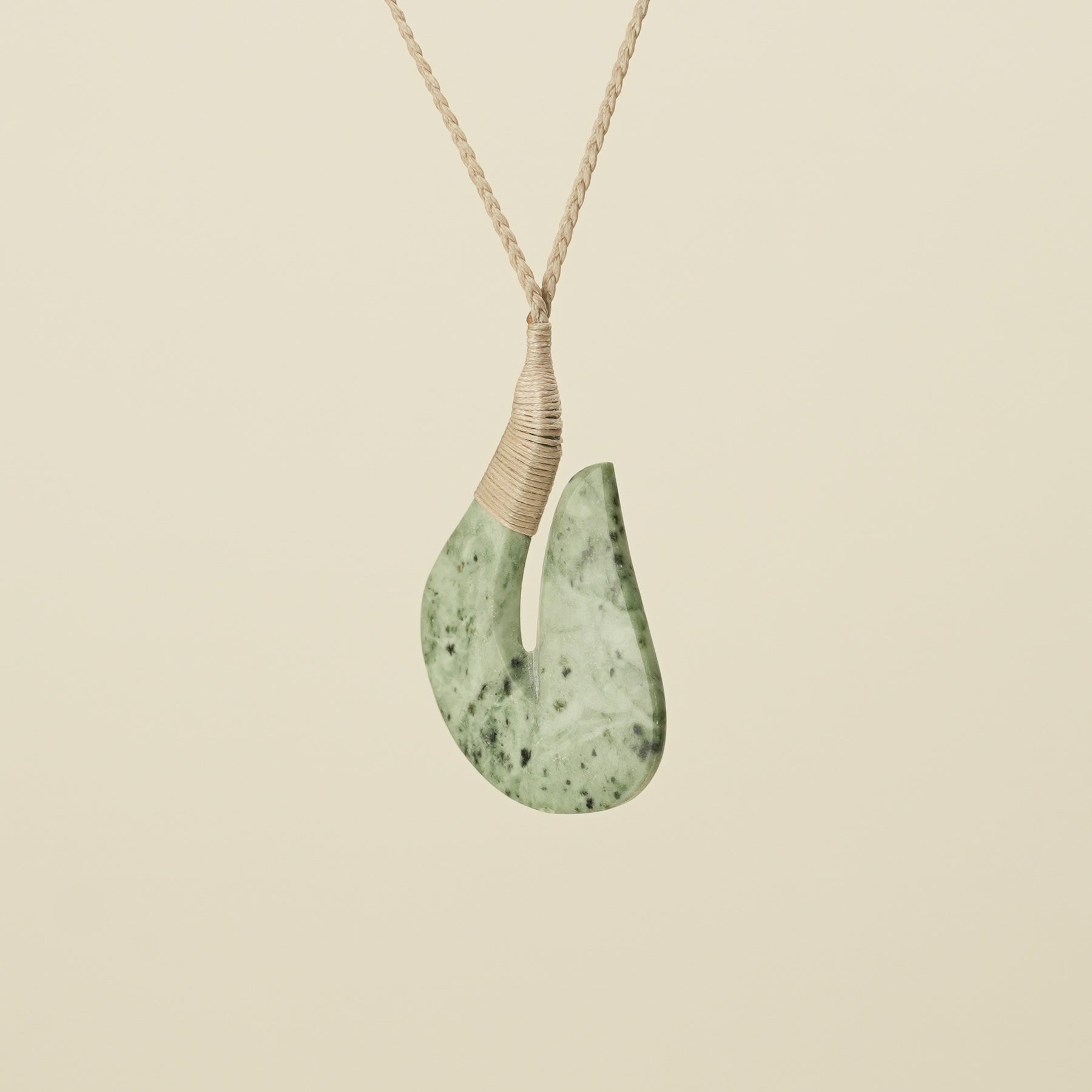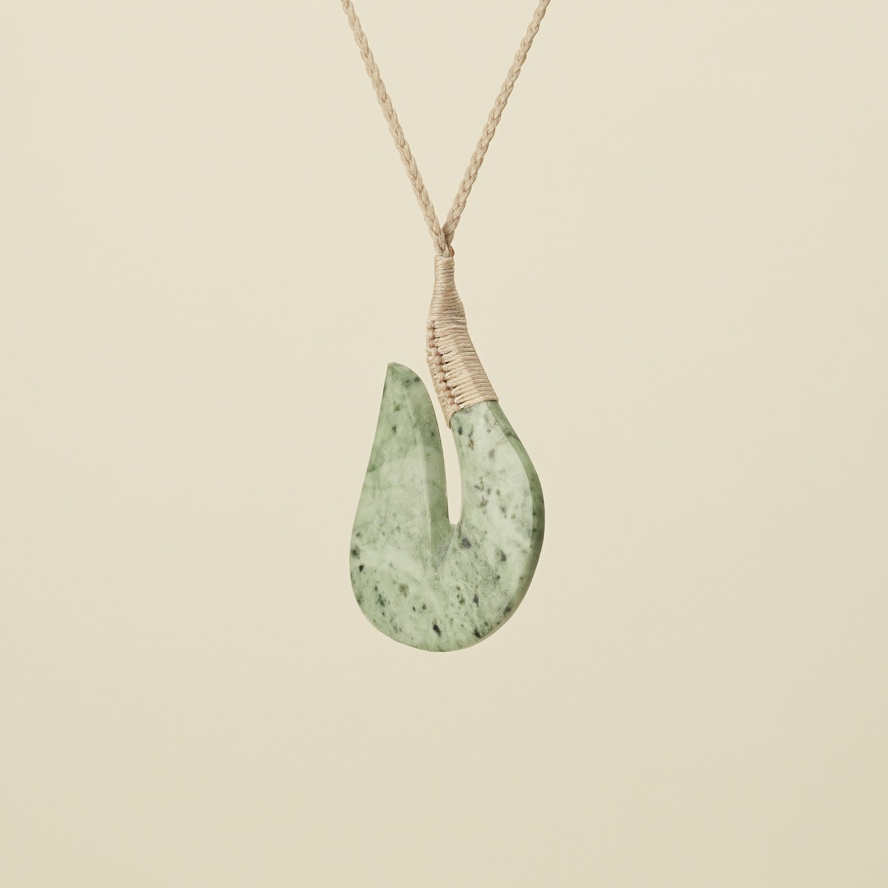 Carved from New Zealand Kokopu (pounamu), this large Hei Matau pendant is a treasured piece of traditional craftsmanship. The pendant showcases a rich green tone with delicate black speckles, inspired by the native Kokopu trout. Symbolising a deep connection to the sea, the Hei Matau is worn for protection and good fortune, offering strength and safe passage. Its wearer is seen as a provider and protector, embodying the determination that leads to success in life. Paired with an adjustable, handwoven tan cord for a comfortable fit, it comes in an eco-friendly box complete with cards detailing its meaning and care.