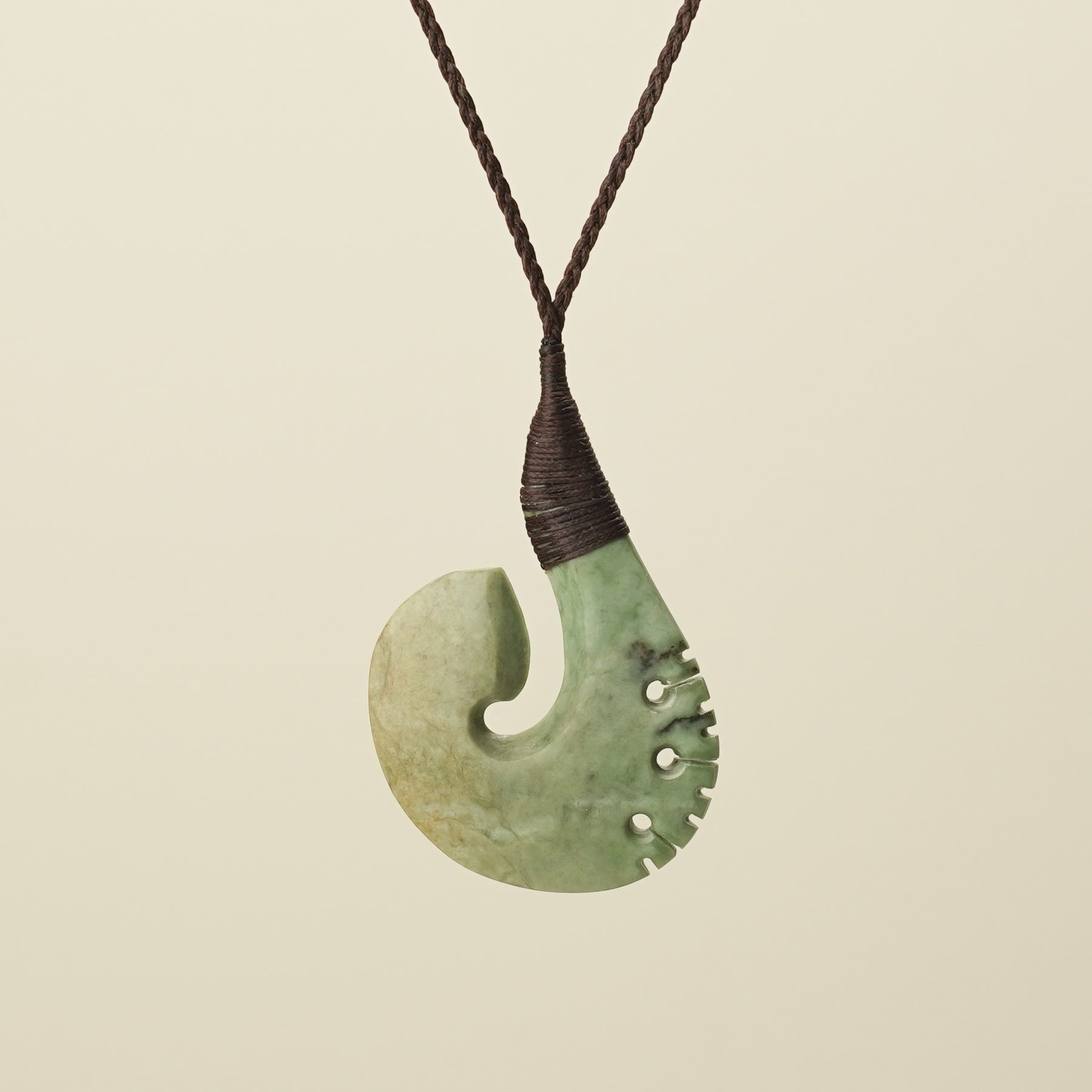 Carved from New Zealand Inanga Raukaraka(pounamu), this large Hei Matau pendant is a treasured piece of traditional craftsmanship. Inanga is a highly prized variety of greenstone, showcasing its light green hues with soft golden clouding. The carved notches reflect traditional Māori carving, historically symbolising whakapapa (genealogy) and the passing of wisdom between generations. Today, these notches may also represent whānau members or loved ones, adding personal meaning to each pendant.