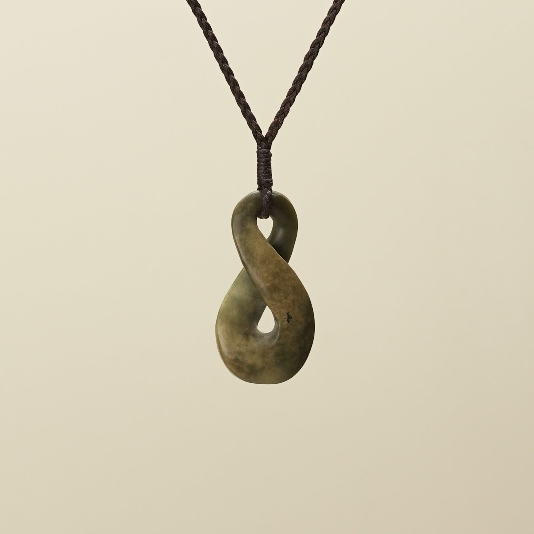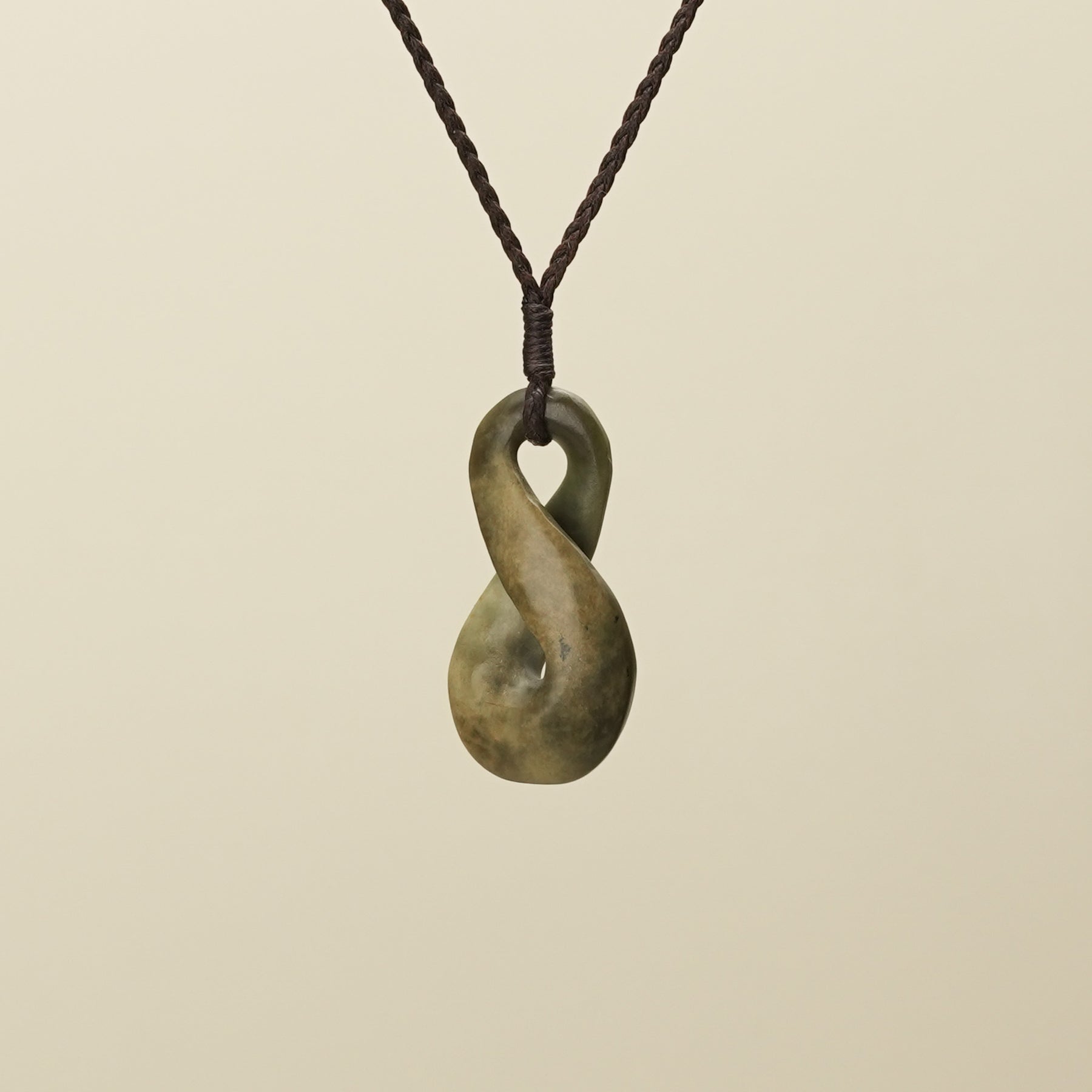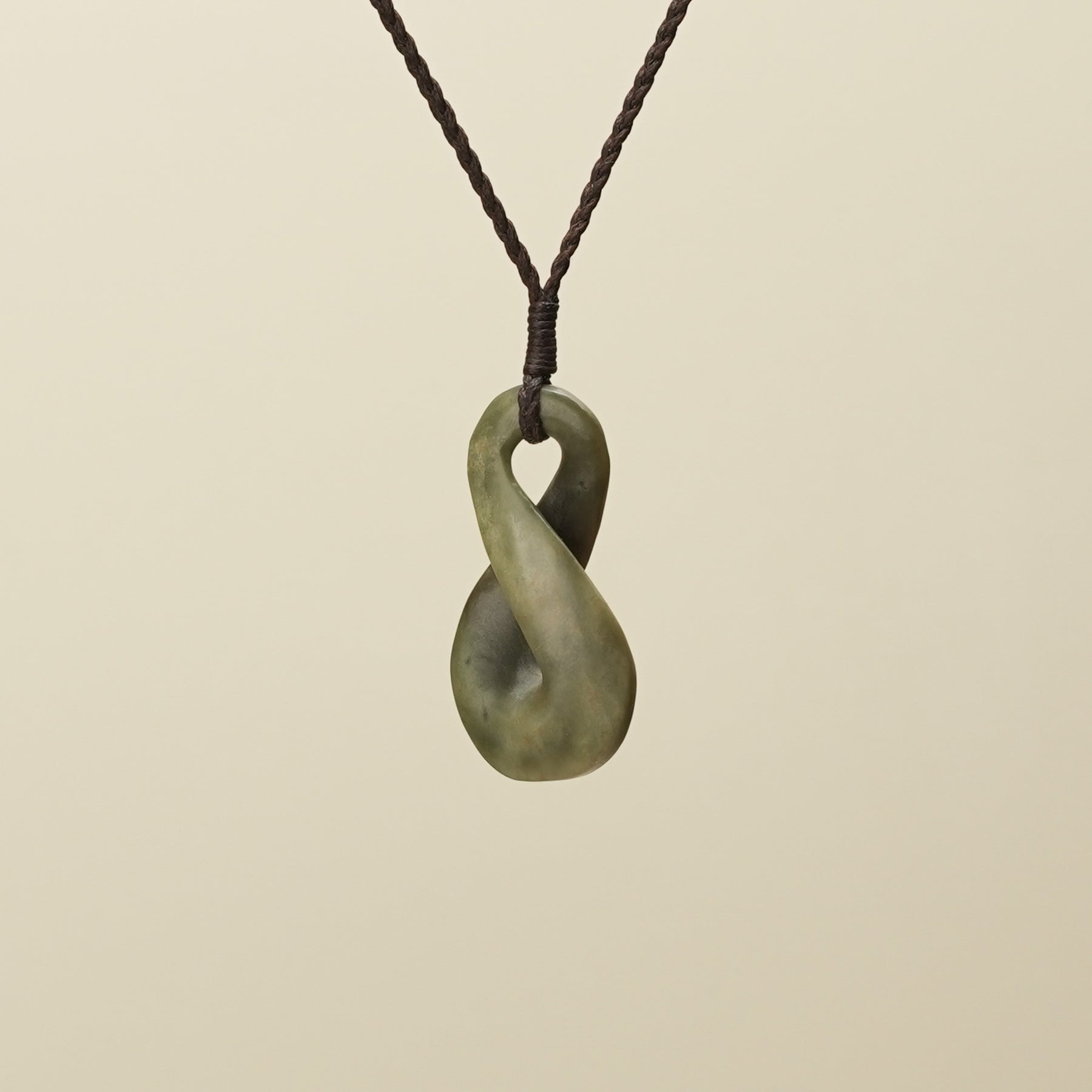 Symbolising the intertwining of lives, this medium sized single twist pendant is carved from New Zealand pounamu with Raukaraka tones.