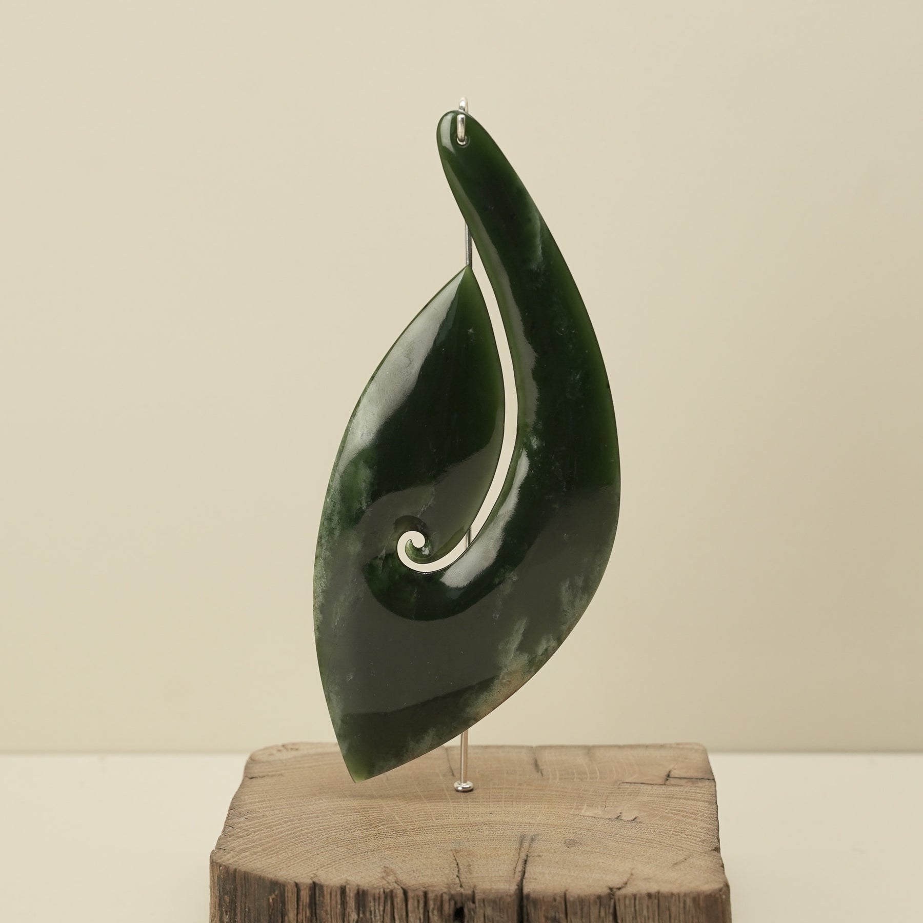 Resting on a driftwood base, the fishhook shape (Hei Matua) speaks to safe passage across water and enduring ties to te moana. It is a symbol of resilience, strength, and the unbroken connection between past and future - a taonga that carries meaning for life’s significant milestones.