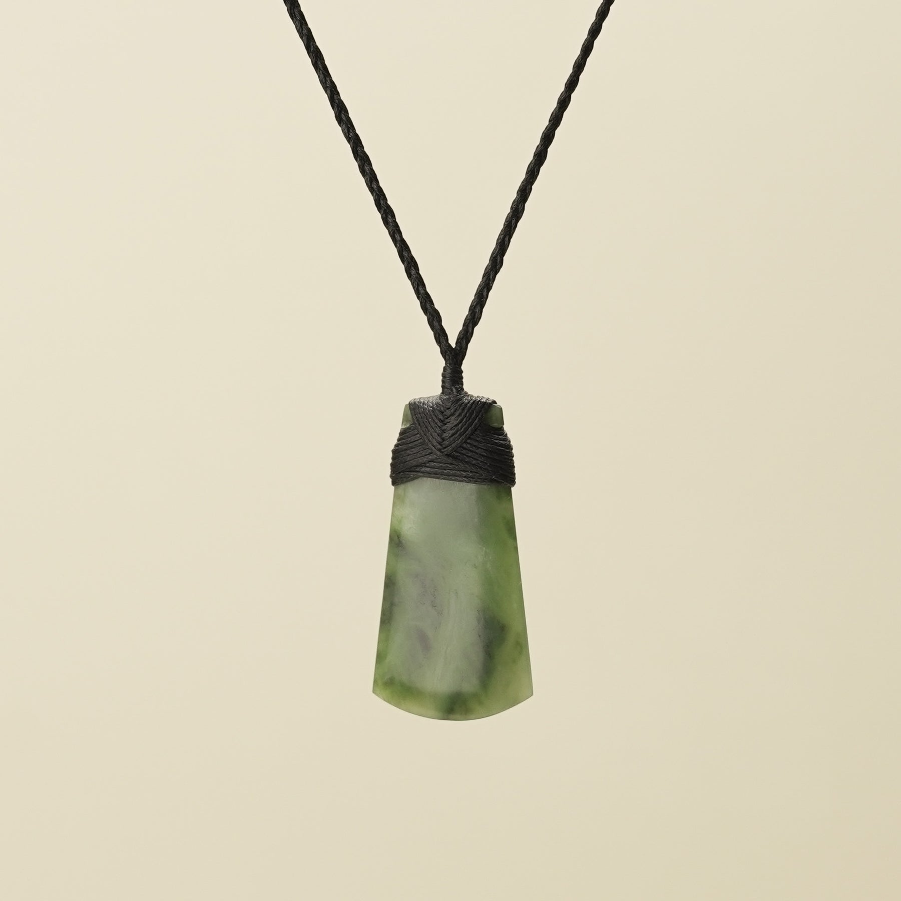 Carved in our Arrowtown workshop from rich Kahurangi/Inanga pounamu, this one-off Toki pendant symbolises strength and leadership. Its calm green tones with a matte finish, beautifully highlight the natural beauty of Aotearoa’s pounamu. Paired with an adjustable handwoven black cord for a personalised fit, this remarkable Toki is elegantly presented in an eco-friendly box, accompanied by cards detailing its meaning and care—a truly cherished taonga.
