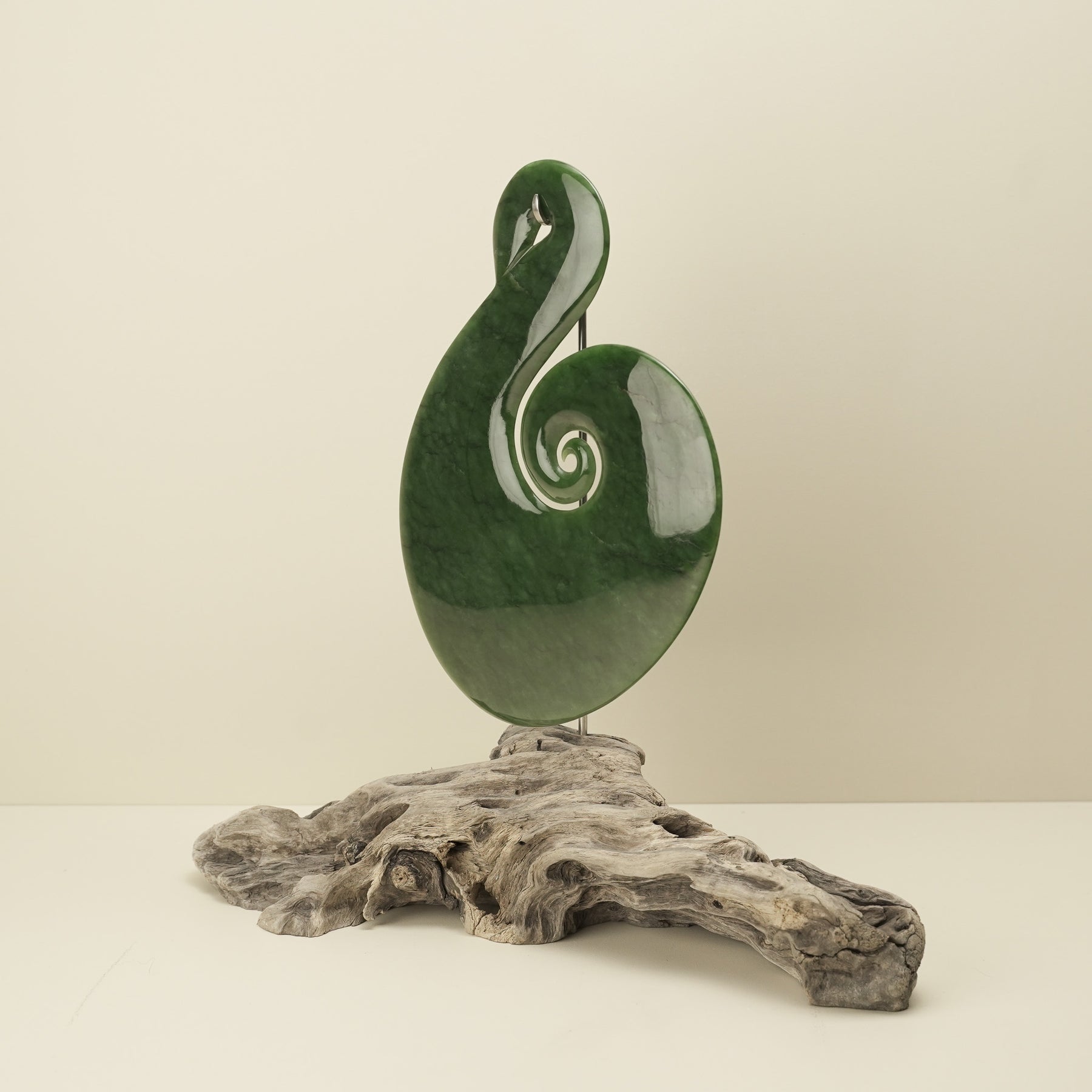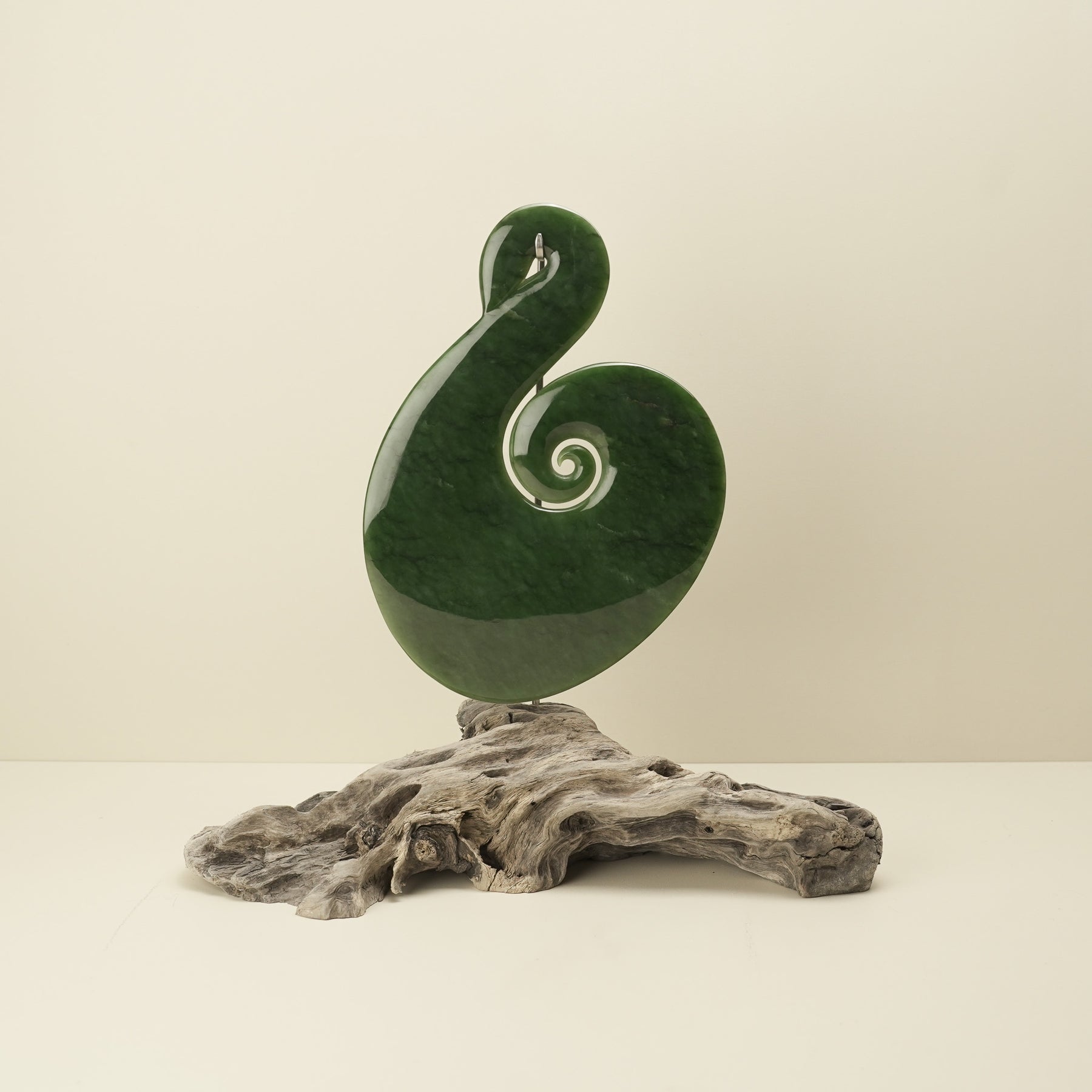 The Koru symbol and Hei Matau (fish hook) together represent the harmonious balance between whenua (land) and moana (sea). The Koru signifies new beginnings and personal growth, while the Hei Matau symbolises strength, perseverance, and safe journeys across water.
