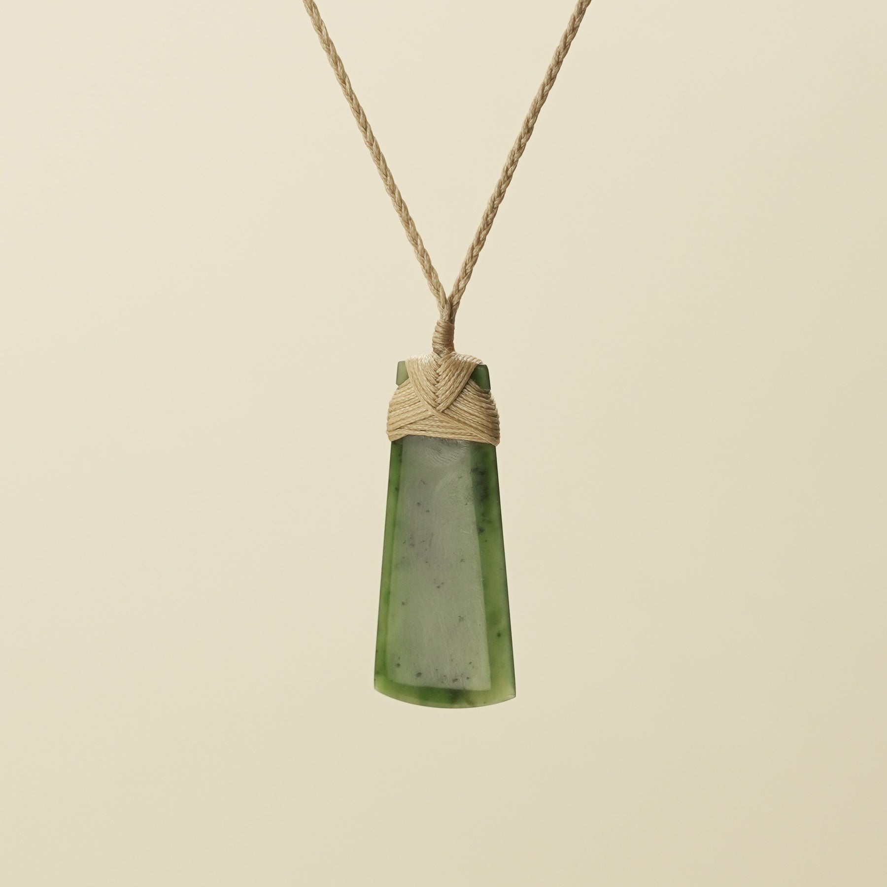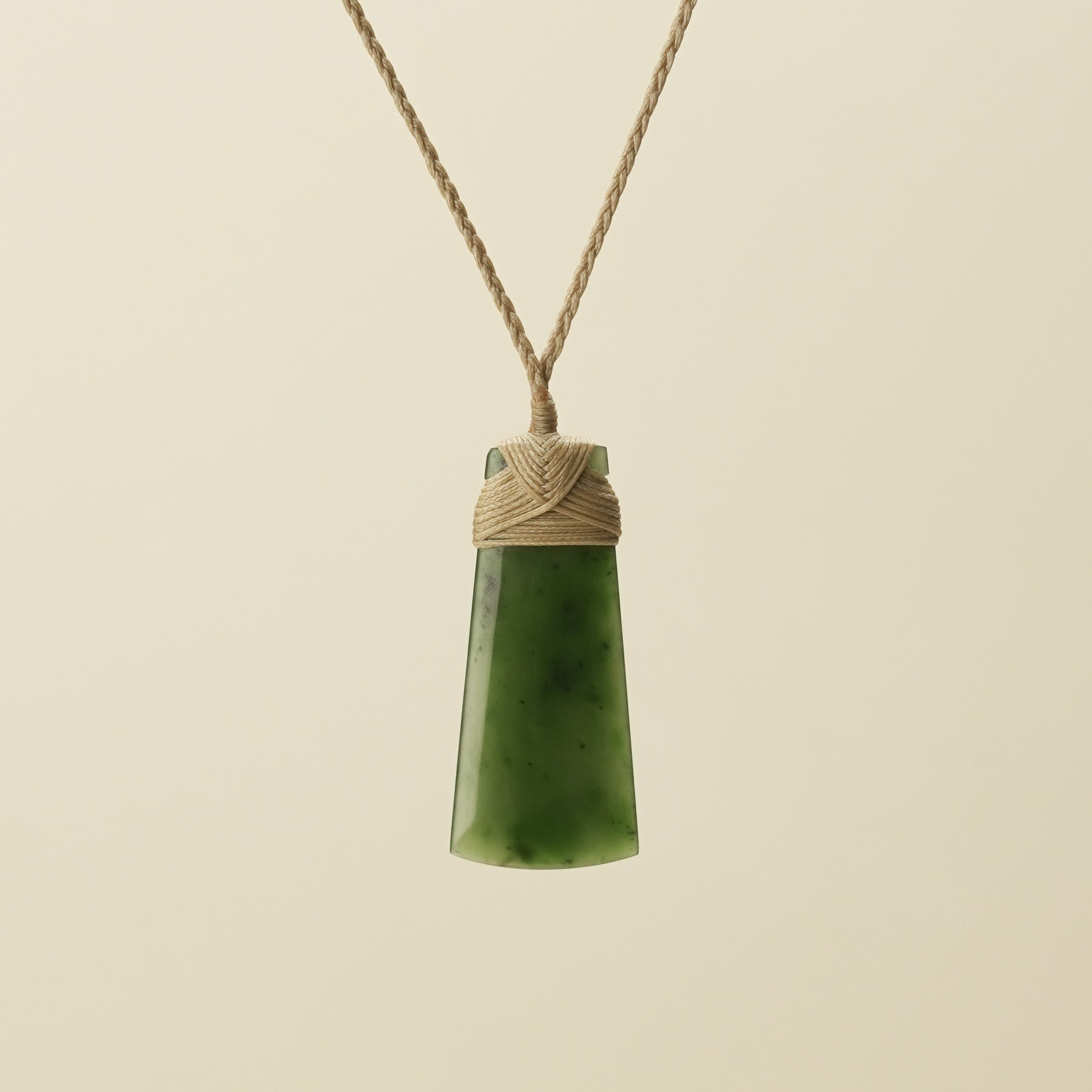 Carved in our Arrowtown workshop from rich Kahurangi pounamu, this one-off Toki pendant symbolises strength and leadership. Its calm green tones with a polished finish, beautifully highlight the natural beauty of Aotearoa’s pounamu. Paired with an adjustable handwoven tan cord for a personalised fit, this remarkable Toki is elegantly presented in an eco-friendly box, accompanied by cards detailing its meaning and care—a truly cherished taonga.