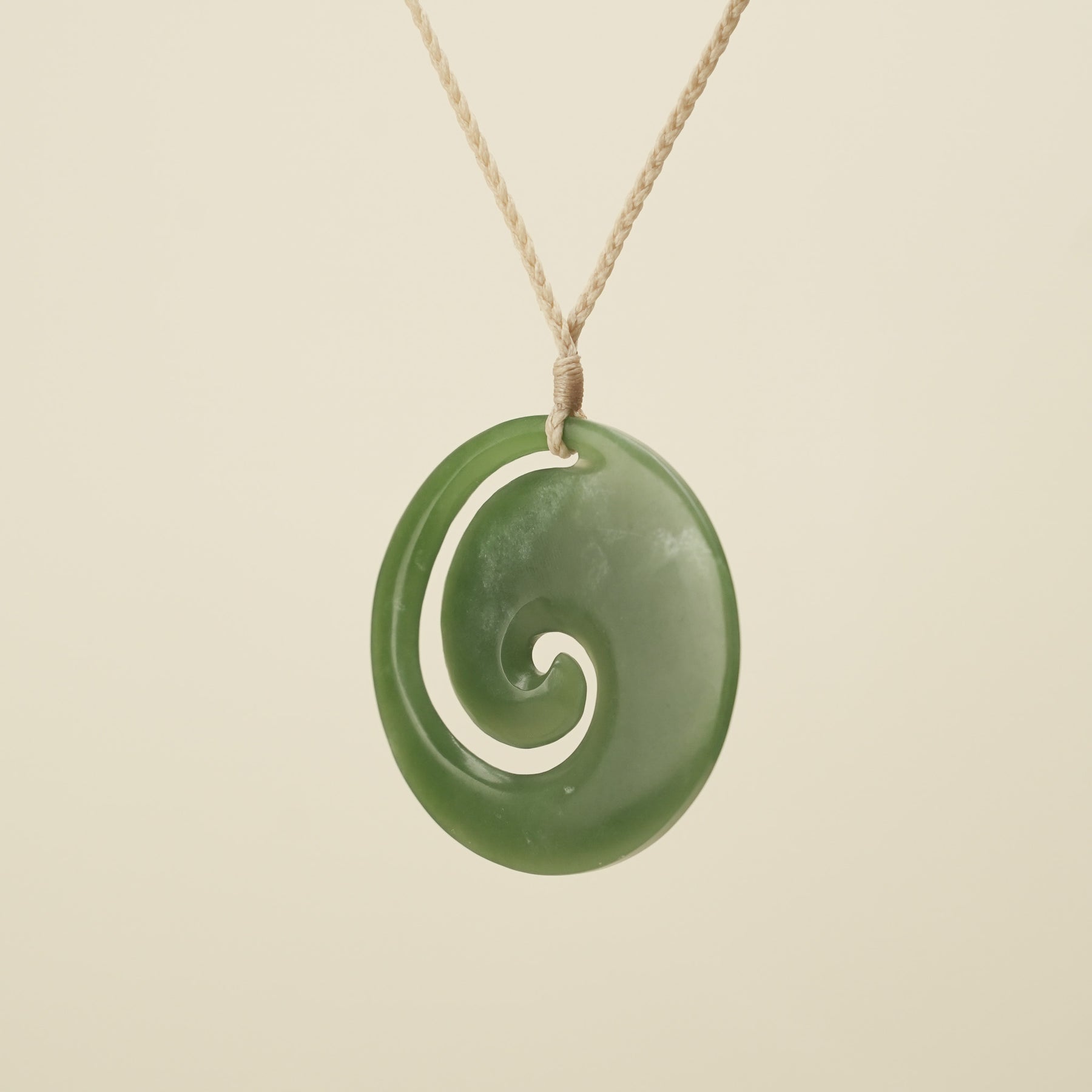 This extra large Koru pendant is carved from light green with prized Kahurangi greenstone, revealing its polished vibrant green hues as it unfurls. Symbolising new beginnings, it embodies growth, strength, and inner peace. The pendant comes with a tan adjustable cord. Presented in an eco-friendly box, it includes cards detailing its meaning and care instructions, making it a thoughtful taonga.