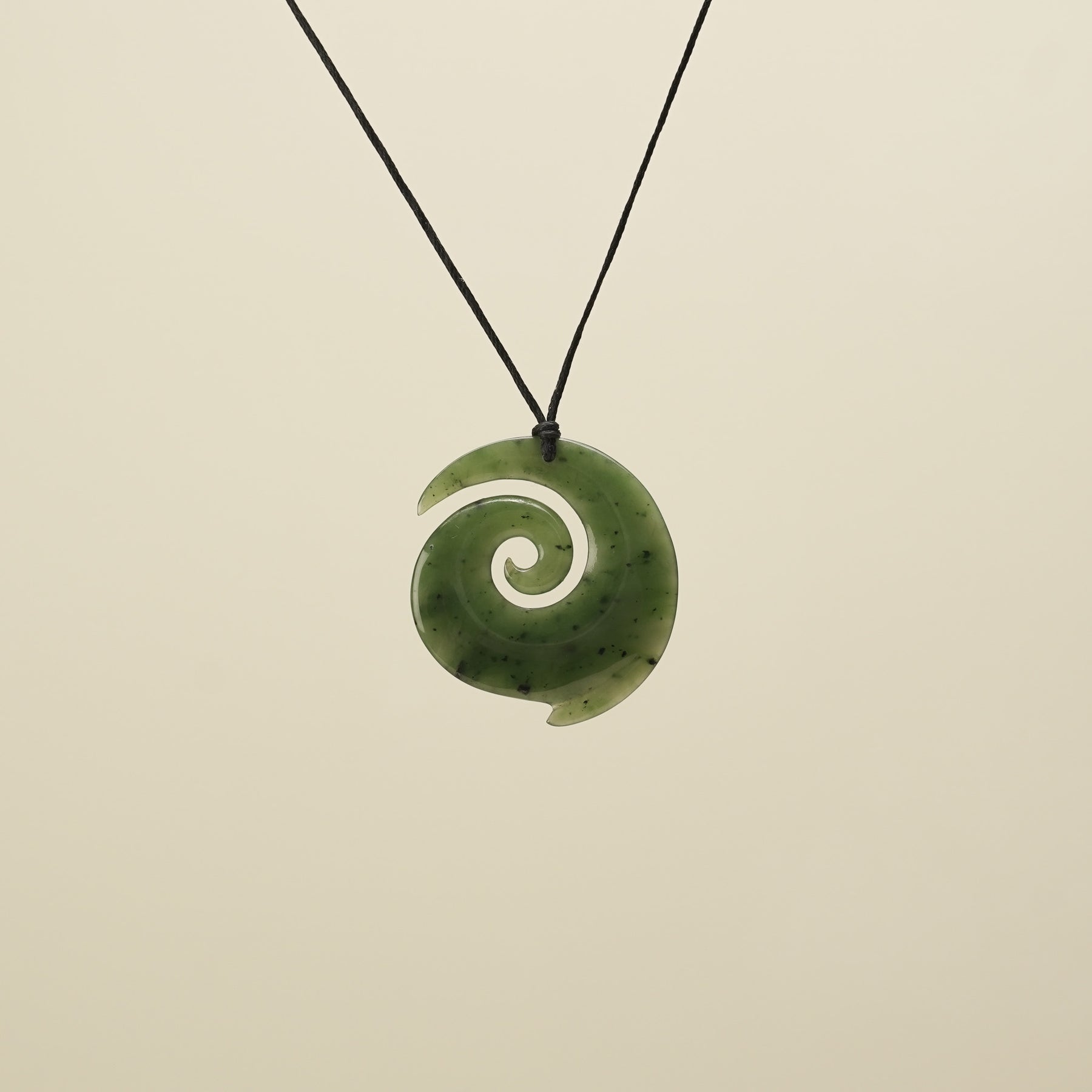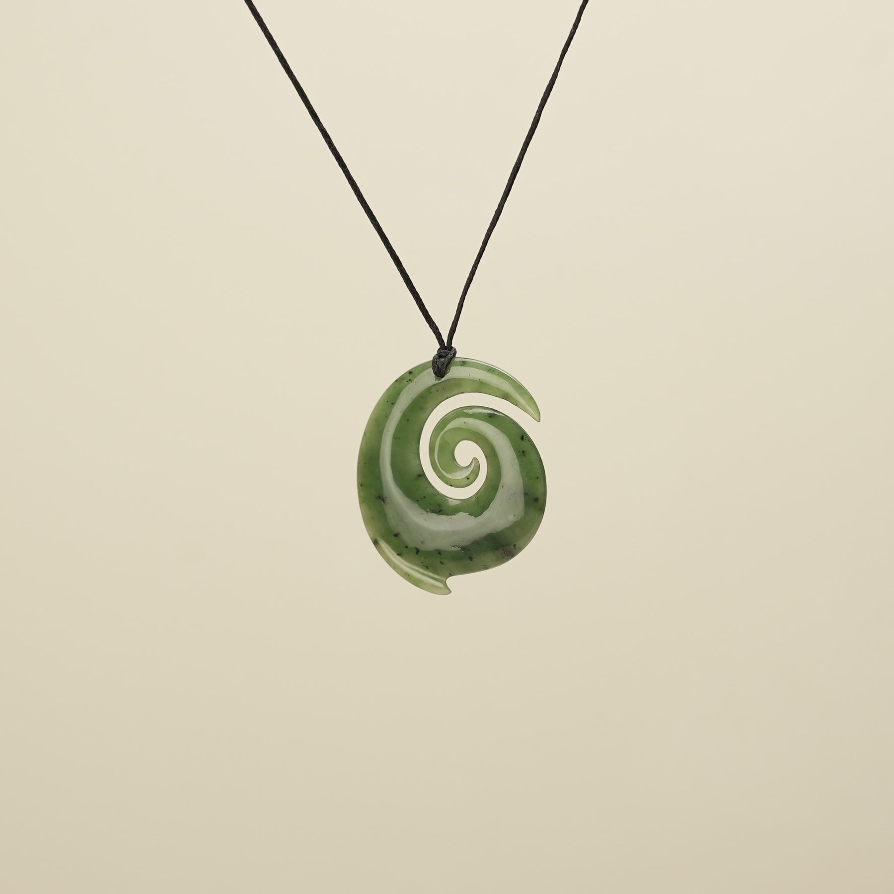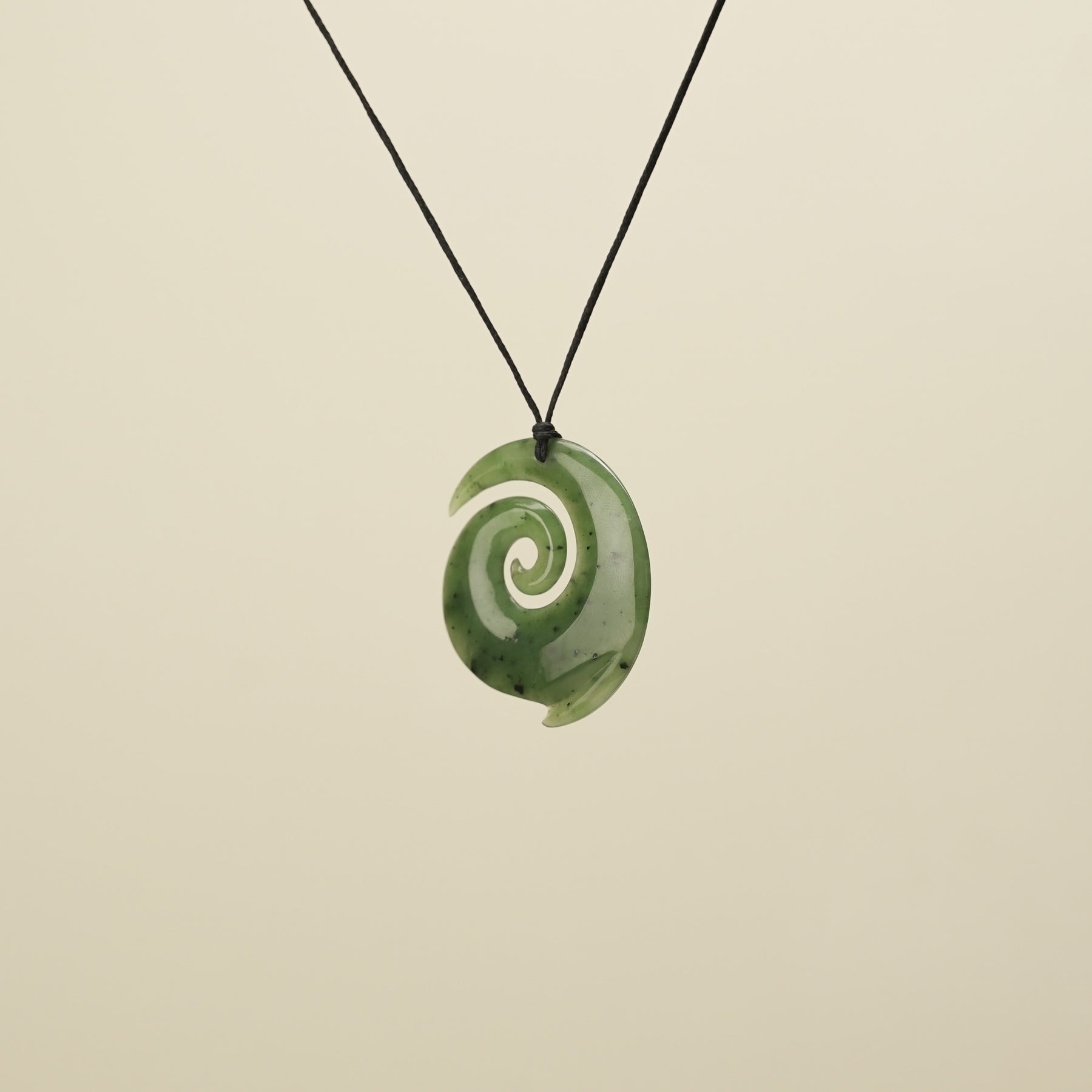 A timeless favorite, this large Koru pendant is carved from light green Kahurangi greenstone, revealing its polished green hues as it unfurls. Symbolising new beginnings, it embodies growth, strength, and inner peace. The pendant comes with an adjustable black cord. Presented in an eco-friendly box, it includes cards detailing its meaning and care instructions, making it a thoughtful taonga.