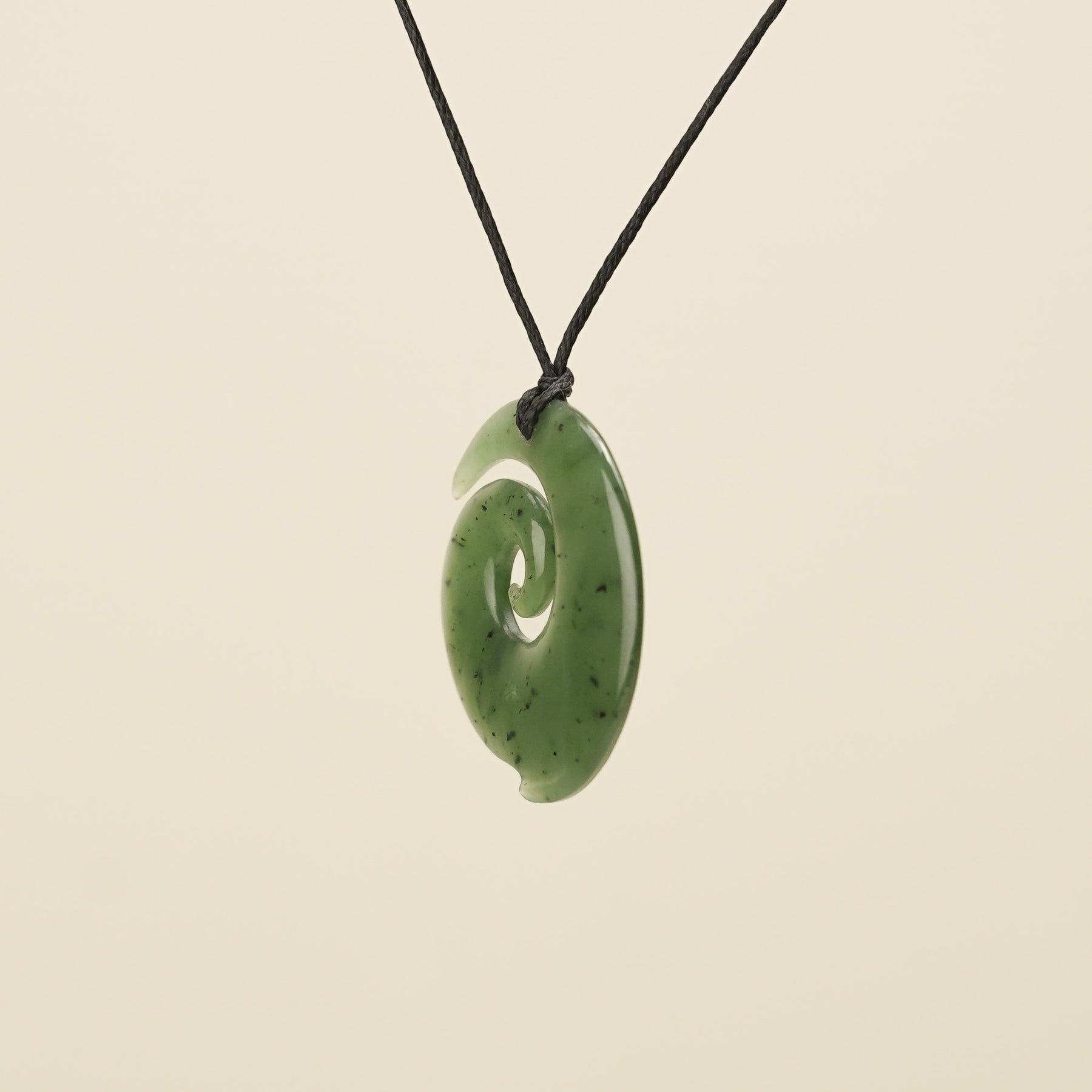 A timeless favorite, this large Koru pendant is carved from light green Kahurangi greenstone, revealing its polished green hues as it unfurls. Symbolising new beginnings, it embodies growth, strength, and inner peace. The pendant comes with an adjustable black cord. Presented in an eco-friendly box, it includes cards detailing its meaning and care instructions, making it a thoughtful taonga.