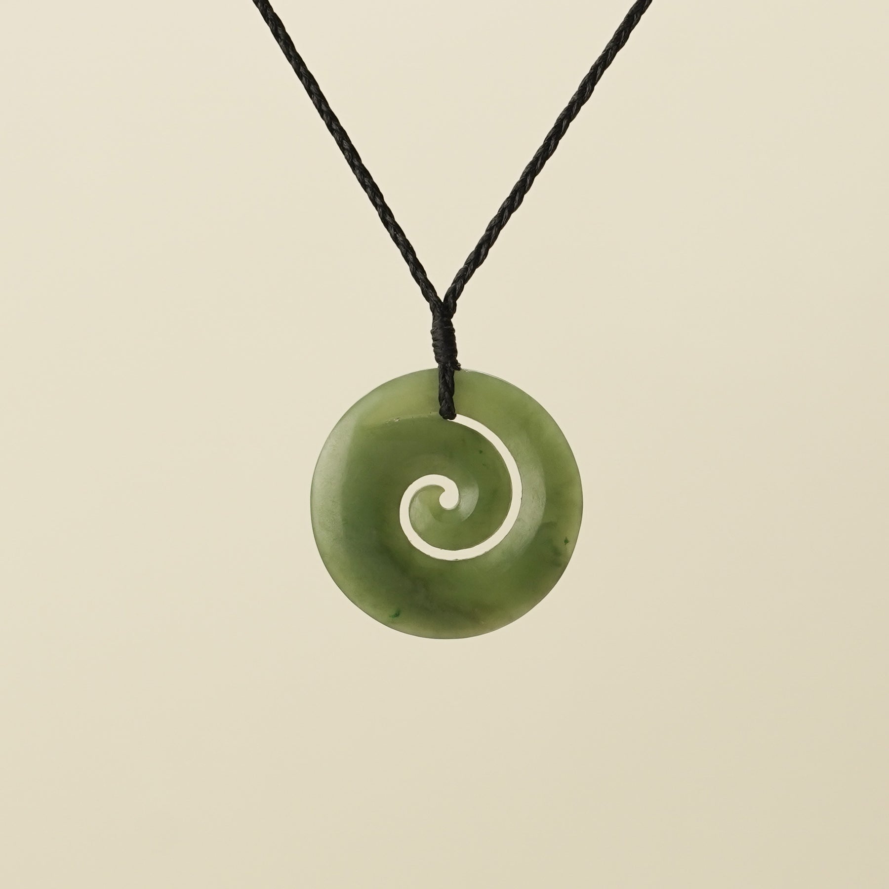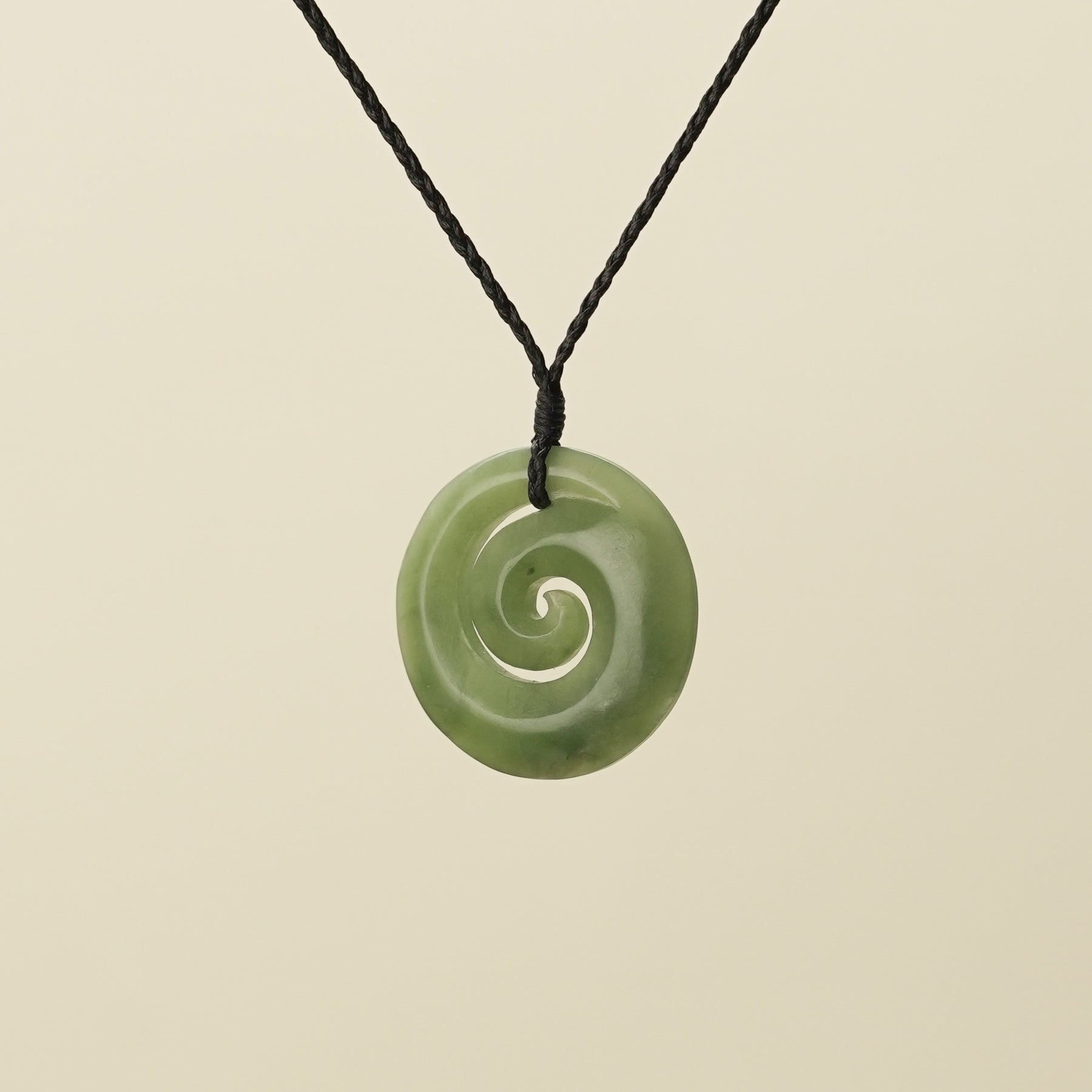 A timeless favourite, this medium-sized Koru pendant is carved from Kahurangi Pounamu, enhanced by its matte finish. Symbolising new beginnings, it embodies growth, strength, and inner peace. The pendant comes with a black hand-woven, adjustable cord. Presented in an eco-friendly box, it includes cards detailing its meaning and care instructions, making it a thoughtful taonga.