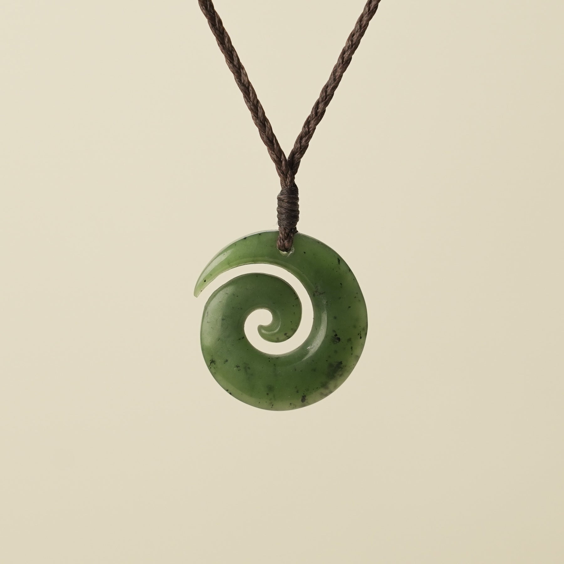 This small koru greenstone pendant features a timeless, classic design that unfolds gracefully to symbolise new beginnings, growth, and tranquility. Carved from Kahurangi greenstone, it carries a calming depth that inspires harmony and balance. It comes complete with a bound, hand-woven, adjustable cord in your choice of black, brown, tan, or khaki. Presented in an eco-friendly box and accompanied by meaning cards that explain its cultural significance and offer care instructions, this pendant is a meaningful taonga - a thoughtful gift for any shared journey.