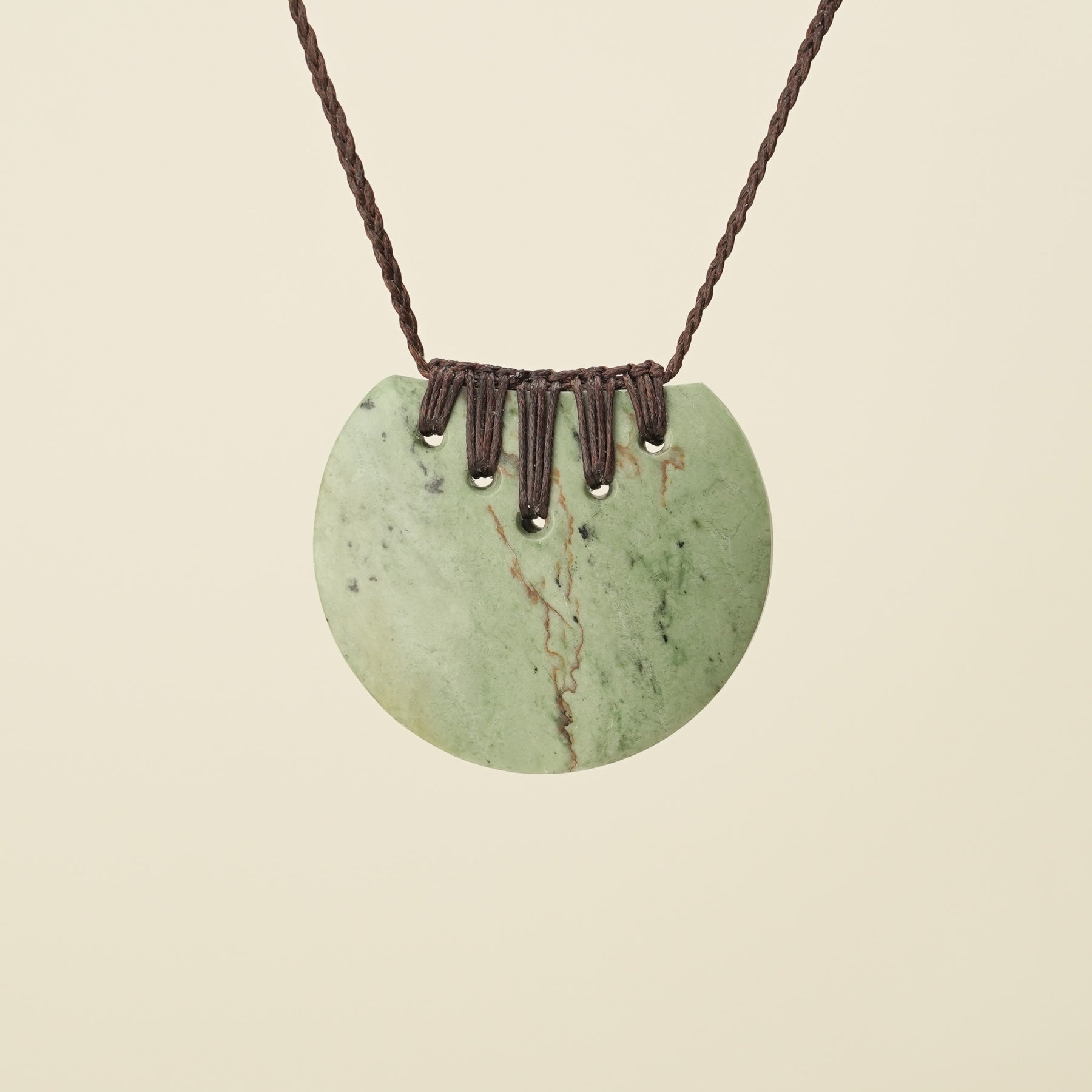 The breastplate (Kōuma), hand-carved from New Zealand's beautiful Kokopu pounamu, symbolises both physical and symbolic protection when worn over the torso. Showcasing speckles of light brown and dark green, this breastplate features an adjustable brown, handwoven cord for comfort. Presented in an eco-friendly box, it includes cards detailing its meaning and care—making it a treasured taonga.