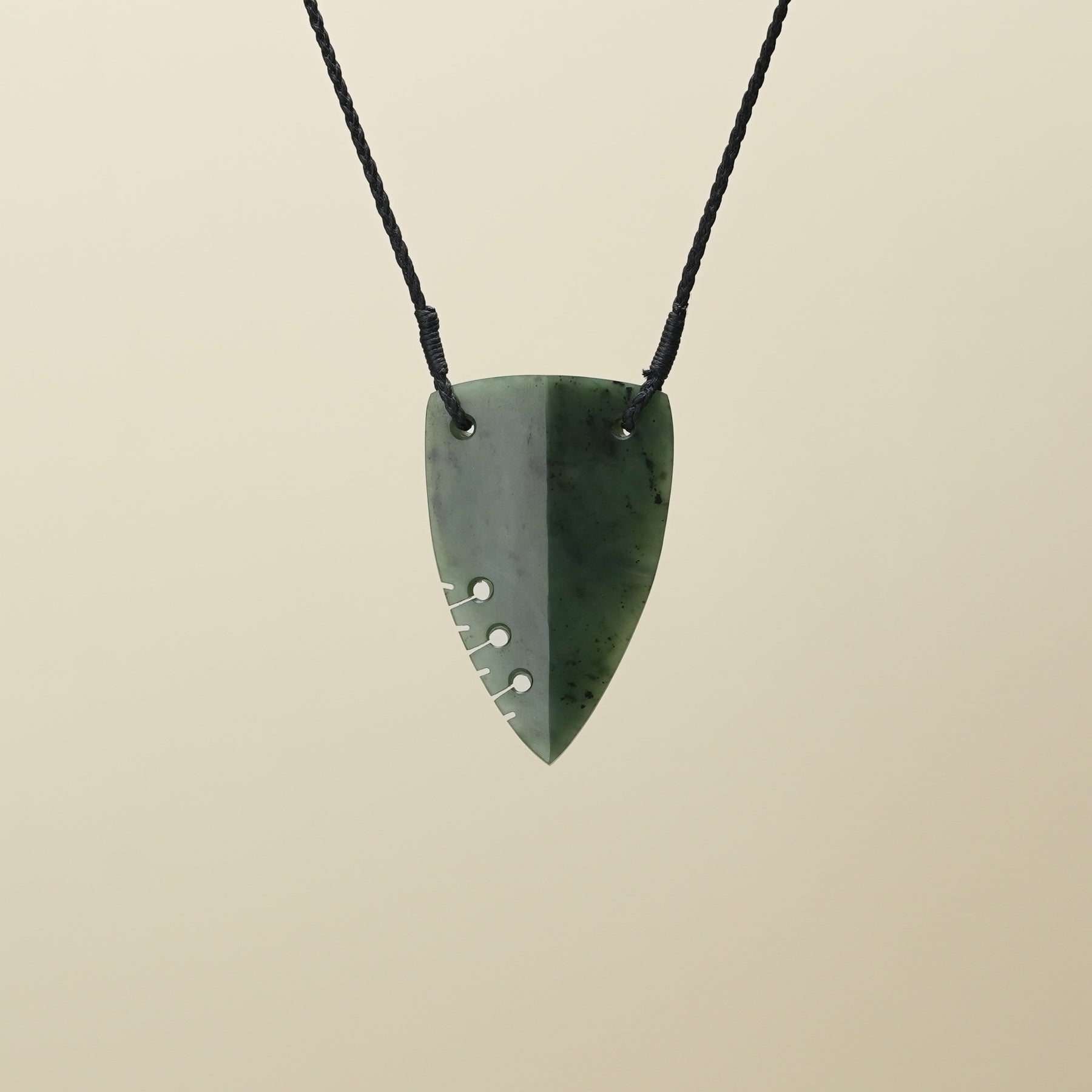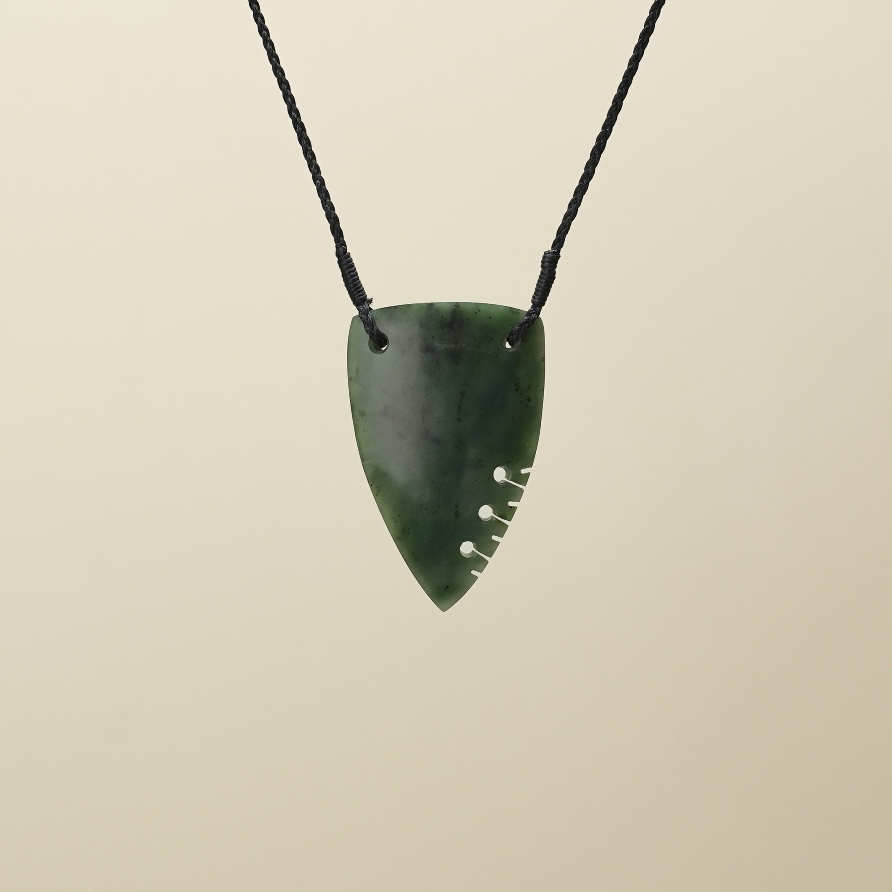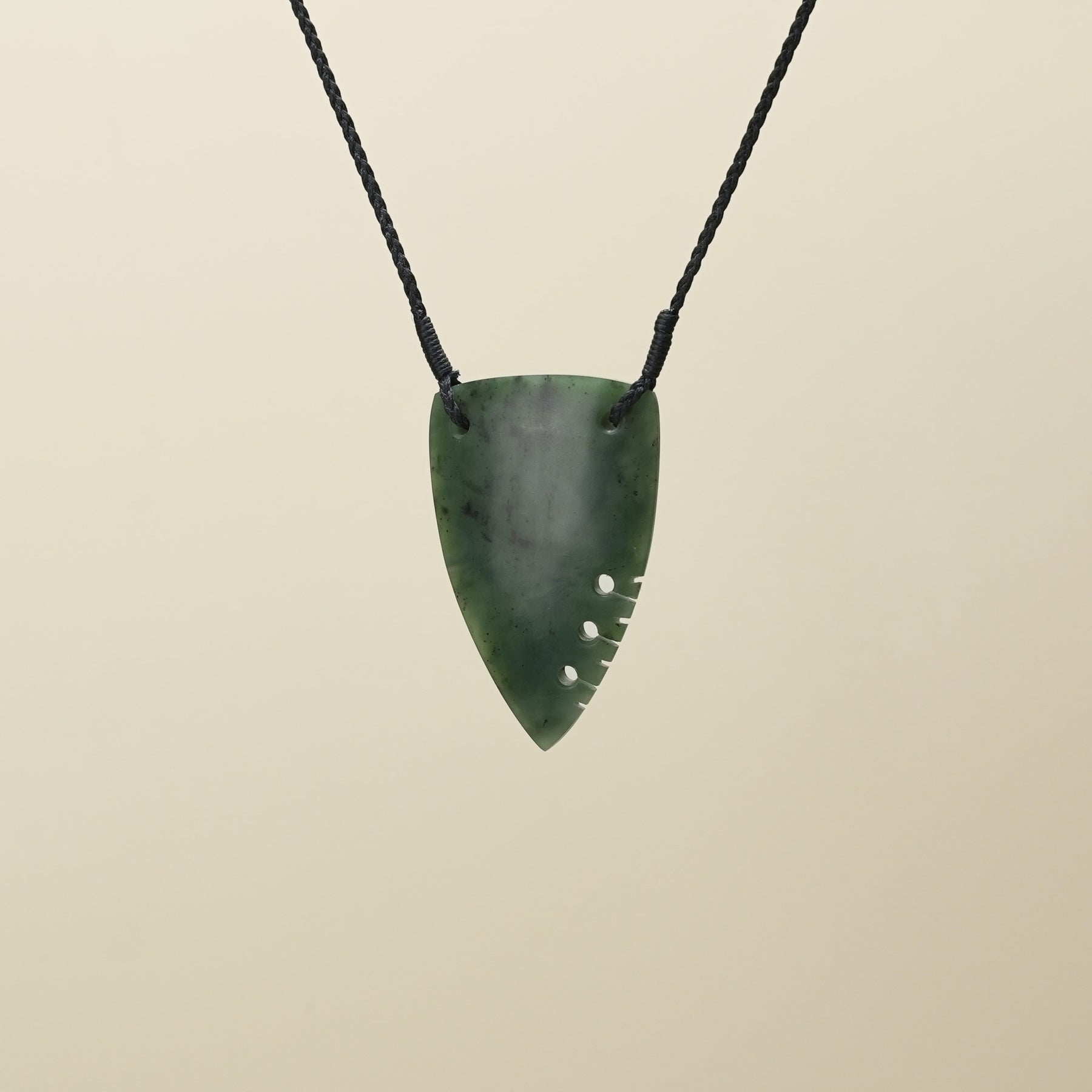 The Niho (tooth) design symbolises the guardianship and strength of whales and sharks in Māori culture. Carved from New Zealand's West Coast Kahurangi Pounamu, showcases beautiful translucent green tones & Inanga marblindg, adding unique character to each piece. Representing protection and a deep connection to the moana (ocean).