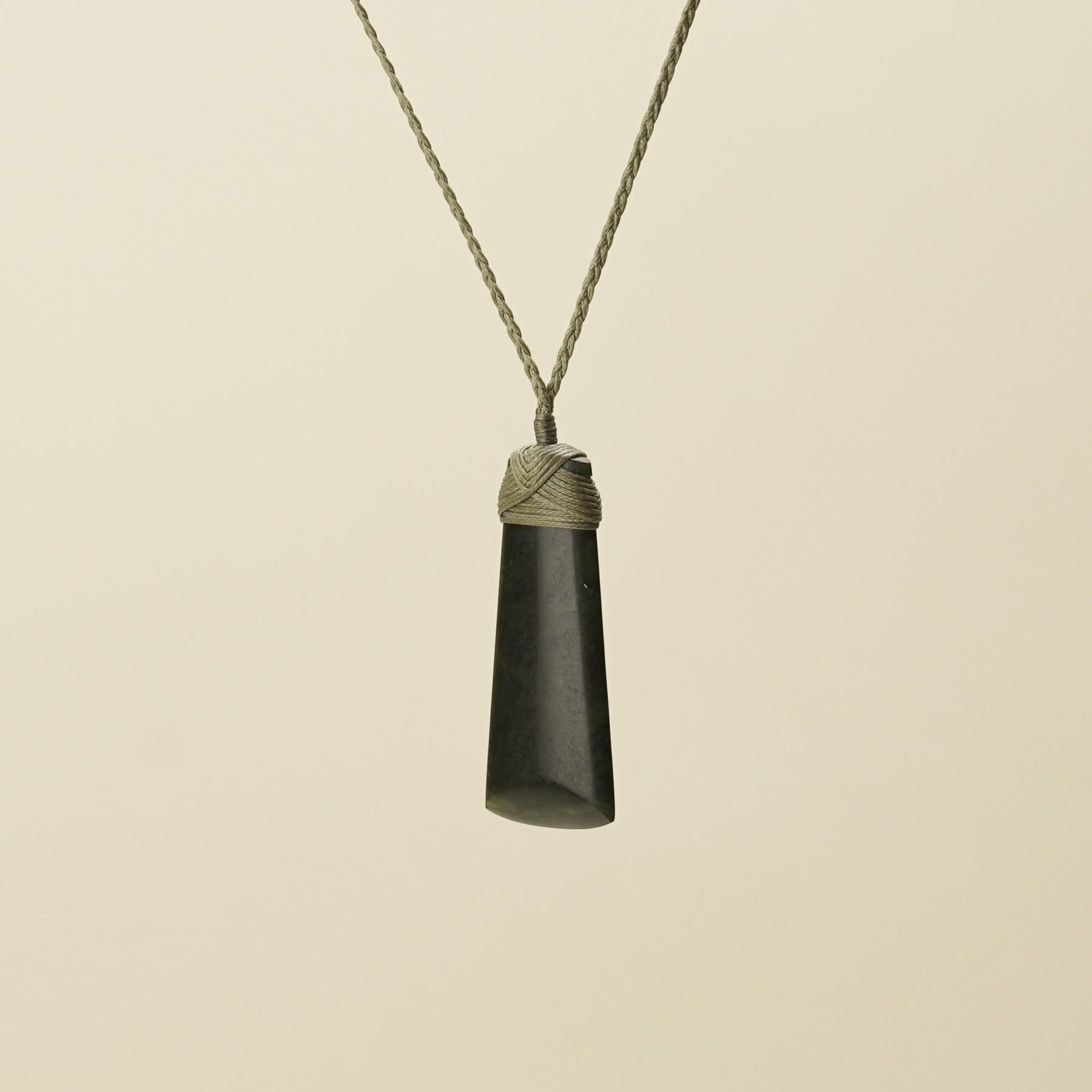 Carved in our Arrowtown workshop from rich kawakawa pounamu, this one-off Toki pendant symbolises strength and leadership. Its bush green hues are enhanced by its matte finish, beautifully highlighting the natural beauty of Aotearoa’s pounamu. Paired with an adjustable handwoven khaki cord for a personalised fit, this remarkable Toki is elegantly presented in an eco-friendly box, accompanied by cards detailing its meaning and care—a truly cherished taonga.