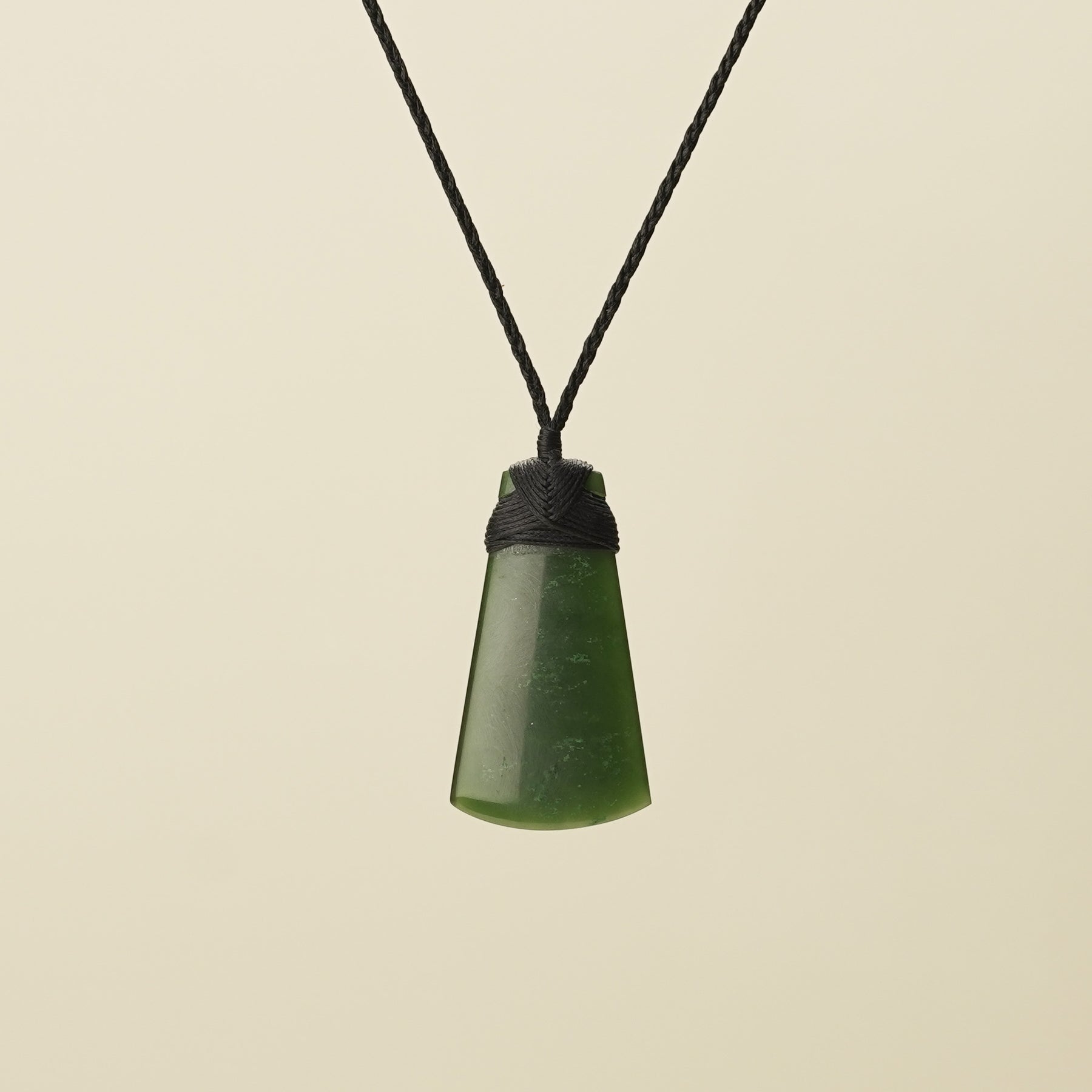 Carved in our Arrowtown workshop from rich kawakawa pounamu, this one-off Toki pendant symbolises strength and leadership. Its deep green tones with vibrant green speckles, combined with a polished finish, beautifully highlight the natural beauty of Aotearoa’s pounamu. Paired with an adjustable handwoven black cord for a personalised fit, this remarkable Toki is elegantly presented in an eco-friendly box, accompanied by cards detailing its meaning and care—a truly cherished taonga.