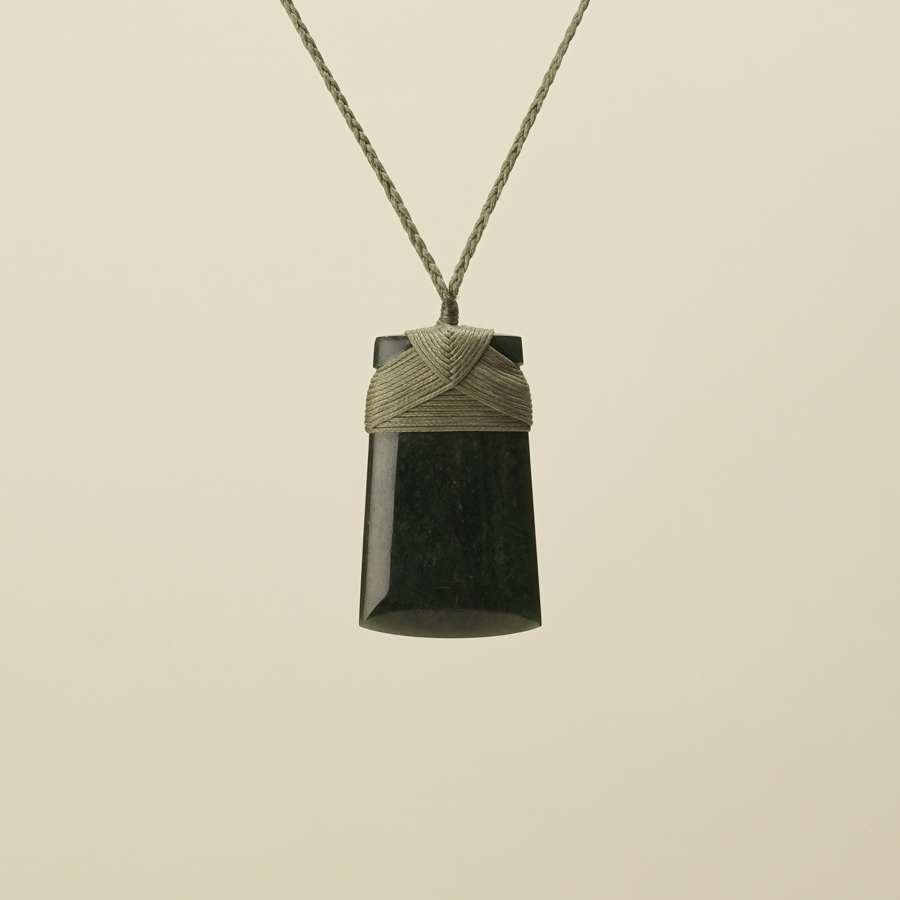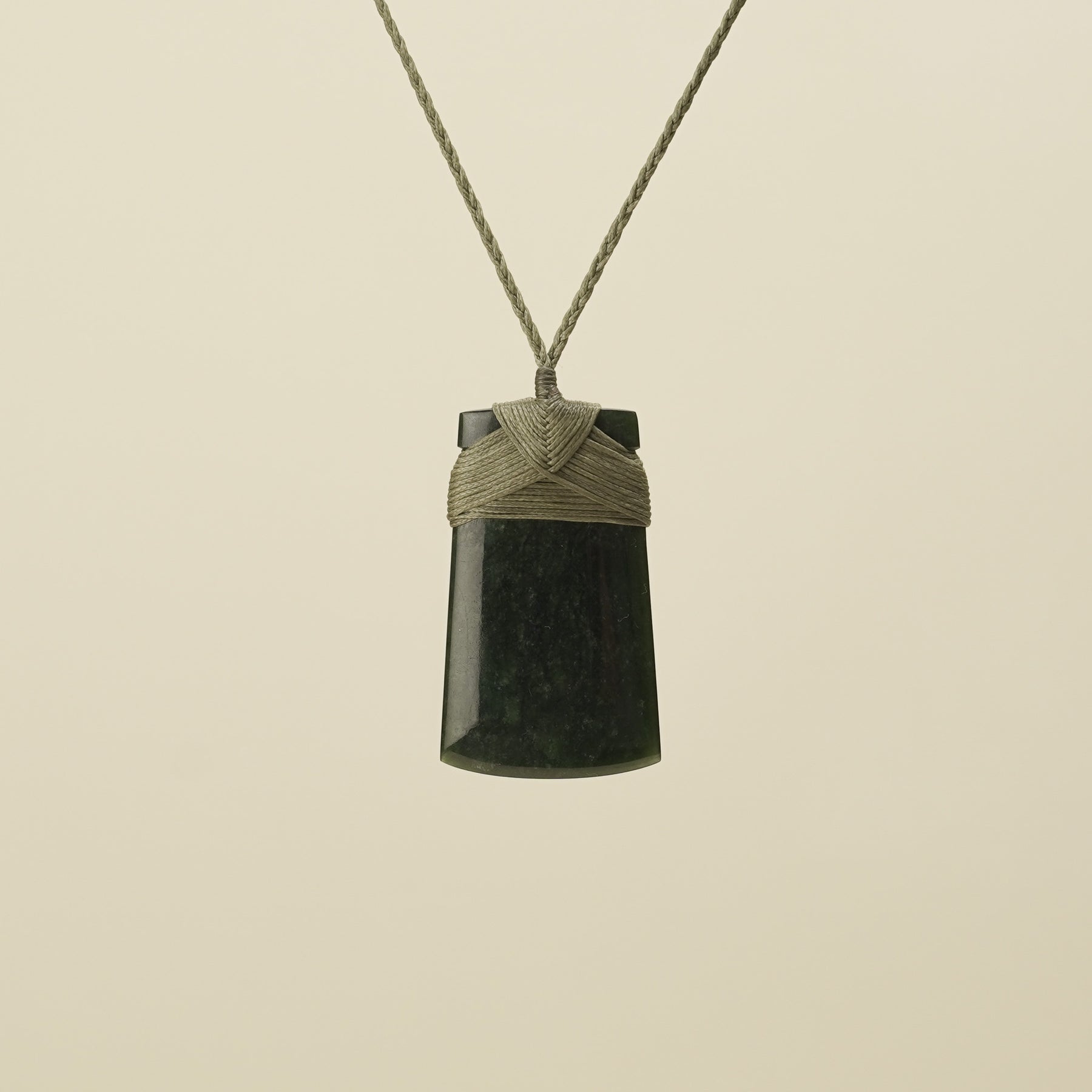 Carved in our Arrowtown workshop from rich Kawakawa pounamu, this one-off medium large Toki pendant symbolises strength and leadership. Its strong green tones and lighter flecks, enhanced by its polished finish, beautifully highlight the natural beauty of Aotearoa’s pounamu. Paired with an adjustable handwoven khaki cord for a personalised fit, this remarkable Toki is elegantly presented in an eco-friendly box, accompanied by cards detailing its meaning and care—a truly cherished taonga.