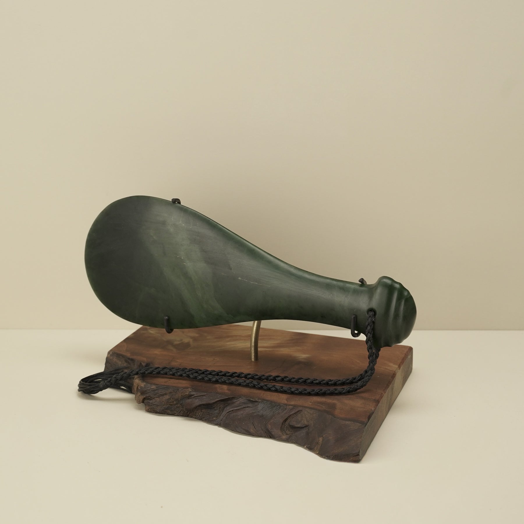 This large Mere sculpture is crafted from prized Kawakawa greenstone - a beautifully made taonga that showcases deep green tones and darker flecks. Its polished finish enhances the stone’s natural beauty, reflecting the essence of Aotearoa’s treasured greenstone. Resting gracefully on a base of native wood, it holds a commanding yet elegant presence.