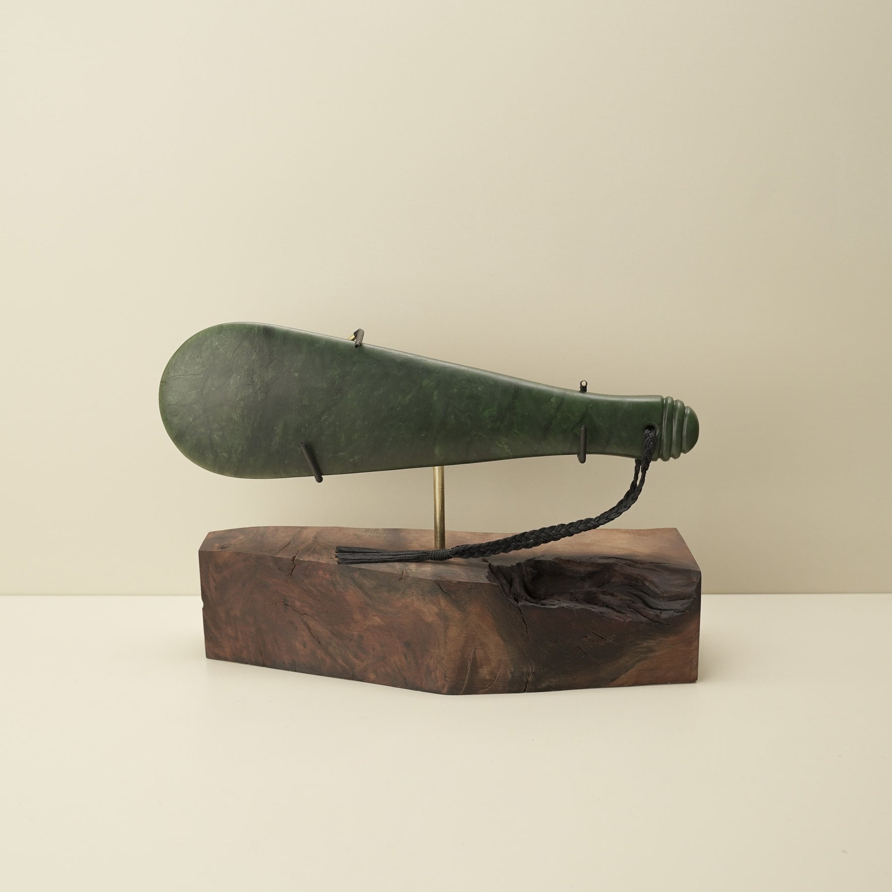 This large Mere sculpture is crafted from prized Kawakawa greenstone - a beautifully made taonga that showcases deep green tones and darker flecks. Its polished finish enhances the stone’s natural beauty, reflecting the essence of Aotearoa’s treasured greenstone. Resting gracefully on a base of native wood, it holds a commanding yet elegant presence.