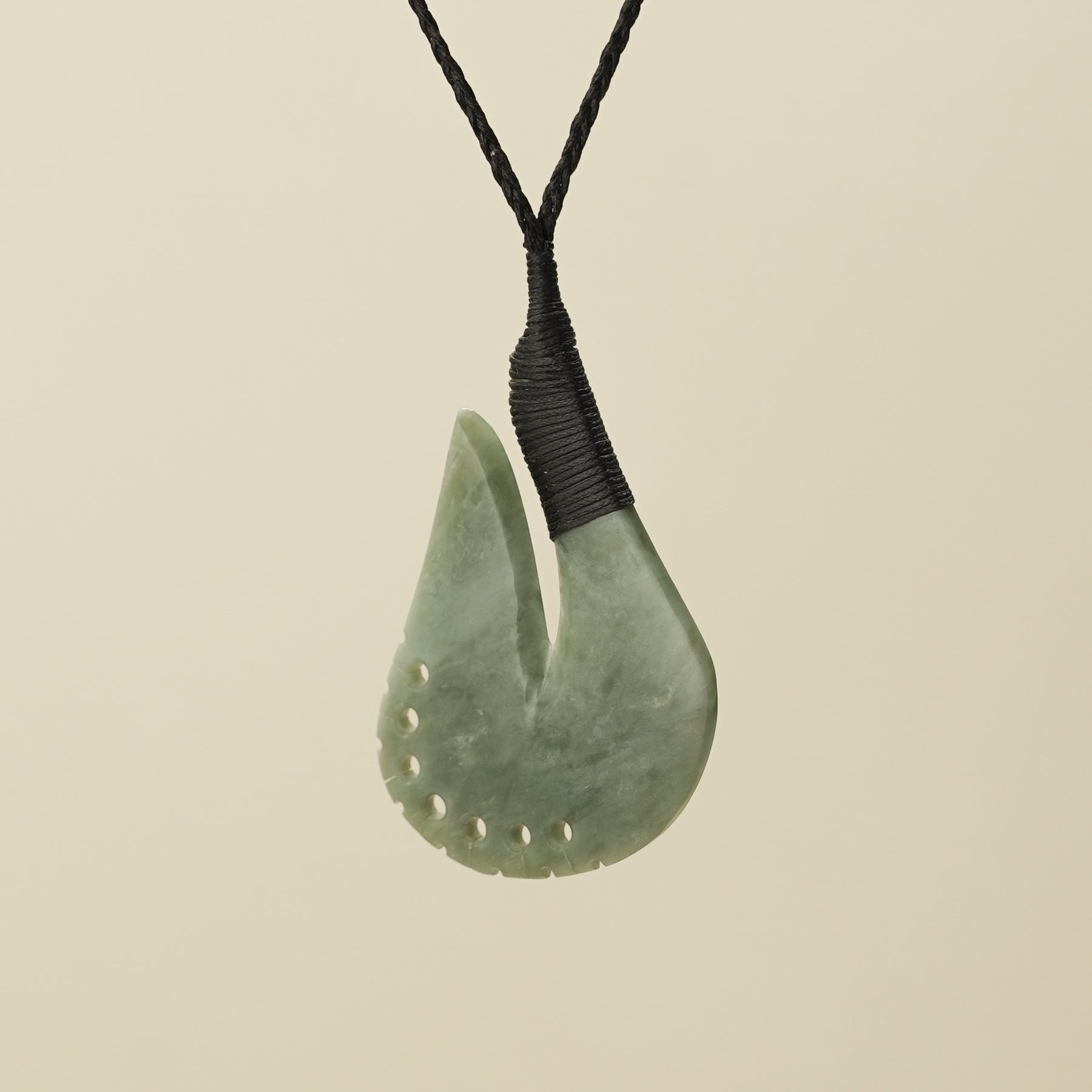 Carved from New Zealand Inanga (pounamu), this large Hei Matau pendant is a treasured piece of traditional craftsmanship. Inanga is a highly prized variety of greenstone, showcasing its soft greyish green hue with subtle darker ripples. The carved notches reflect traditional Māori carving, historically symbolising whakapapa (genealogy) and the passing of wisdom between generations. Today, these notches may also represent whānau members or loved ones, adding personal meaning to each pendant.