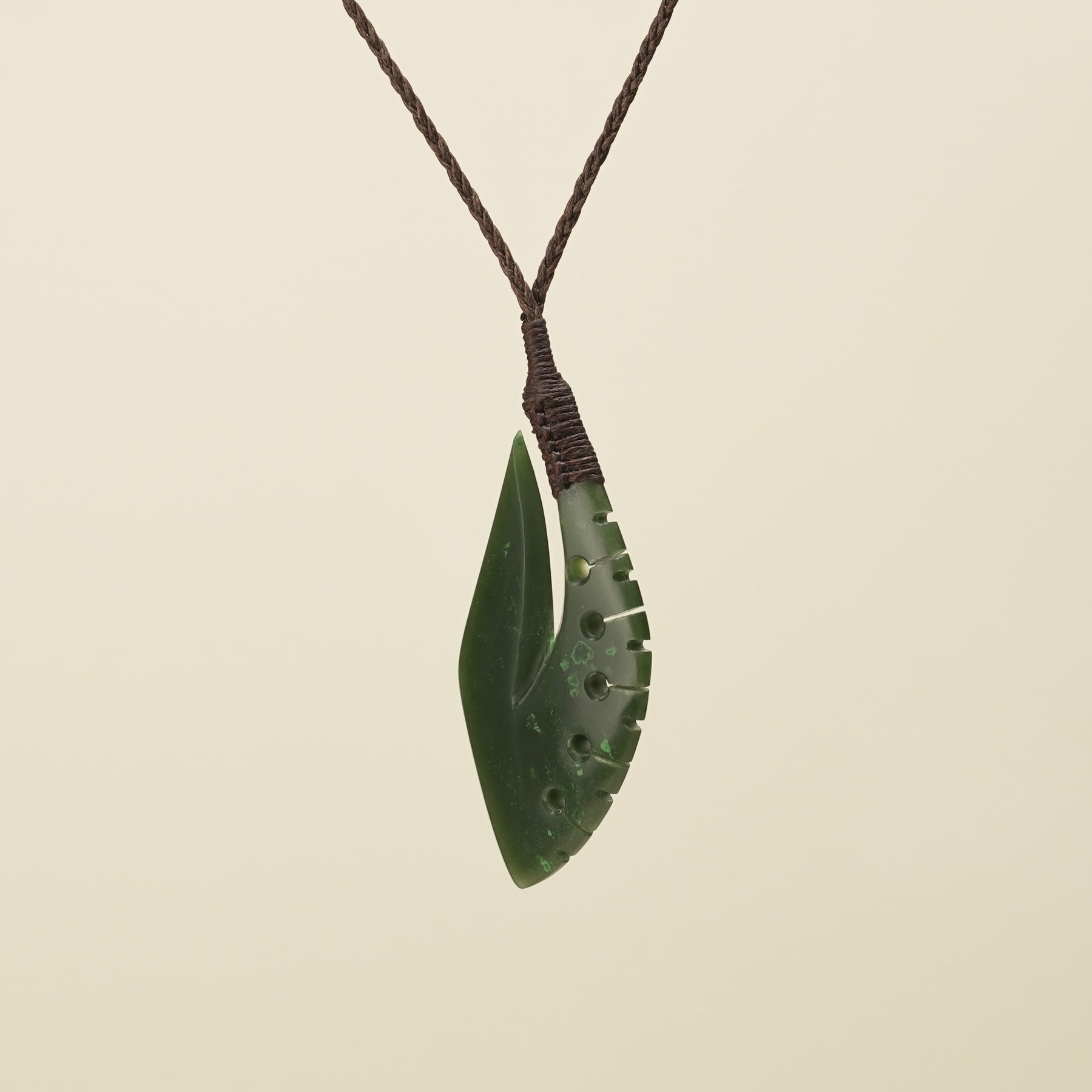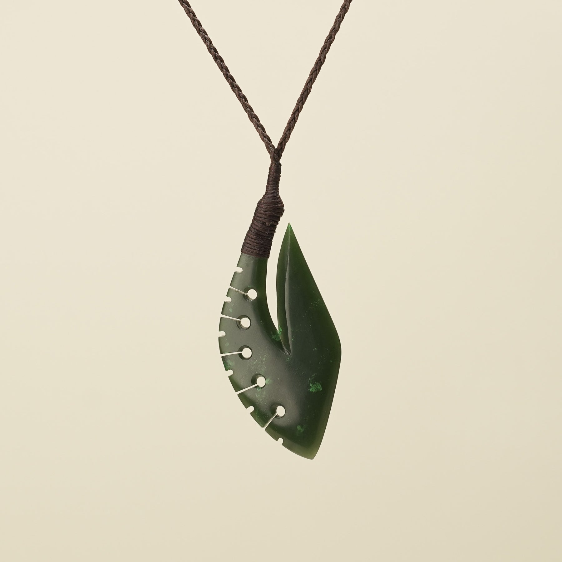 Notched Hei Matau Kawakawa Greenstone Medium Large Pendant, Brown Binding