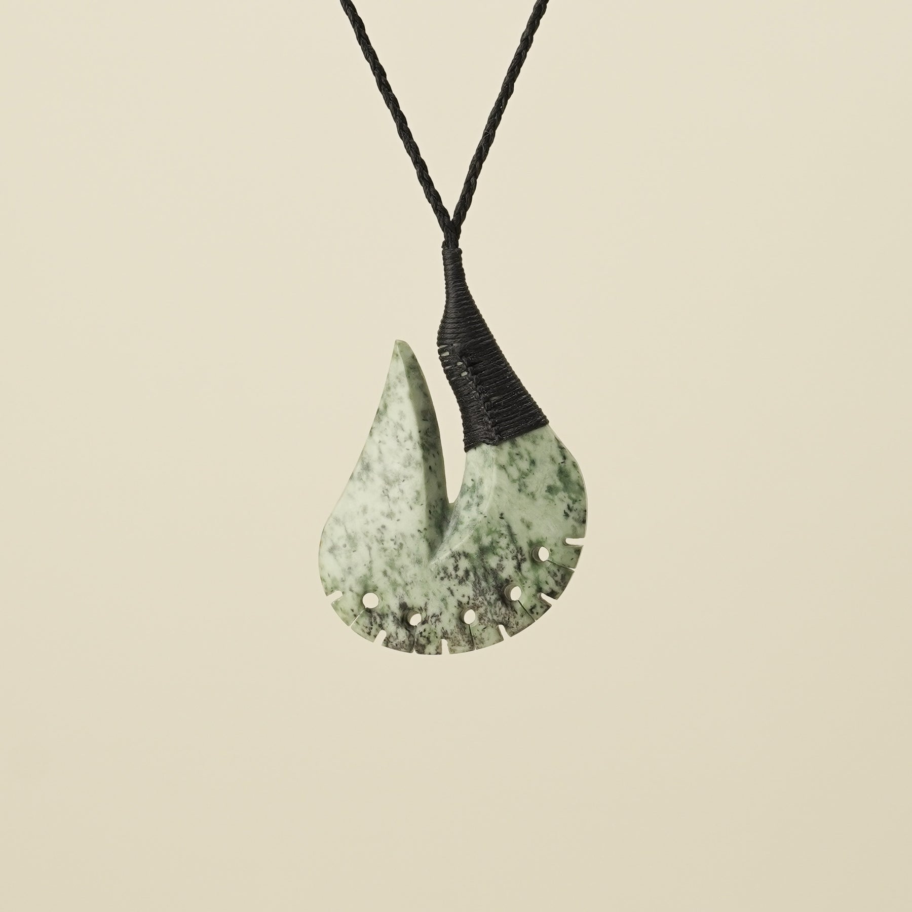 Notched Hei Matau Kōkopu Greenstone Large Pendant, Black Binding