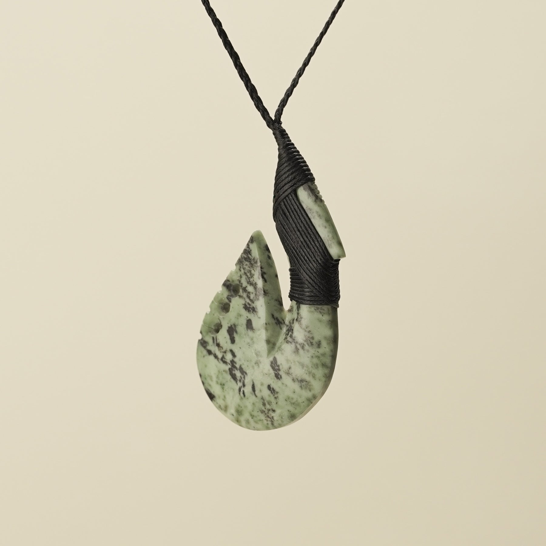 Notched Hei Matau Kōkopu Greenstone Large Pendant, Black Binding