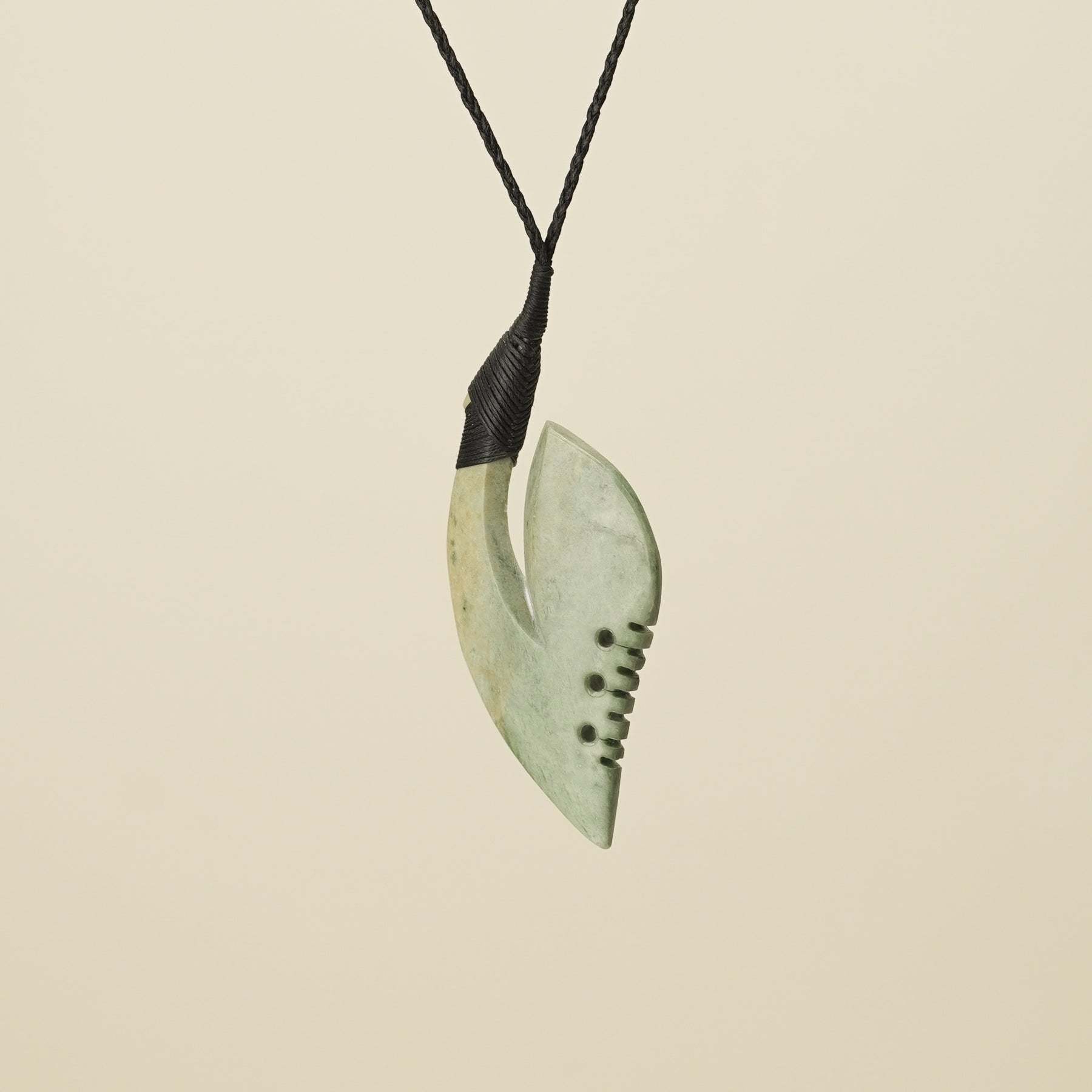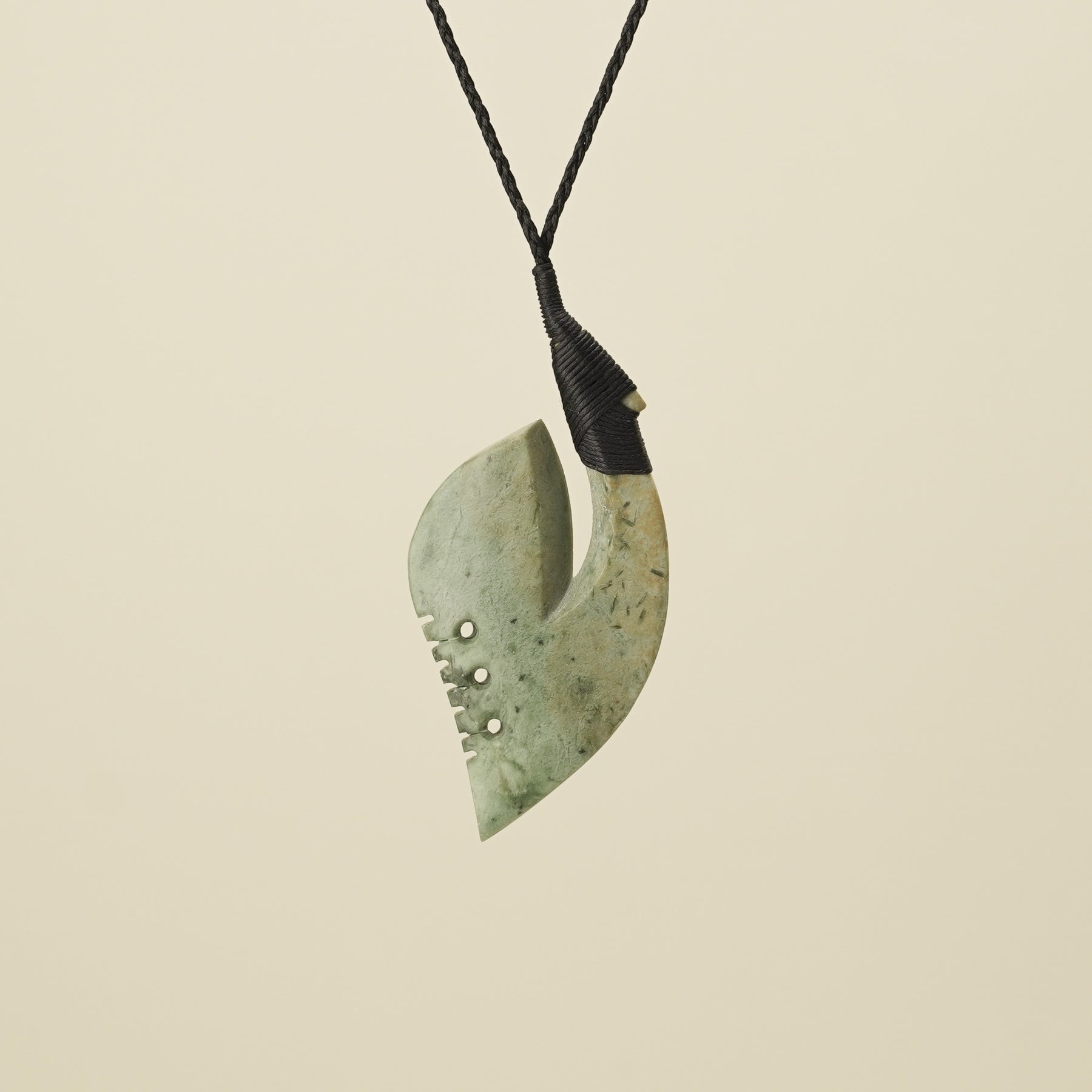 Carved from New Zealand Raukaraka (pounamu), this large Hei Matau pendant is a treasured piece of traditional craftsmanship. The pendant showcases a light green tones with inclusions of marbled speckles. The carved notches reflect traditional Māori carving, historically symbolising whakapapa (genealogy) and the passing of wisdom between generations. Today, these notches may also represent whānau members or loved ones, adding personal meaning to each pendant.