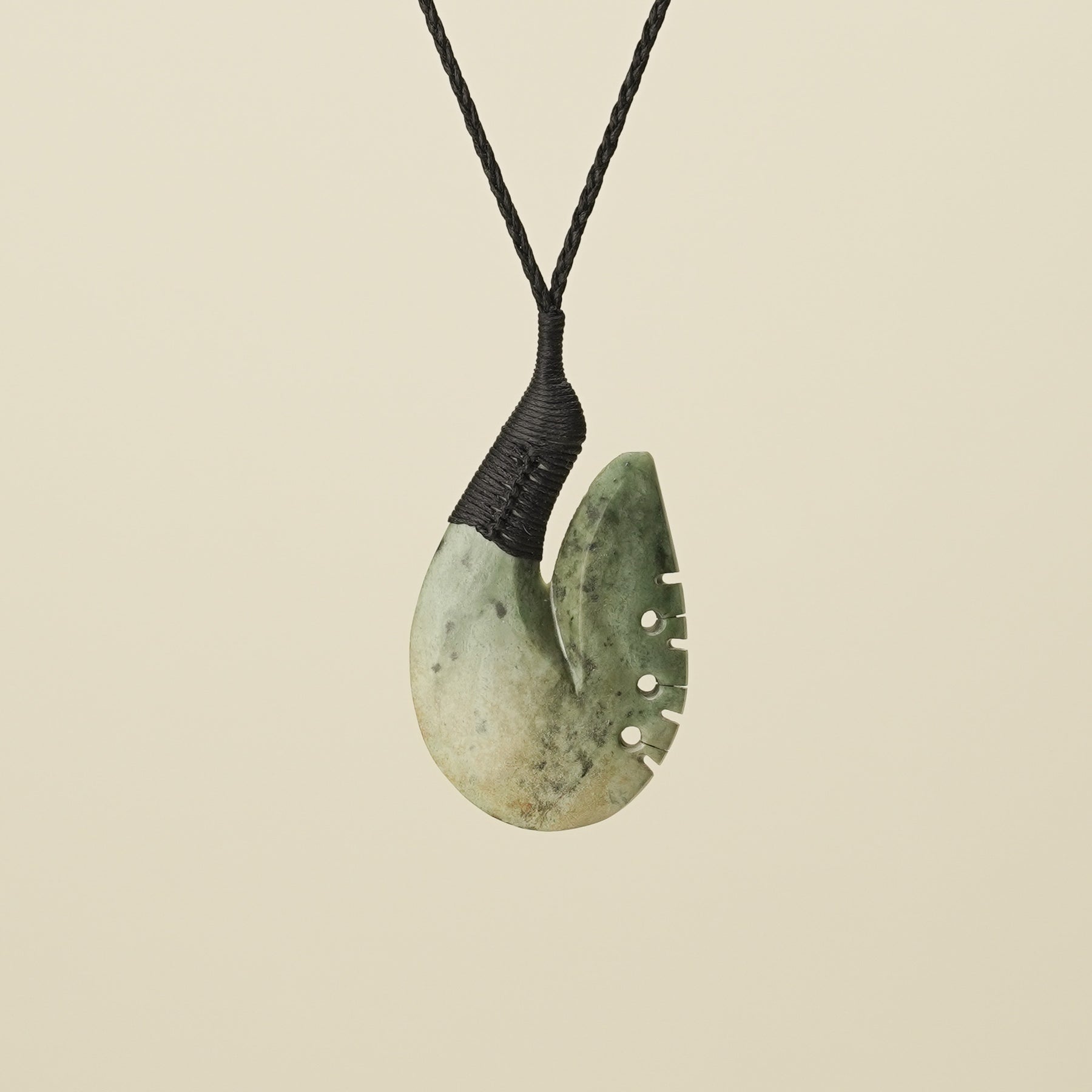 Carved from New Zealand Raukaraka (pounamu), this medium Hei Matau pendant is a treasured piece of traditional craftsmanship. The pendant showcases a light green tones with inclusions of marbled speckles. The carved notches reflect traditional Māori carving, historically symbolising whakapapa (genealogy) and the passing of wisdom between generations. Today, these notches may also represent whānau members or loved ones, adding personal meaning to each pendant.