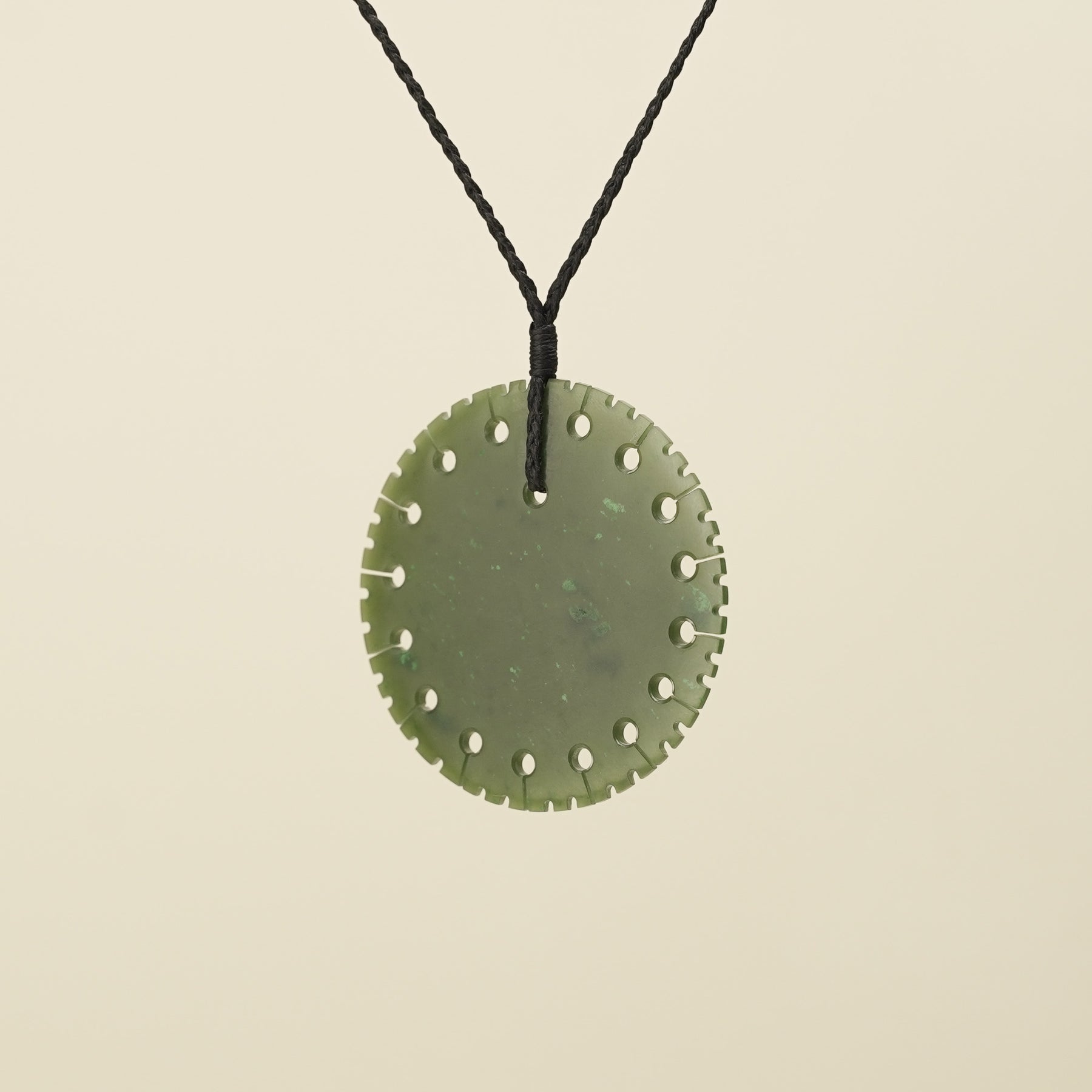 The large Porowhita pendant embodies the circle of life, symbolising self-discovery and life's continuous cycles. Hand-carved from Kahurangi greenstone, prized for its distinct light-green hue, it also features luminous green flecks.