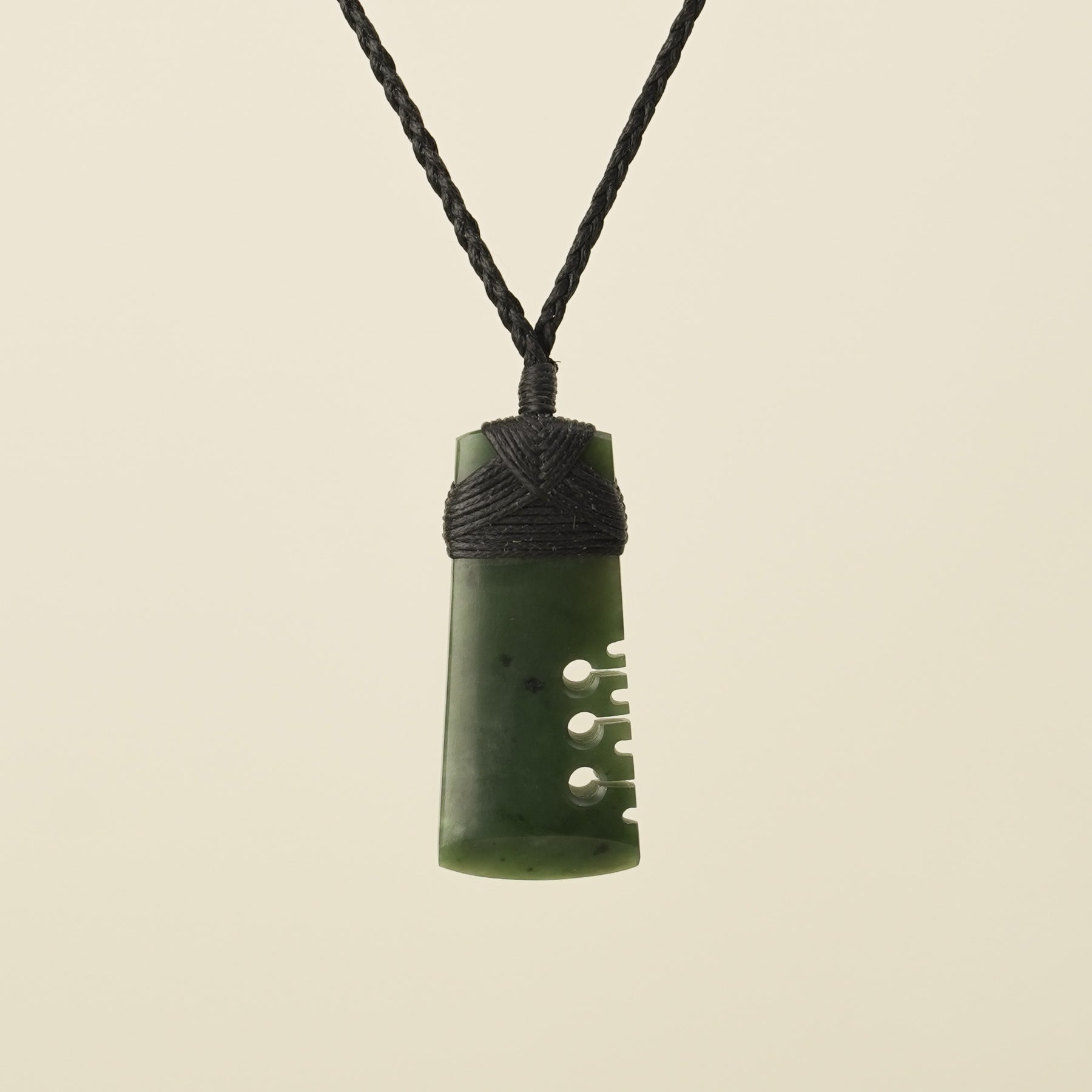 Notched Toki Kawakawa Greenstone Small Pendant, Black Binding