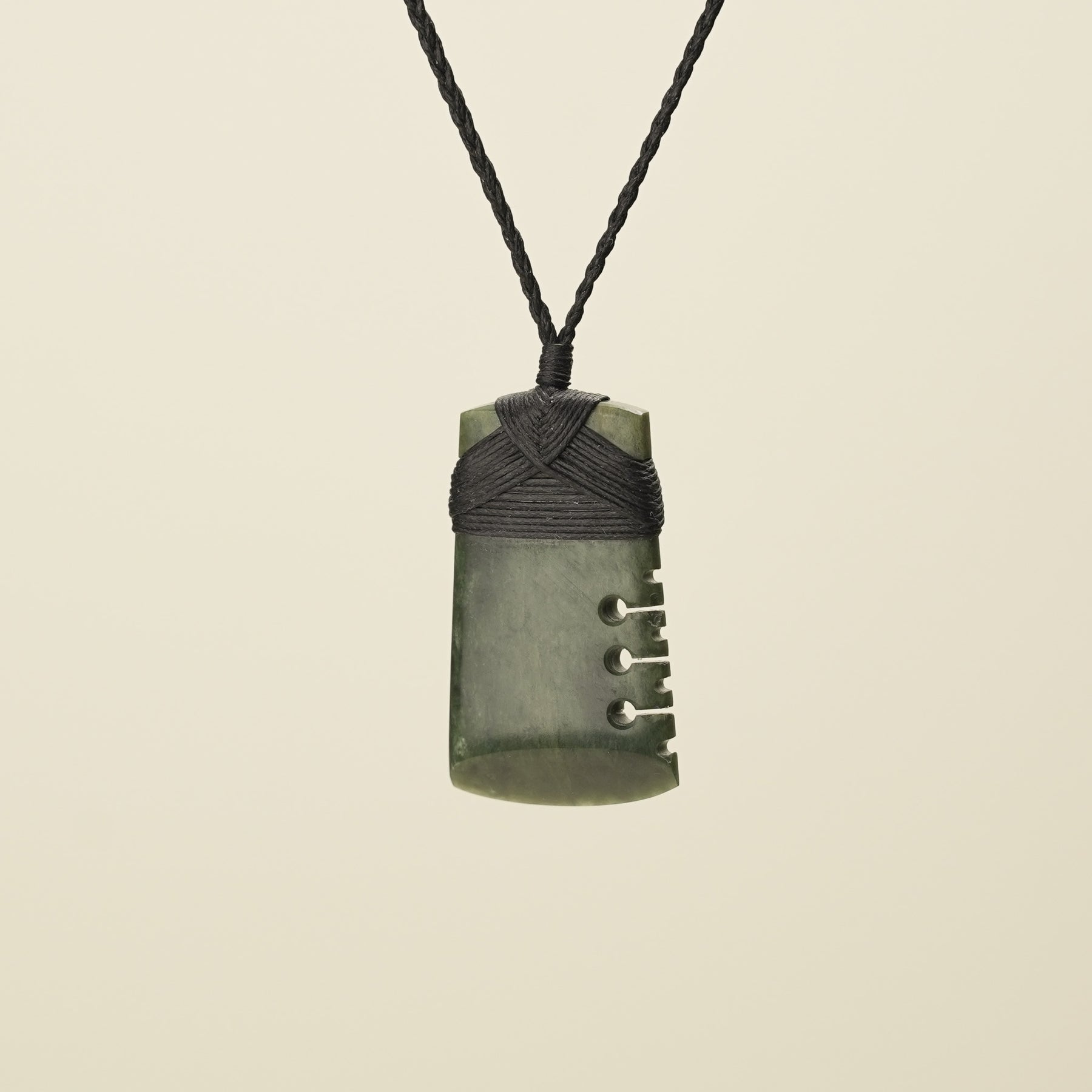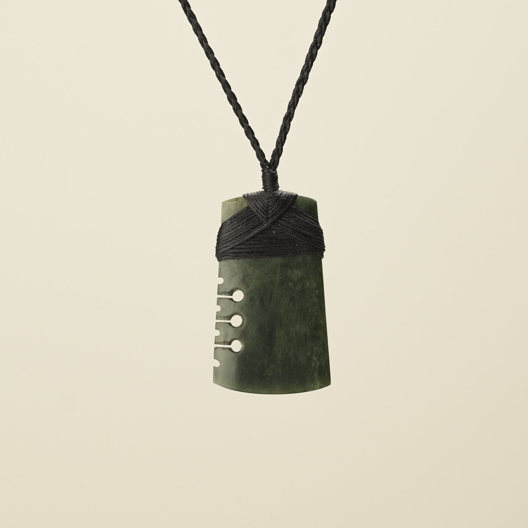 The medium Toki pendant is hand-carved from Kawakawa Pounamu. Symbolising strength, determination, and bravery, the pendant features a polished finish with natural deep green tones and black inclusions. The carved notches reflect traditional Māori carving, historically symbolising whakapapa (genealogy) and the passing of wisdom between generations. Today, these notches may also represent whānau members or loved ones, adding personal meaning to each pendant.