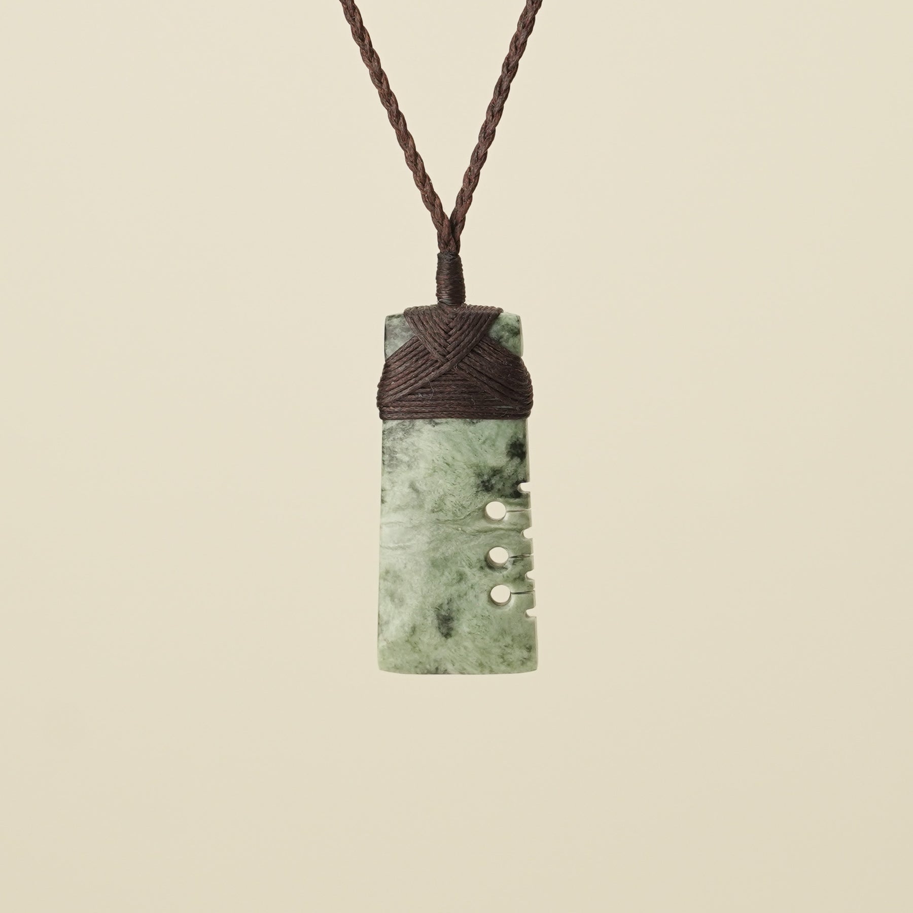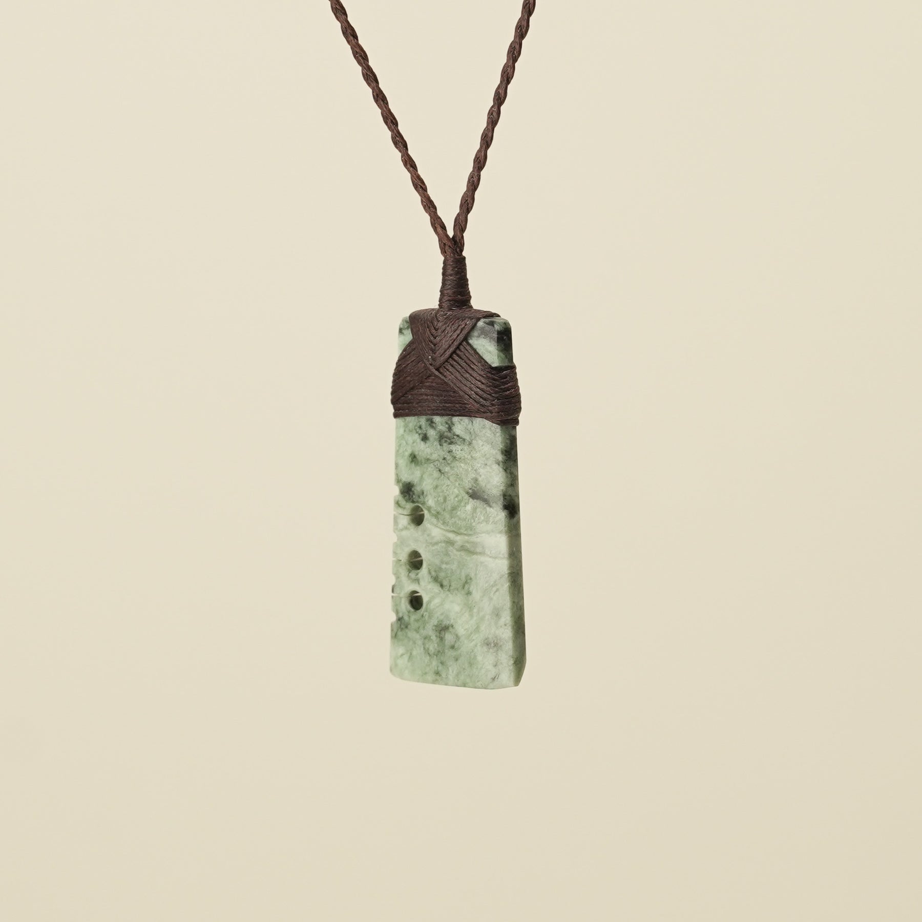 Symbolising strength, determination, and bravery, it features a distinctive matte finish with natural green specks. Paired with an adjustable brown handwoven cord for a personalised fit, the pendant is presented in an eco-friendly box with a Toki meaning and care card.