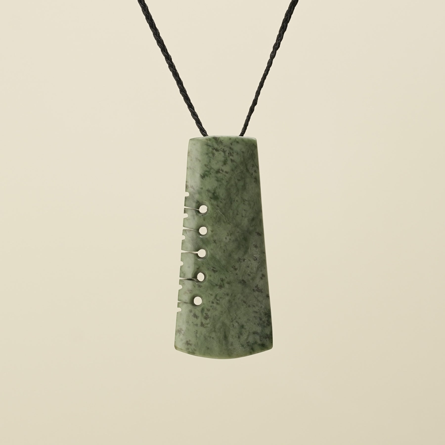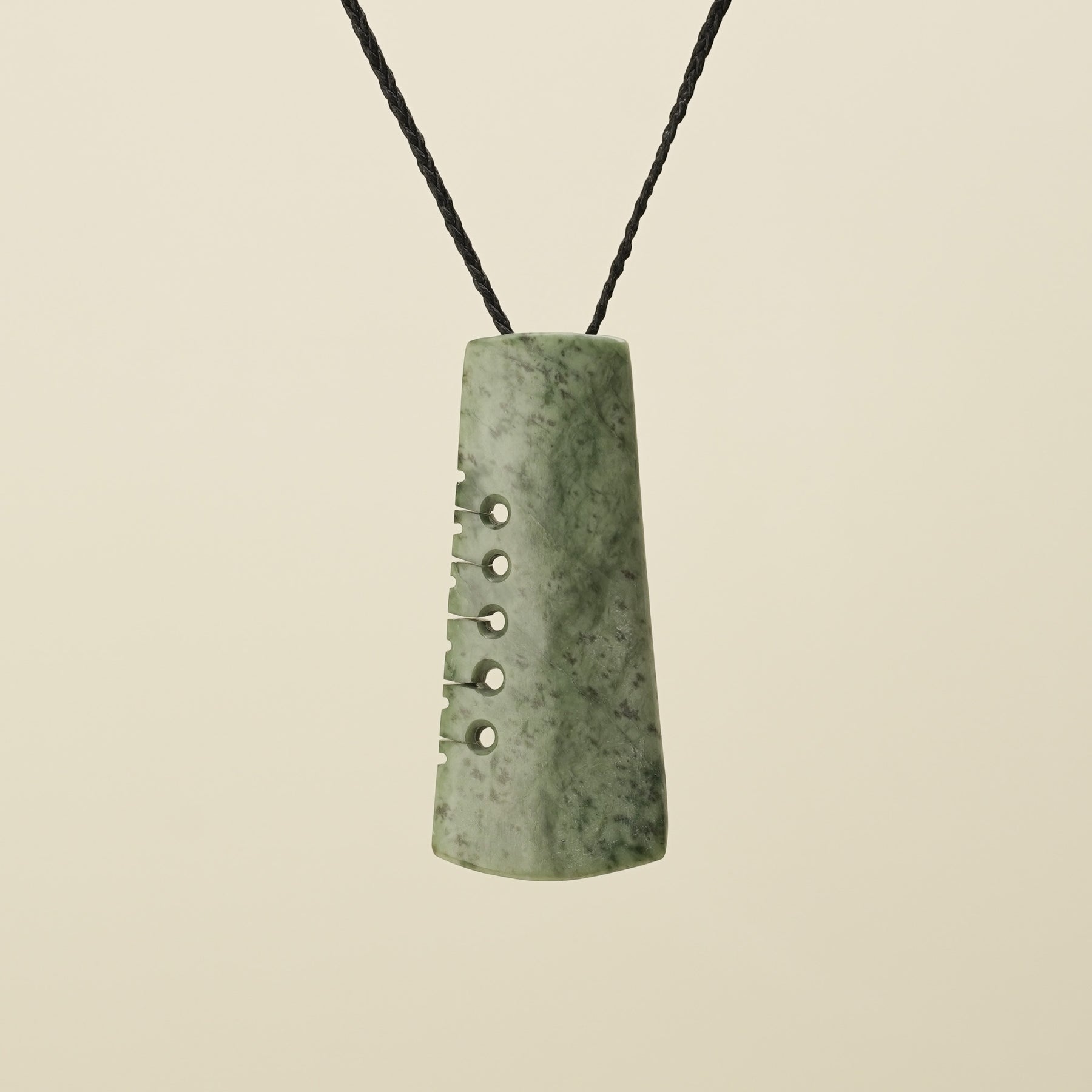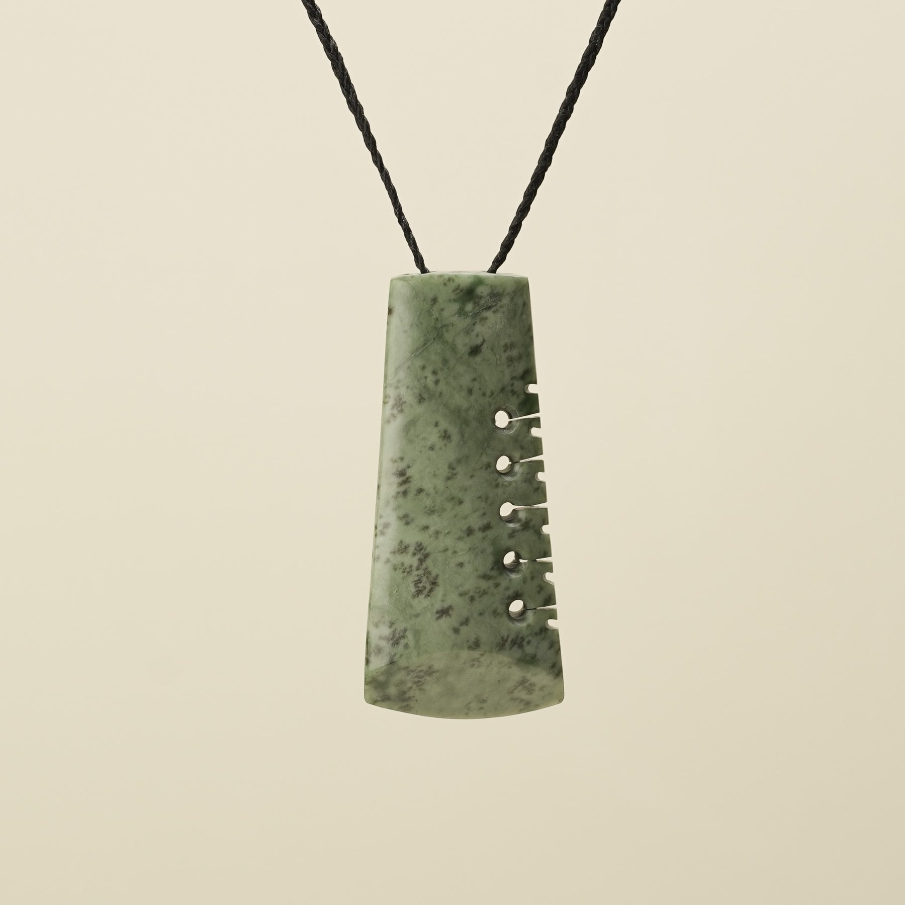 Carved from New Zealand's West Coast Kōkopu Pounamu, this large toki showcasing speckles of light brown and soft green hues. The Toki represents strength, focus, courage and determination. The intricately carved notches reflect traditional Māori carving, historically representing whakapapa (genealogy) and the passing of wisdom between generations. Today, these notches may also represent whānau members or loved ones, adding personal meaning to each pendant.