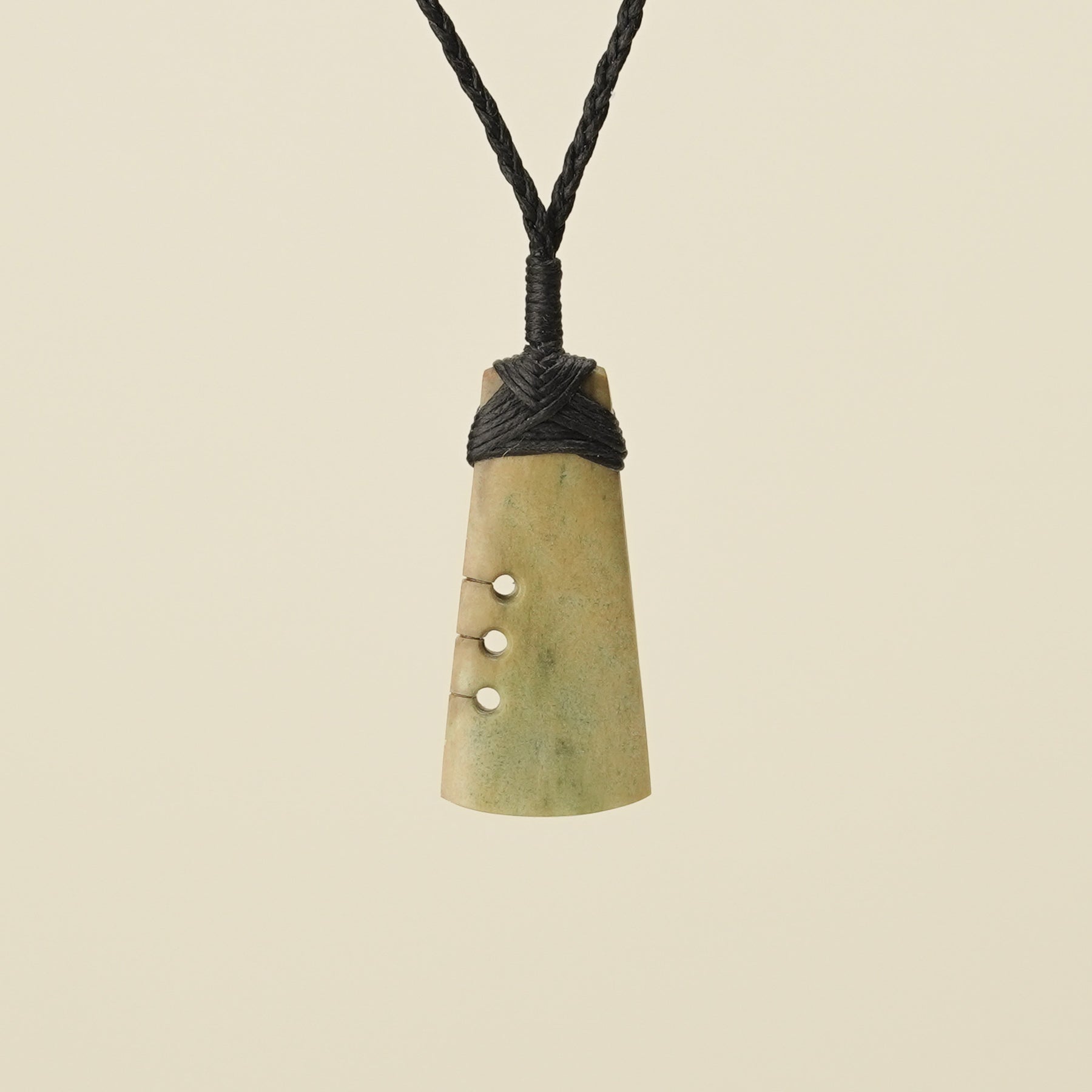 This extra small matte Toki pendant, carved from Raukaraka pounamu, showcases yellow tones woven through green hues, inspired by the native Karaka tree. Symbolising strength, determination, and bravery.