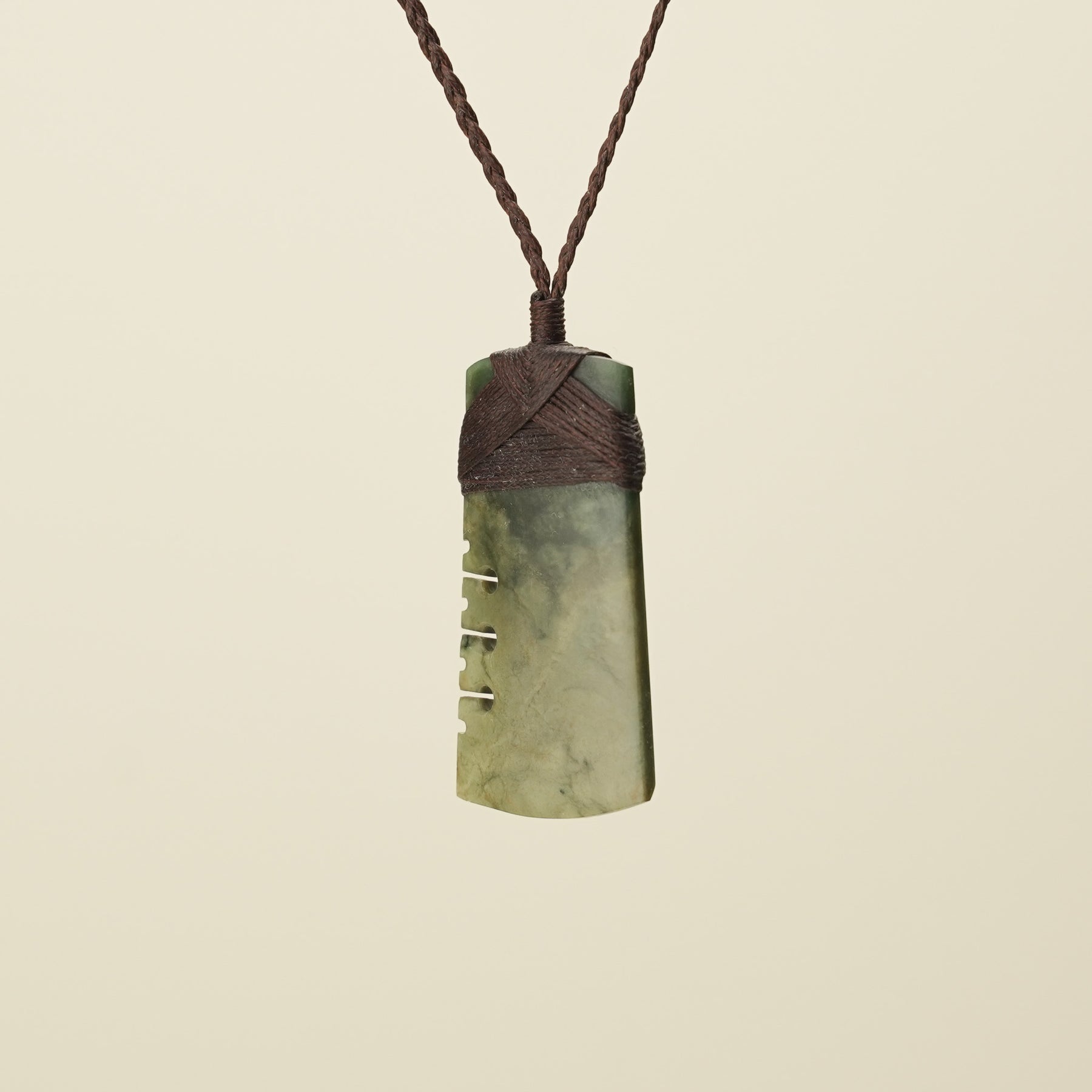 Notched Toki Raukaraka Medium Pounamu Pendant, Brown Binding