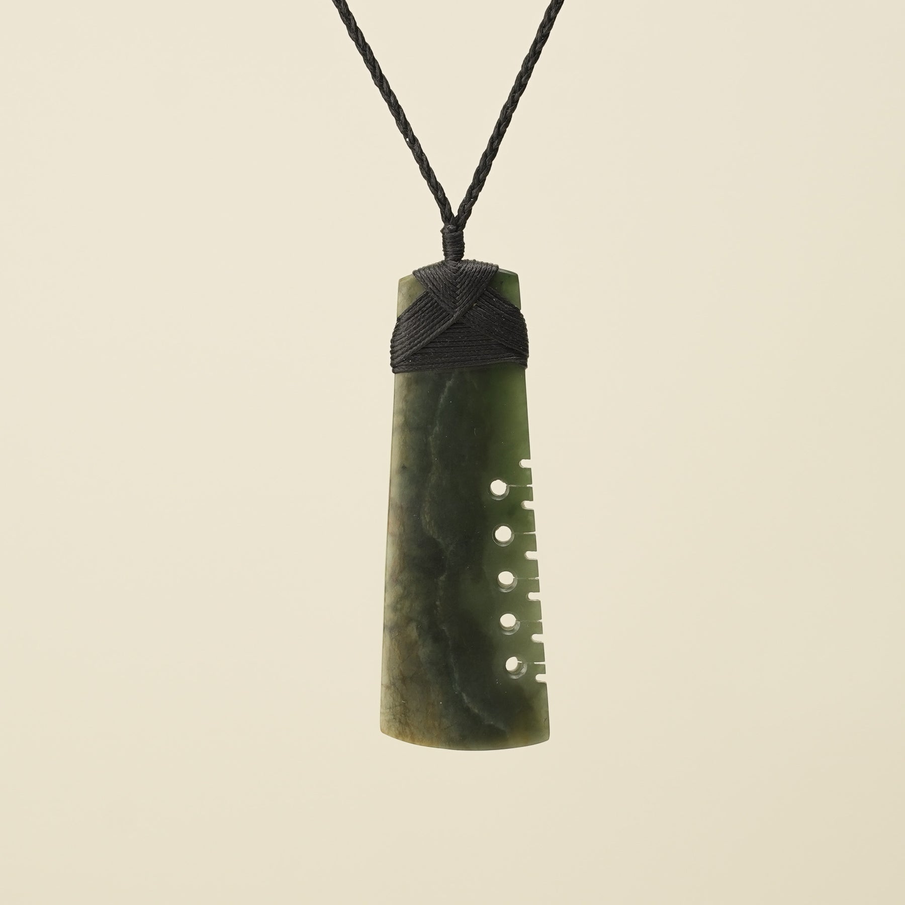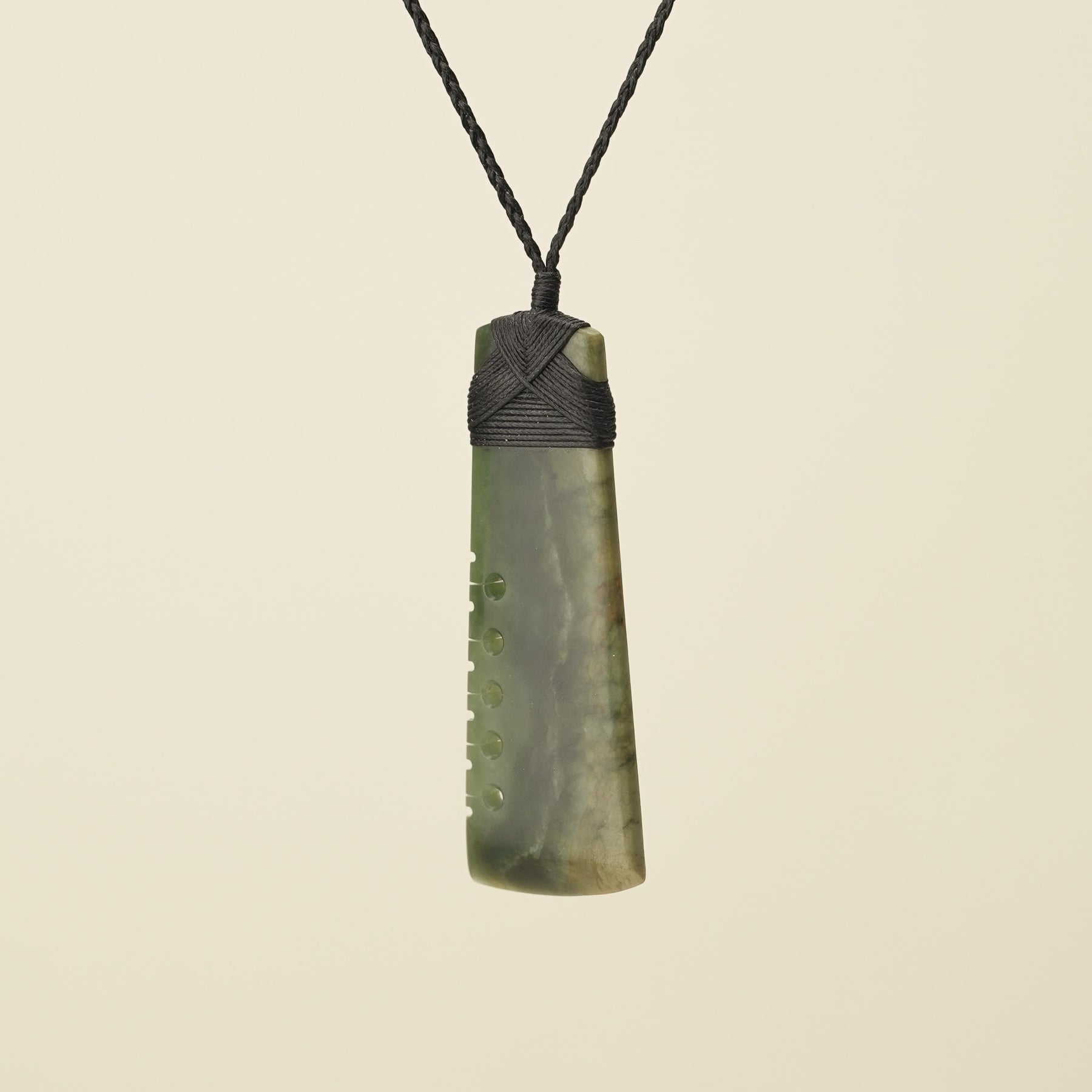 Notched Toki Raukaraka Pounamu Extra Large Pendant, Black Binding