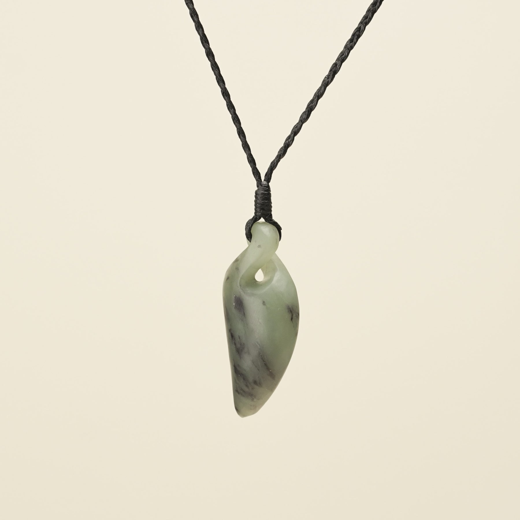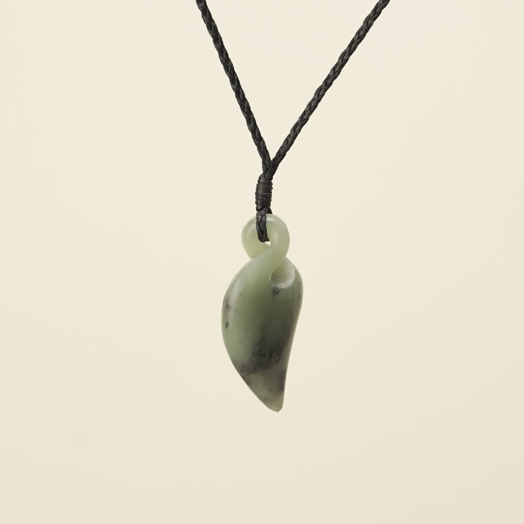Carved from New Zealand Inanga (pounamu), this small sized Pikorua pendant symbolises the intertwining of lives. The pendant features soft green tones with darker green marbling. The twist design represents connections of friendship, whānau, and aroha, celebrating the shared journey of individuals. It includes a handwoven black cord and is presented in an eco-friendly box with meaning cards that convey its cultural significance and care instructions.